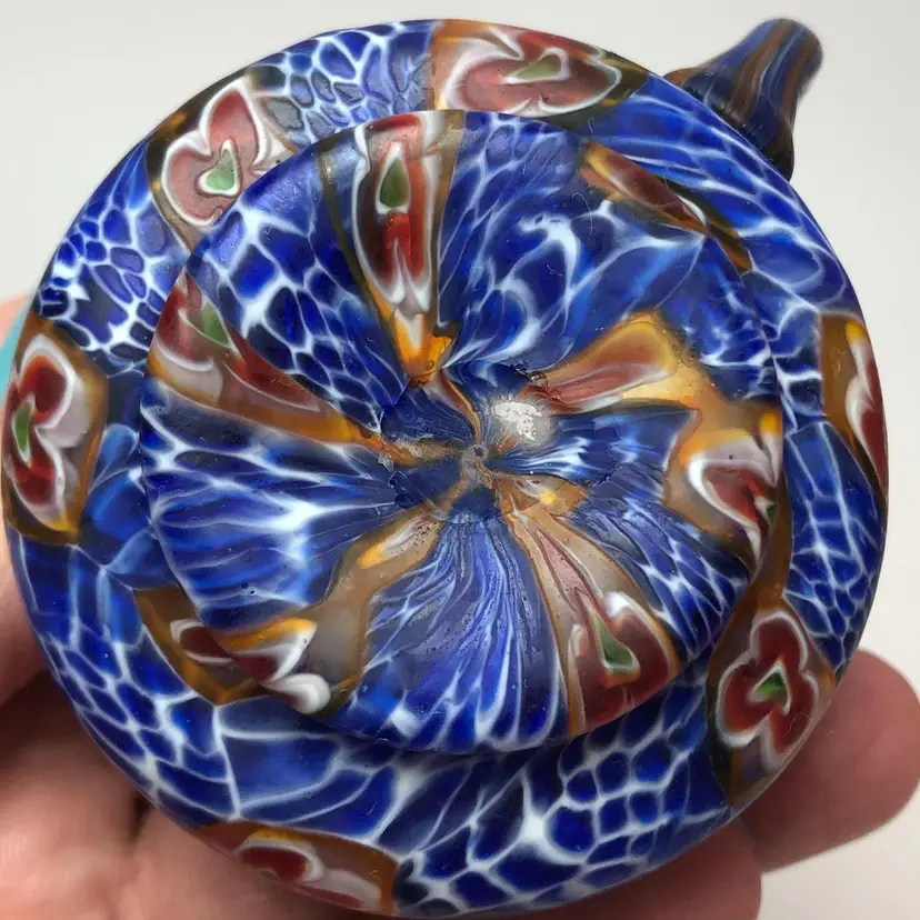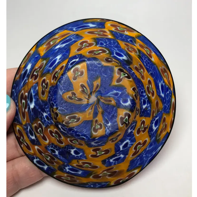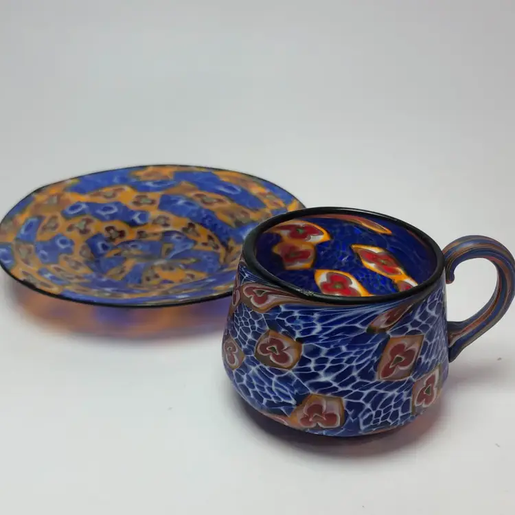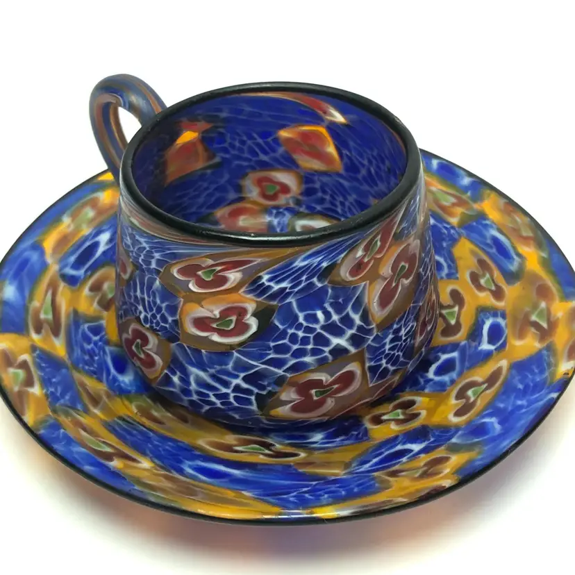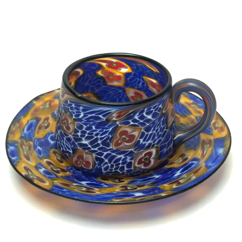 Vintage Italian Venetian Blown Glass Millefiori Demitasse Cup & Saucer Blue Amber Gold. Cup is about 2" tall x 2.5" diameter base. Saucer is 4.5" in diameter. Probably dates to the 1950s or so.