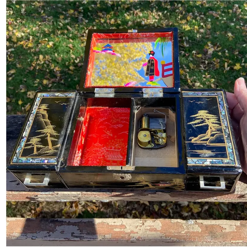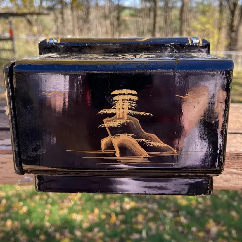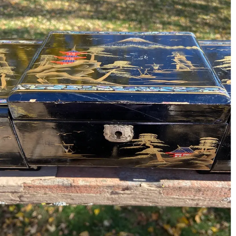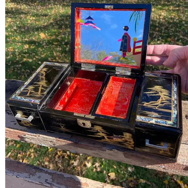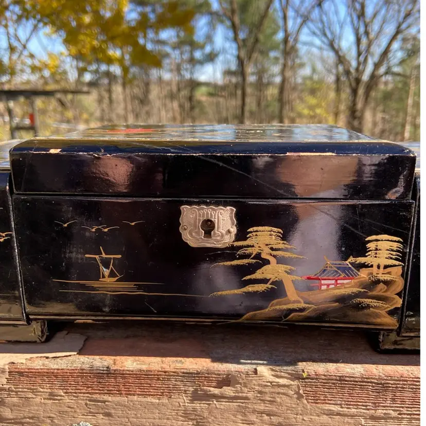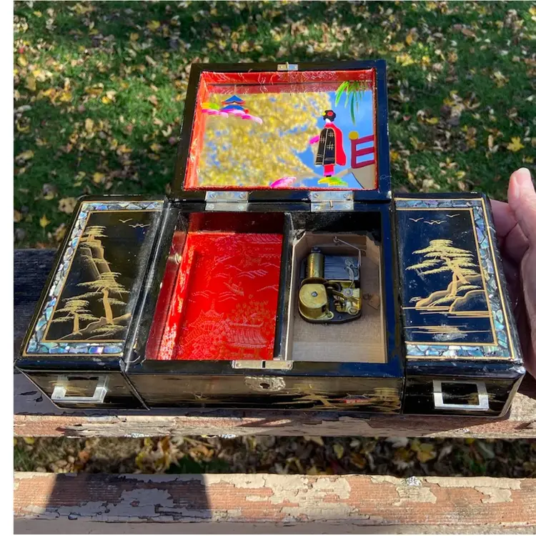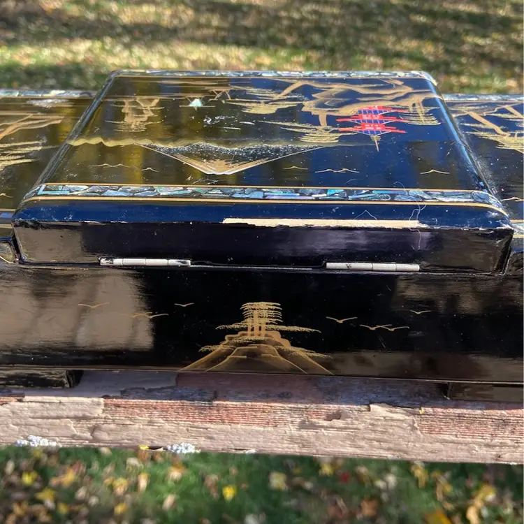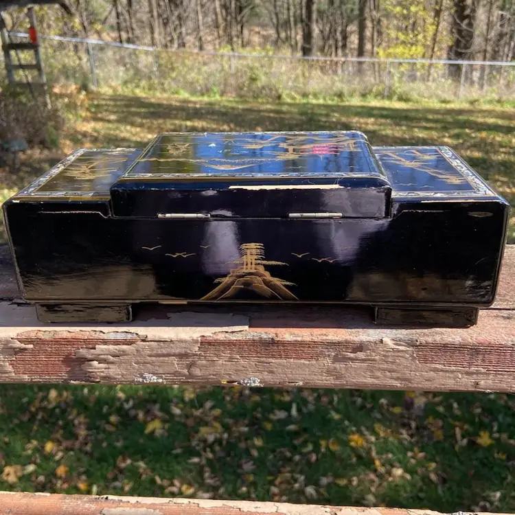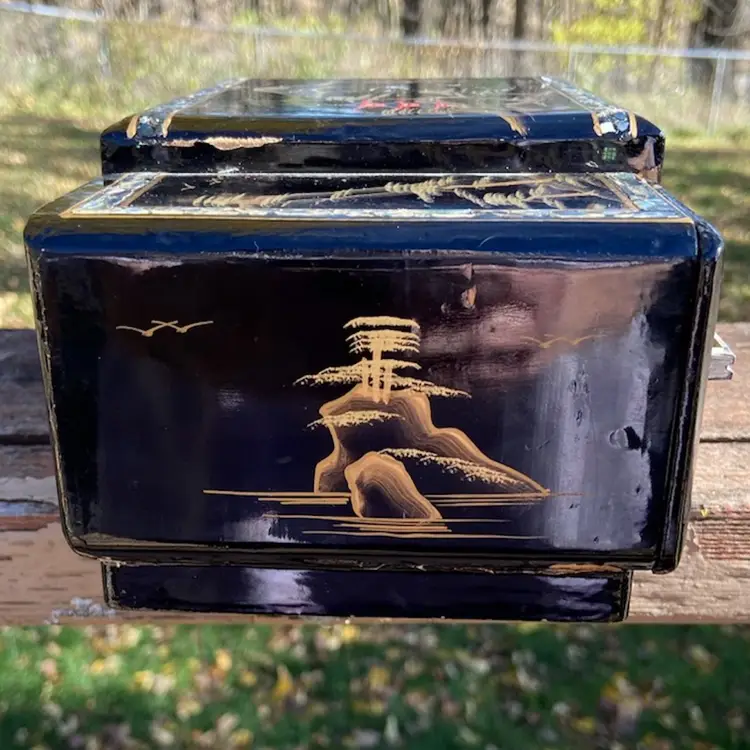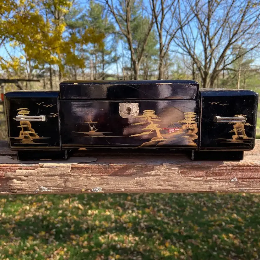 Approx: 11.5”w x 5.25”d (including handles) x 3.5”h. Pre-owned condition. Two drawers and center of top opens to two compartments. Some warped, cracked and chipped lacquer. Some sticker residue on top and bottom. Needs a cleaning. See all images as part of description.
