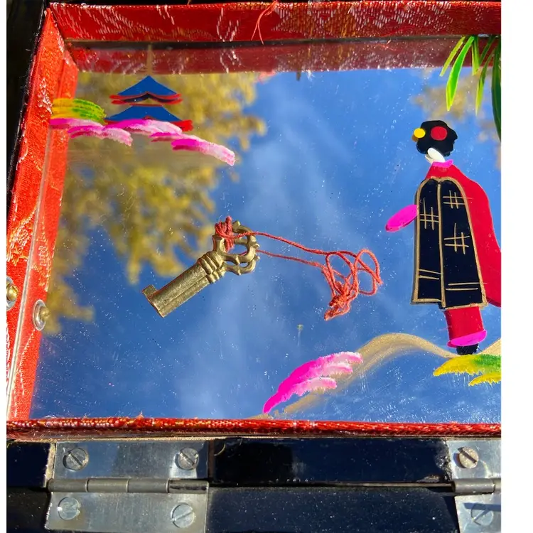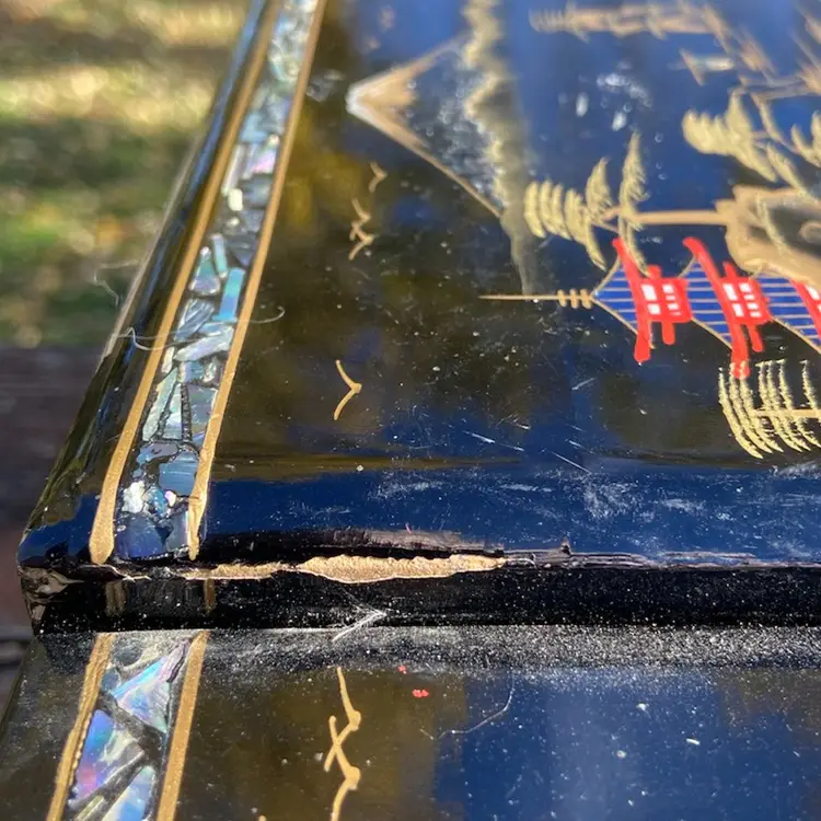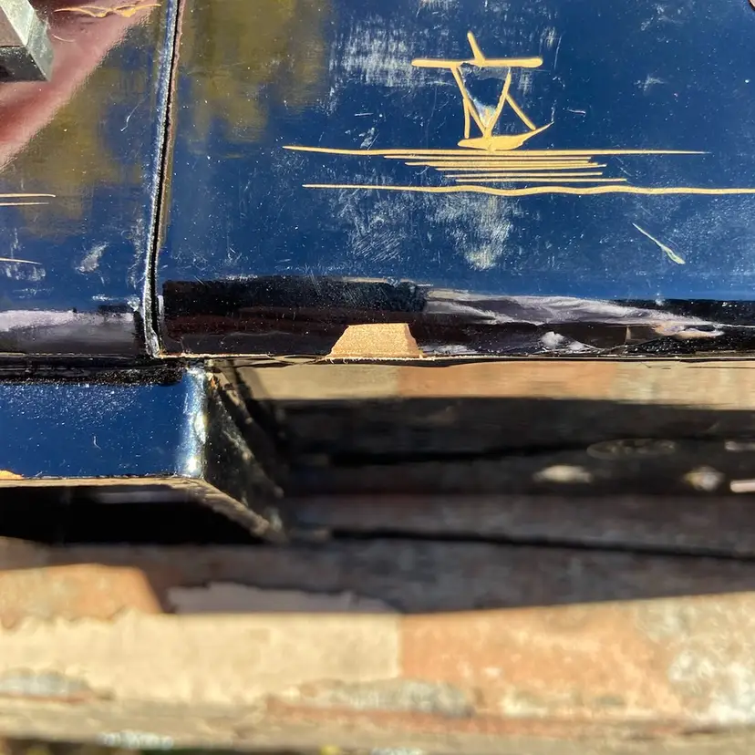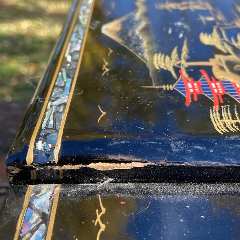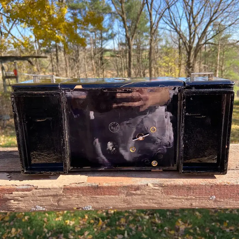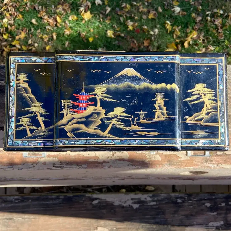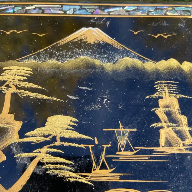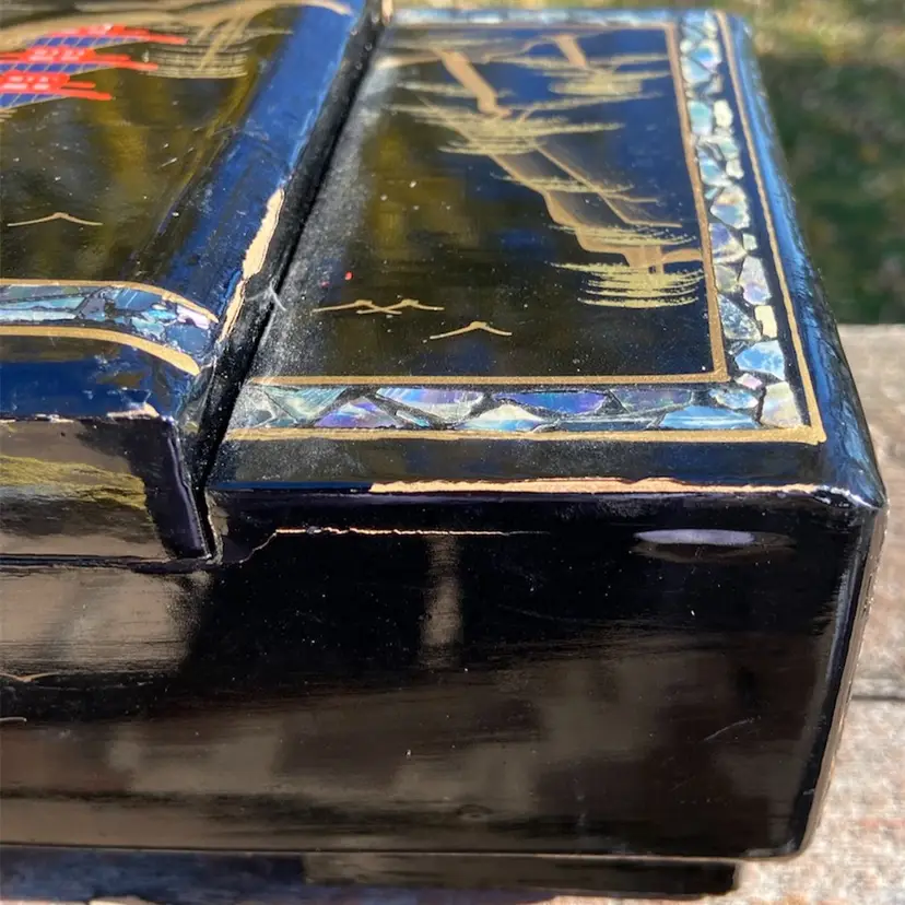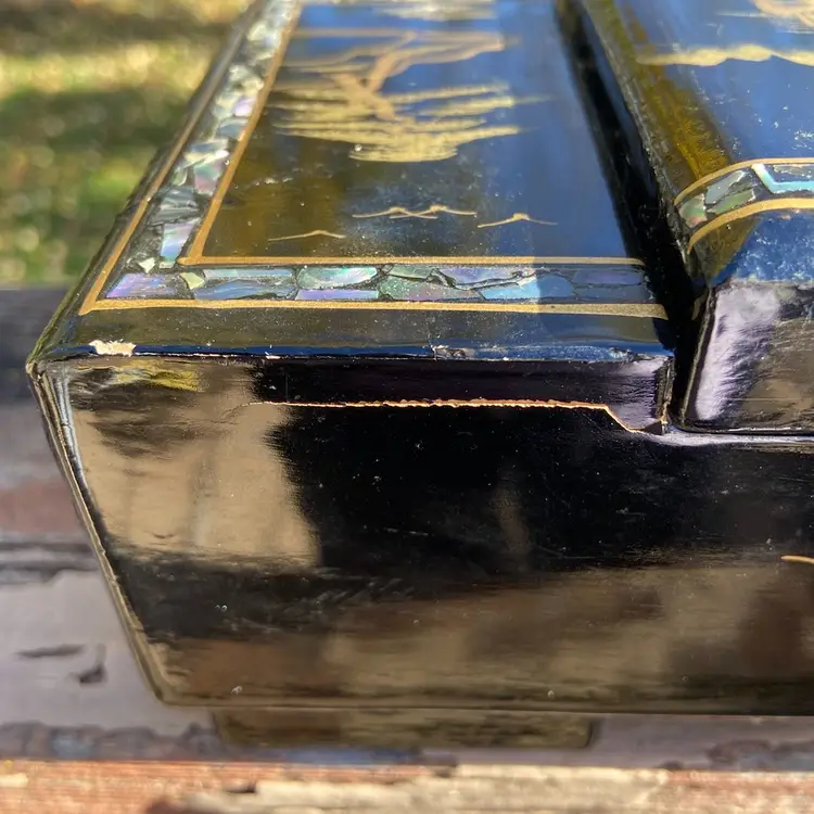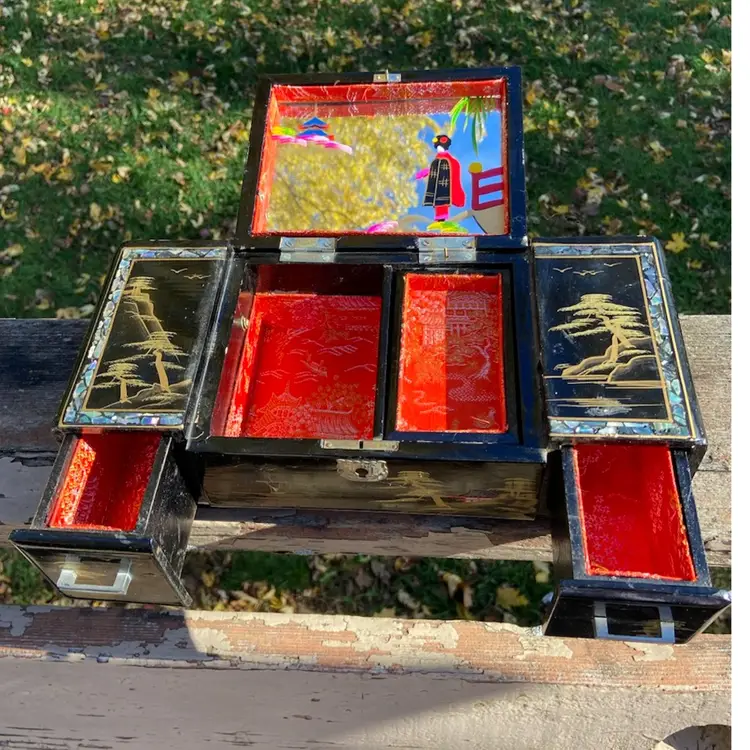 Approx: 11.5”w x 5.25”d (including handles) x 3.5”h. Pre-owned condition. Two drawers and center of top opens to two compartments. Some warped, cracked and chipped lacquer. Some sticker residue on top and bottom. Needs a cleaning. See all images as part of description.