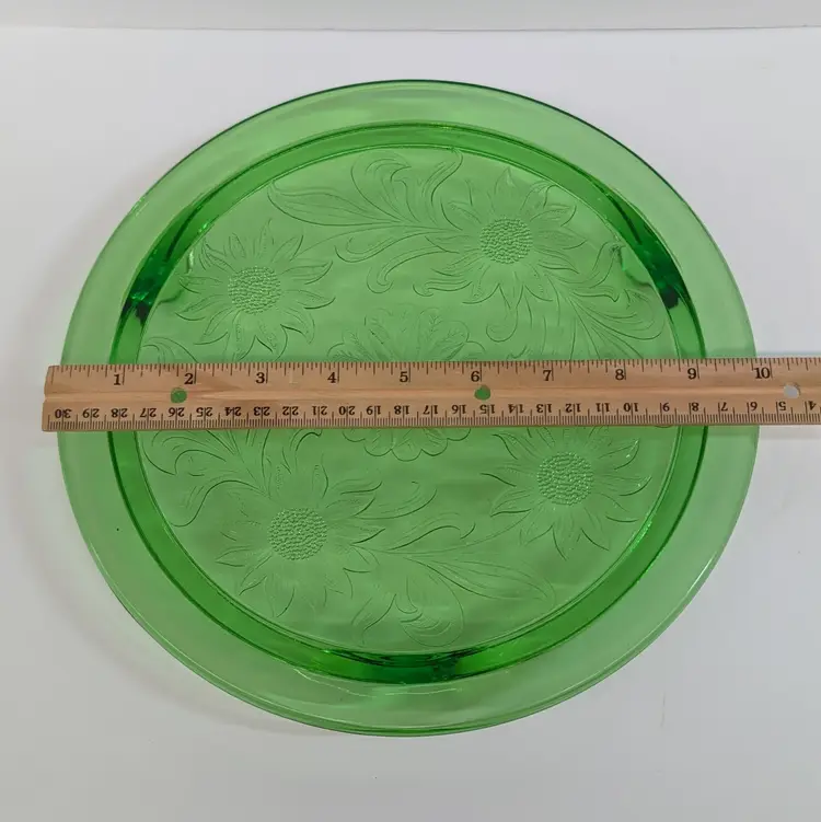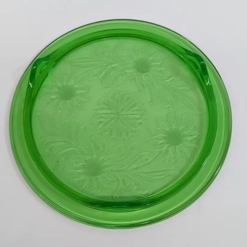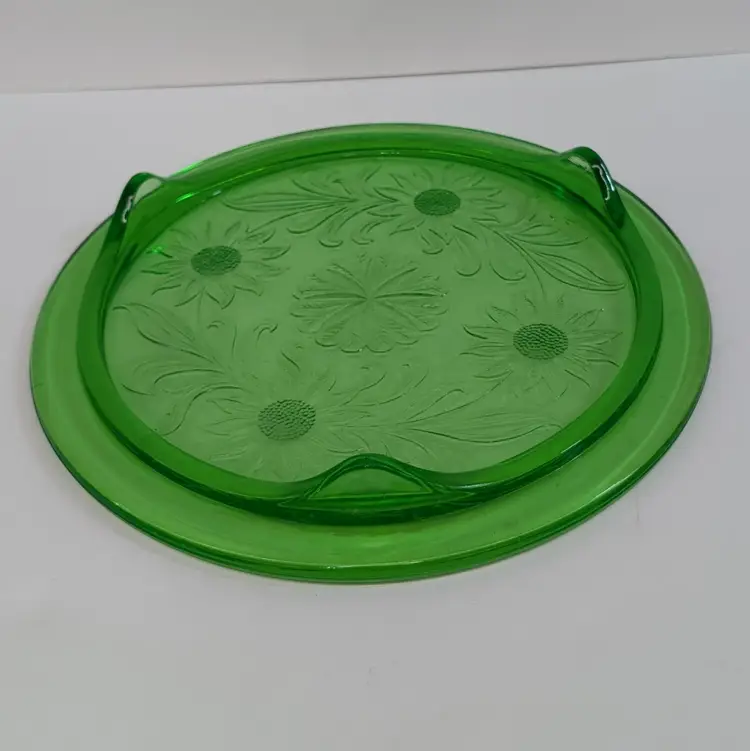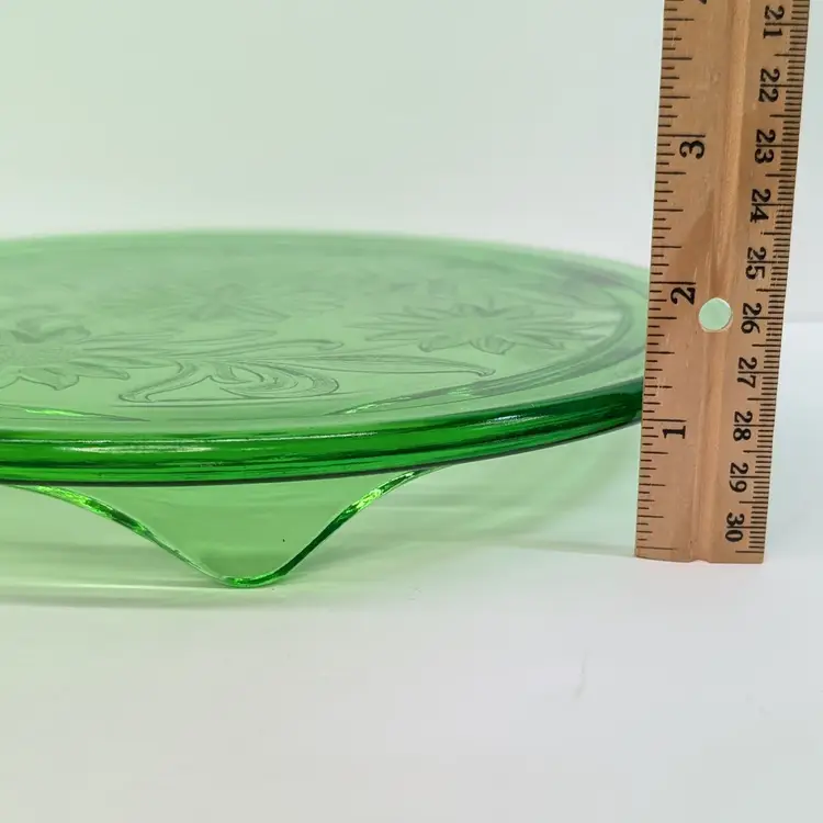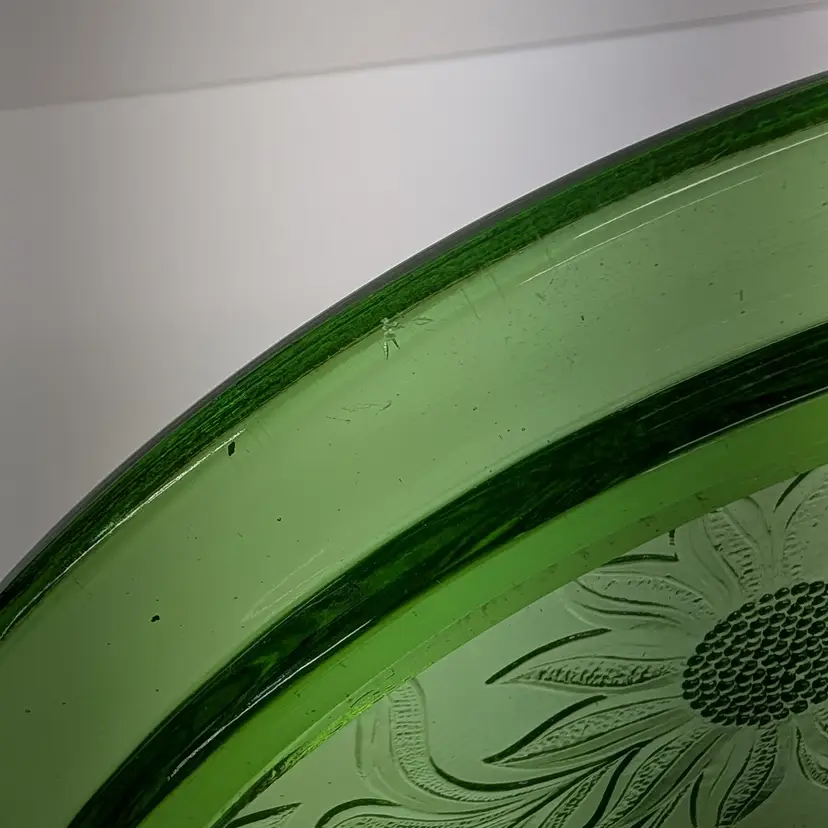 Lovely, green glass cake plate with three feet and a sunflower design. It is in nice, used condition with one flea bite/scratch on the edge (see picture). Measurements ~ 10 x 1.25"