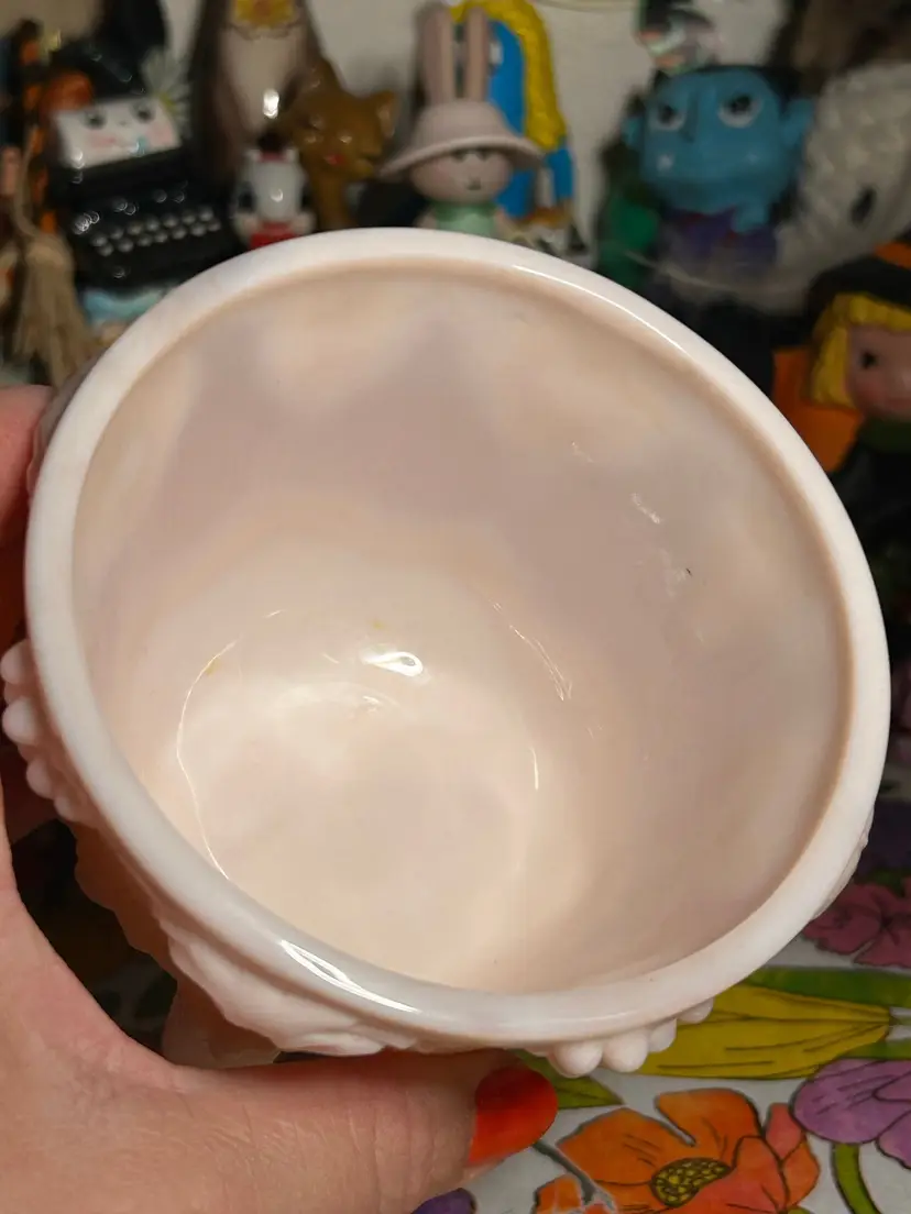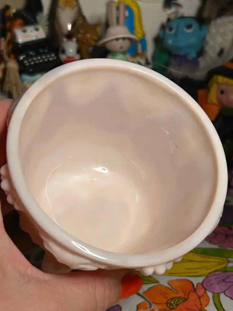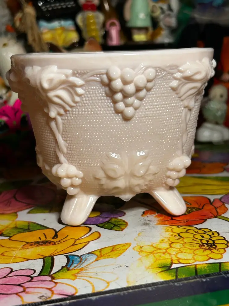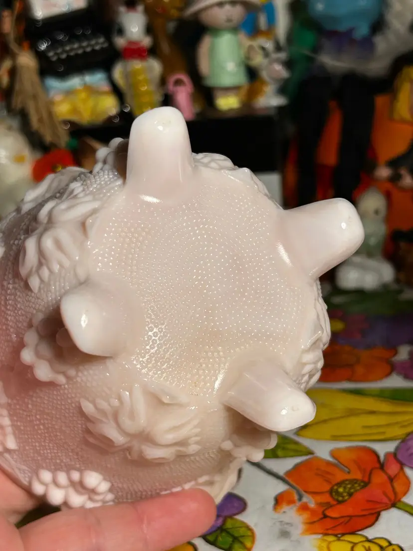 For sale! Vintage Jeanette Pink Milk Glass Bowl with Grapes. Wonderful condition 3.5 inches wide. 4 inches across top