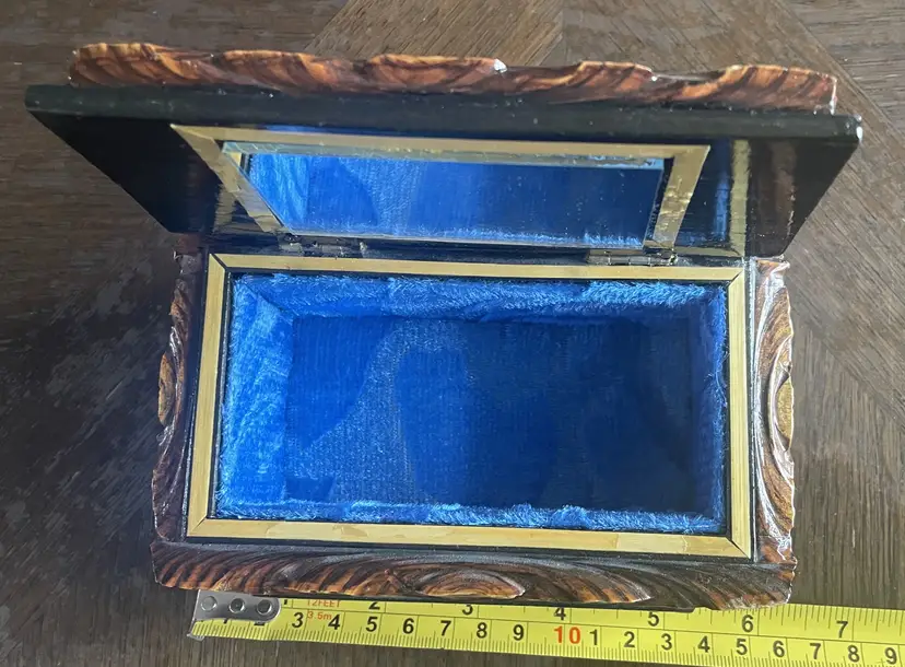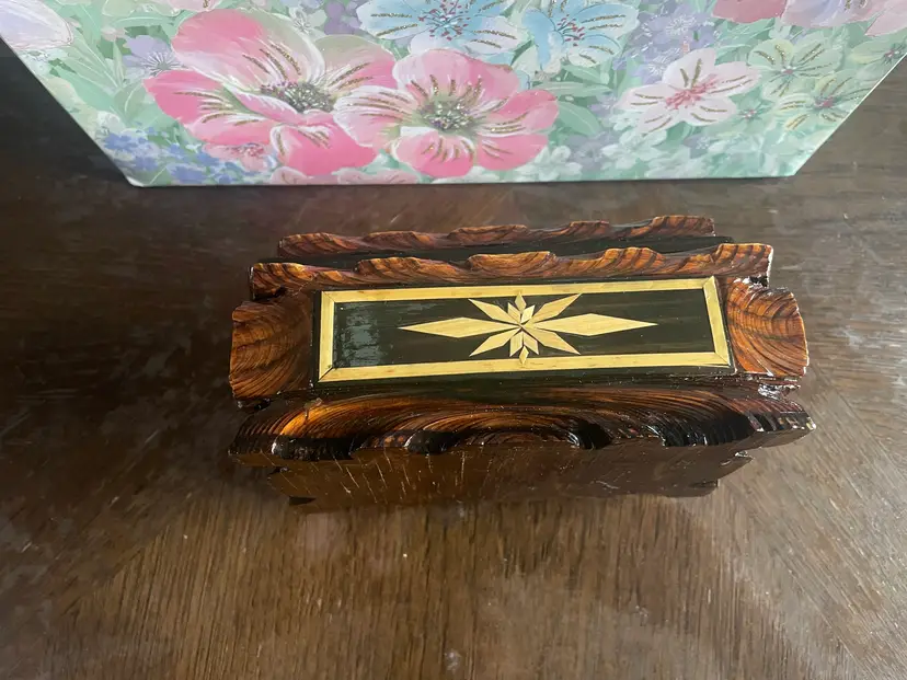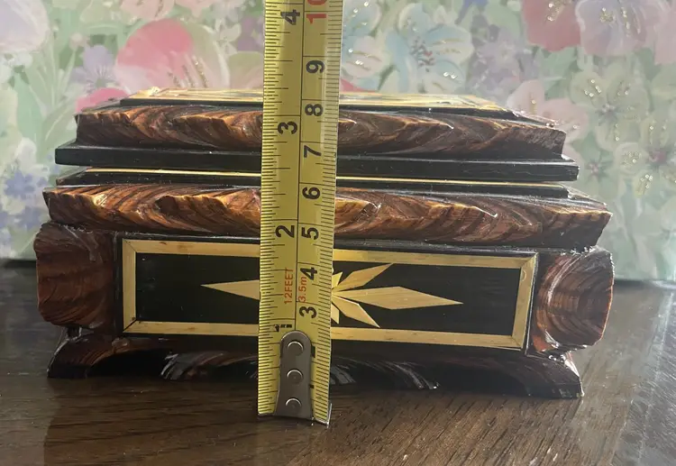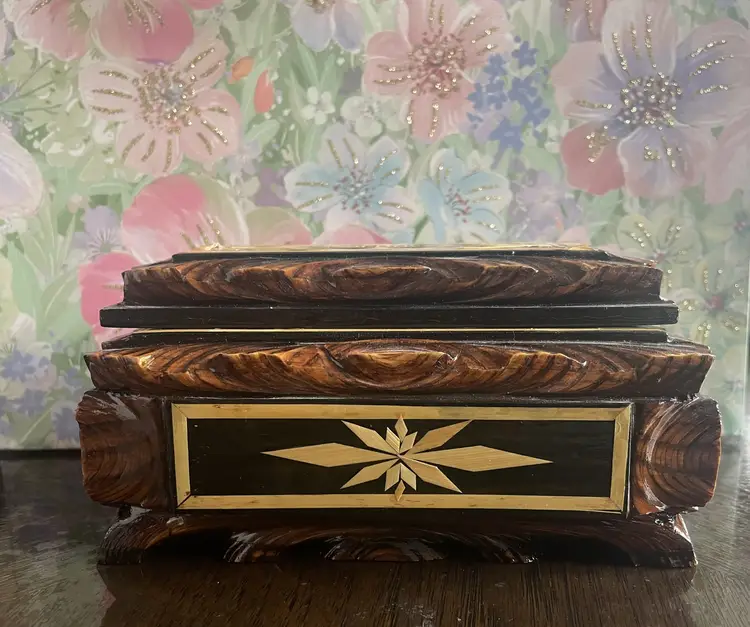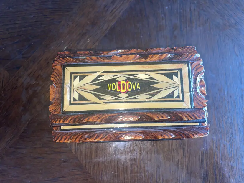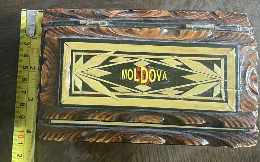 This is a vintage jewelry hand carved wood box with a hinged top made in Moldova.