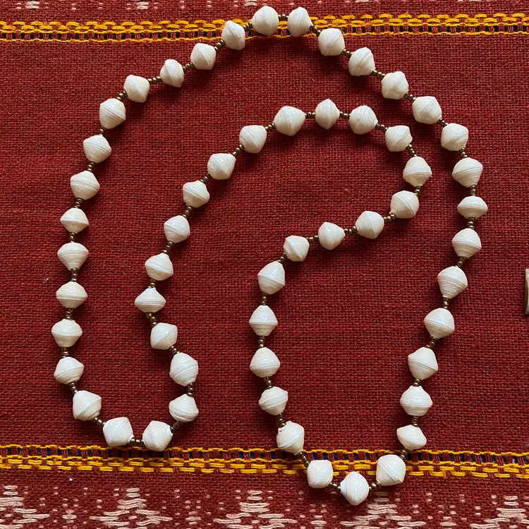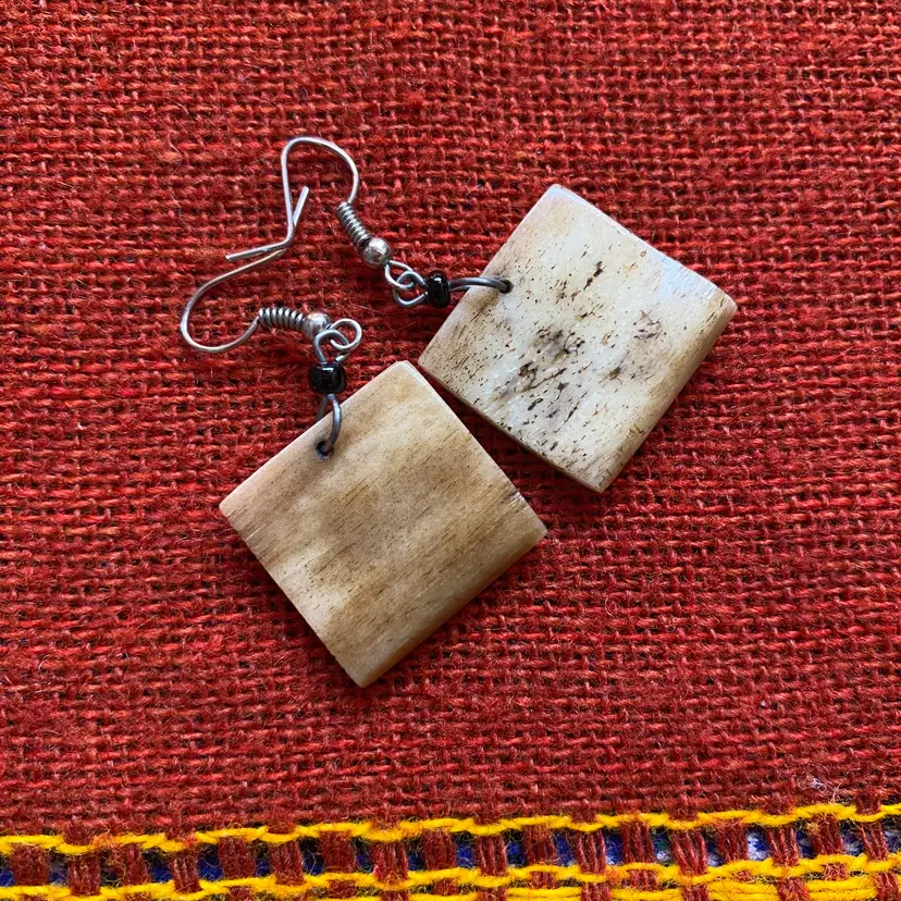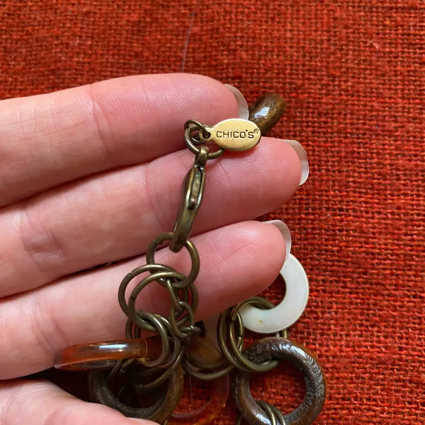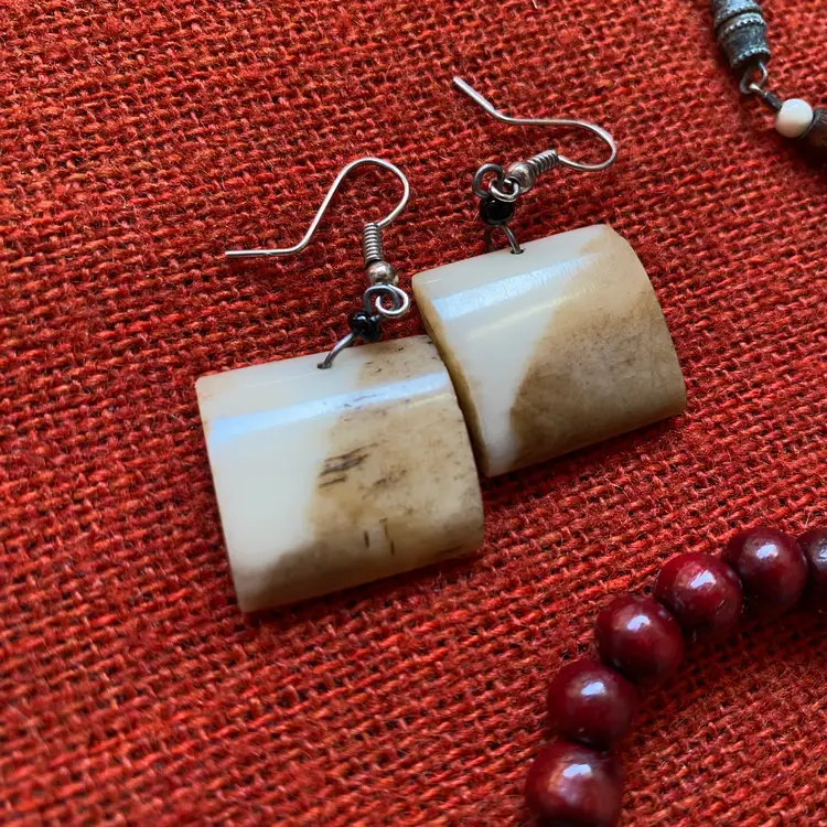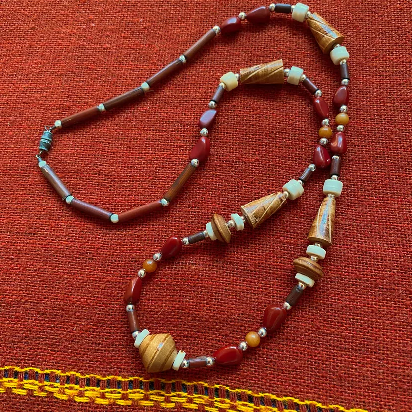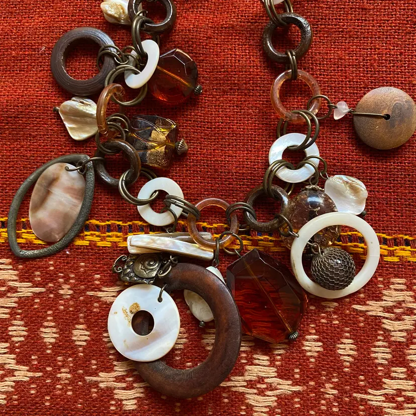 Bundle of vintage jewelry pieces: Three necklaces, a stretch bracelet and a pair of pierced earrings. They're made of many organic materials including wood, mother of pearl, paper, glass and maybe bone. The earrings look like bone but could be a resin fake. The ivory beaded necklace is made of hand rolled paper beads. The chunky necklace is Chico's and has a ton of interesting charms and rings. The wood bead bracelet is stretchy. Happy to provide measurements or answer any questions. Thanks for looking!