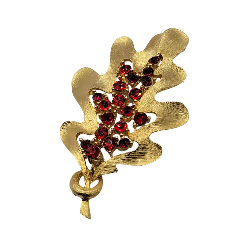 This vintage brooch features a detailed oak leaf design adorned with vibrant red rhinestones. A charming piece to add elegance to your collection.