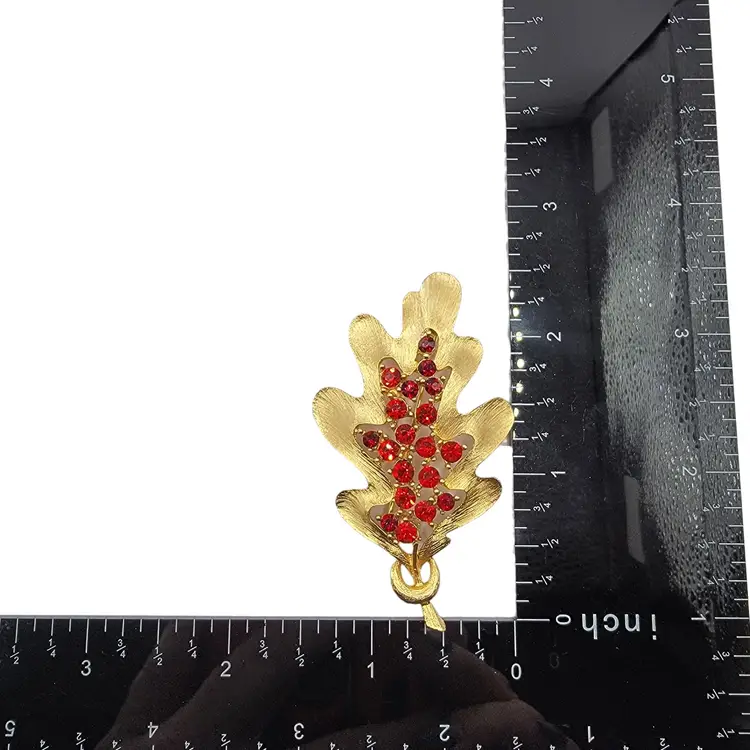 • Gold tone finish • Red rhinestones • Oak leaf design • Pin closure