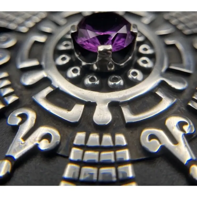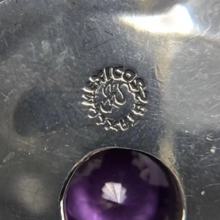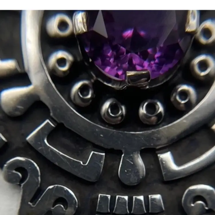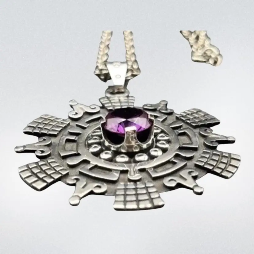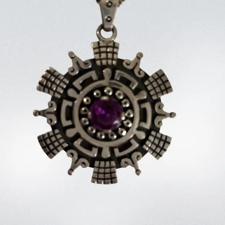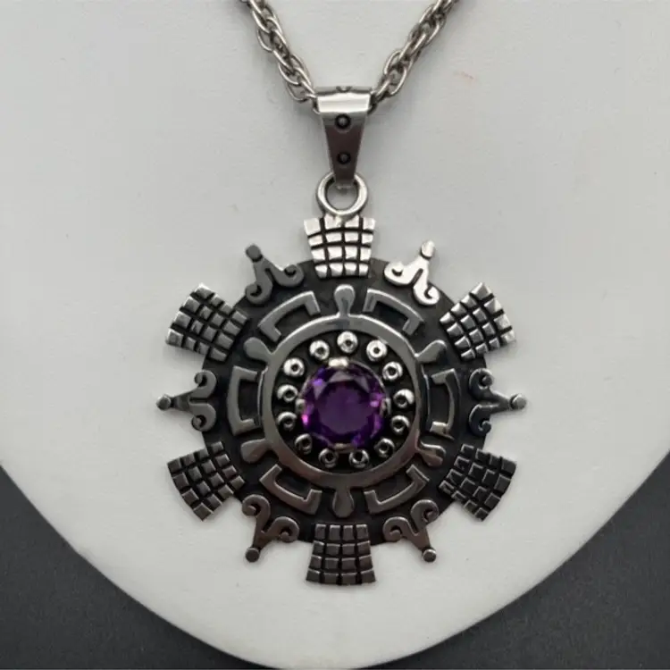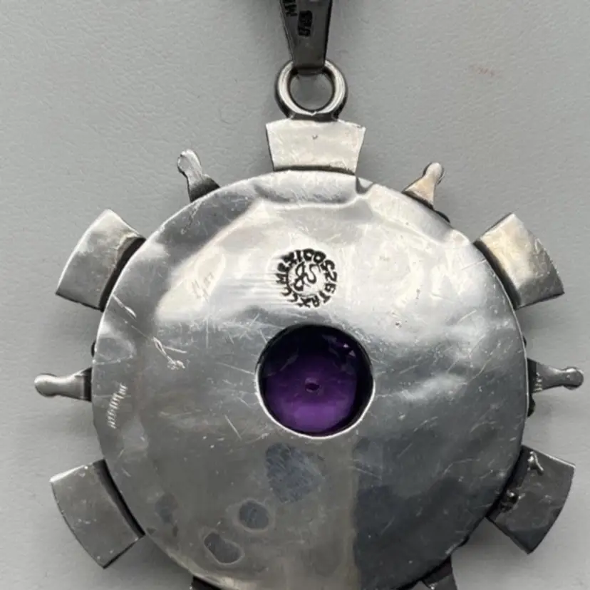 Vintage JS J.Sotelo 925 Sterling Silver Pendant With Large Amethyst Center Stone Pendant 2.25” diameter Has artist markings Handmade In excellent preowned condition Comes with a silver tone chain (Necklace chain is not sterling silver) Please see pictures for more detail Thanks for looking🌸