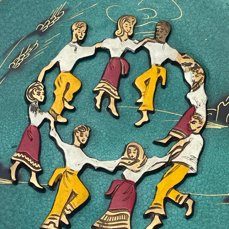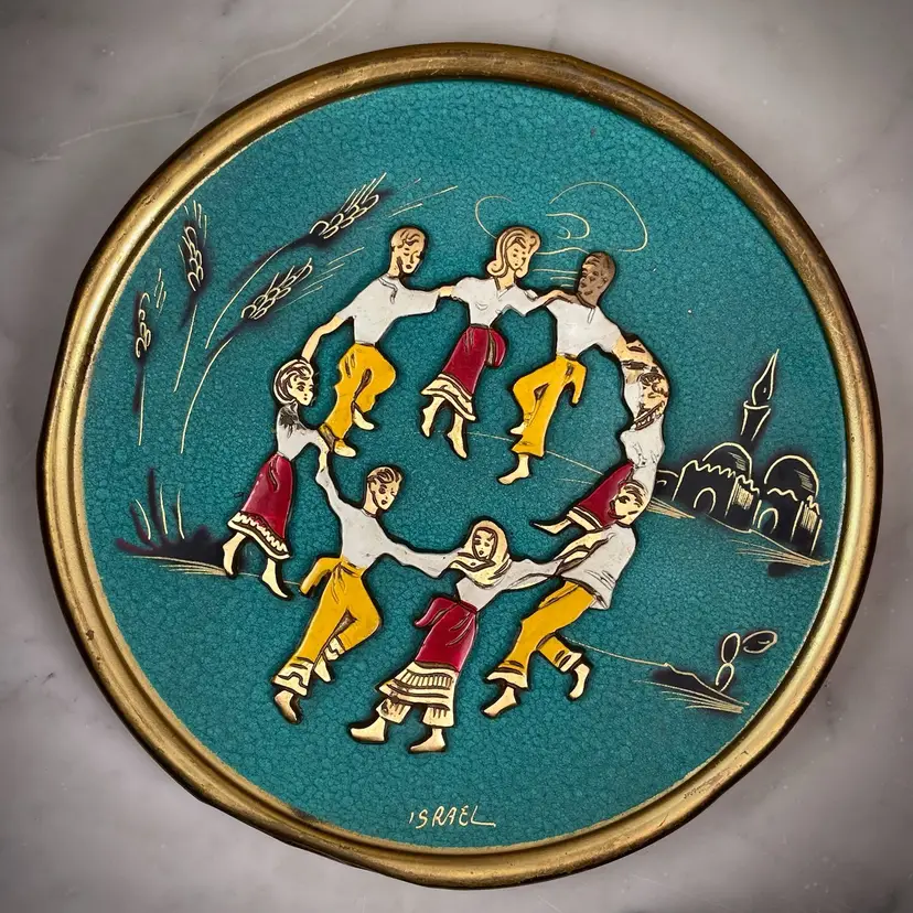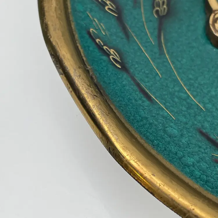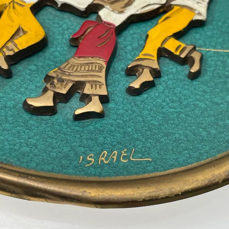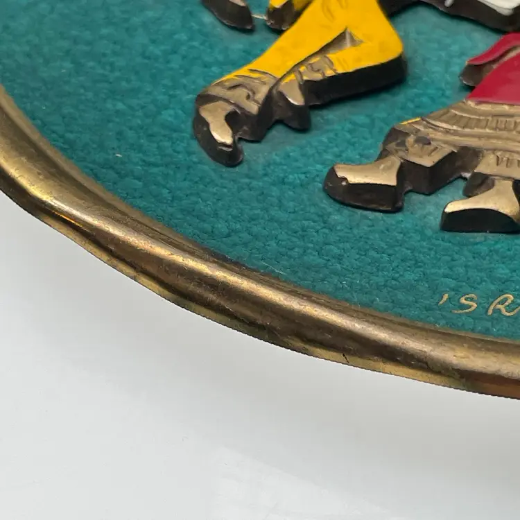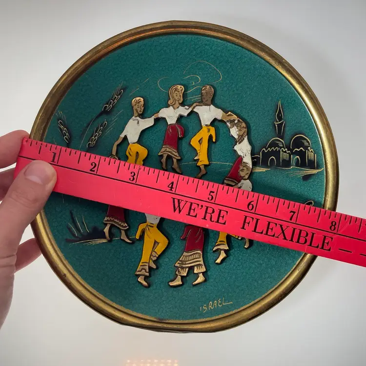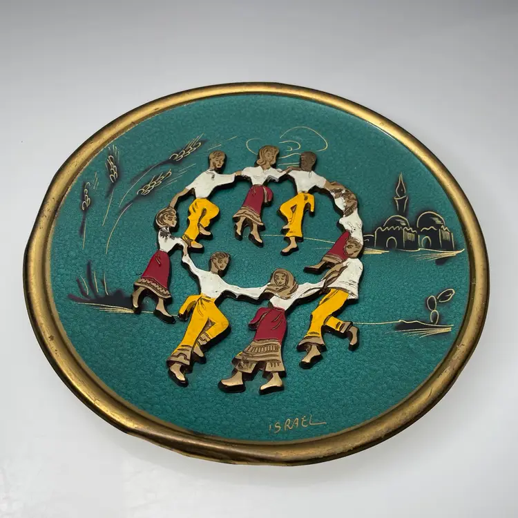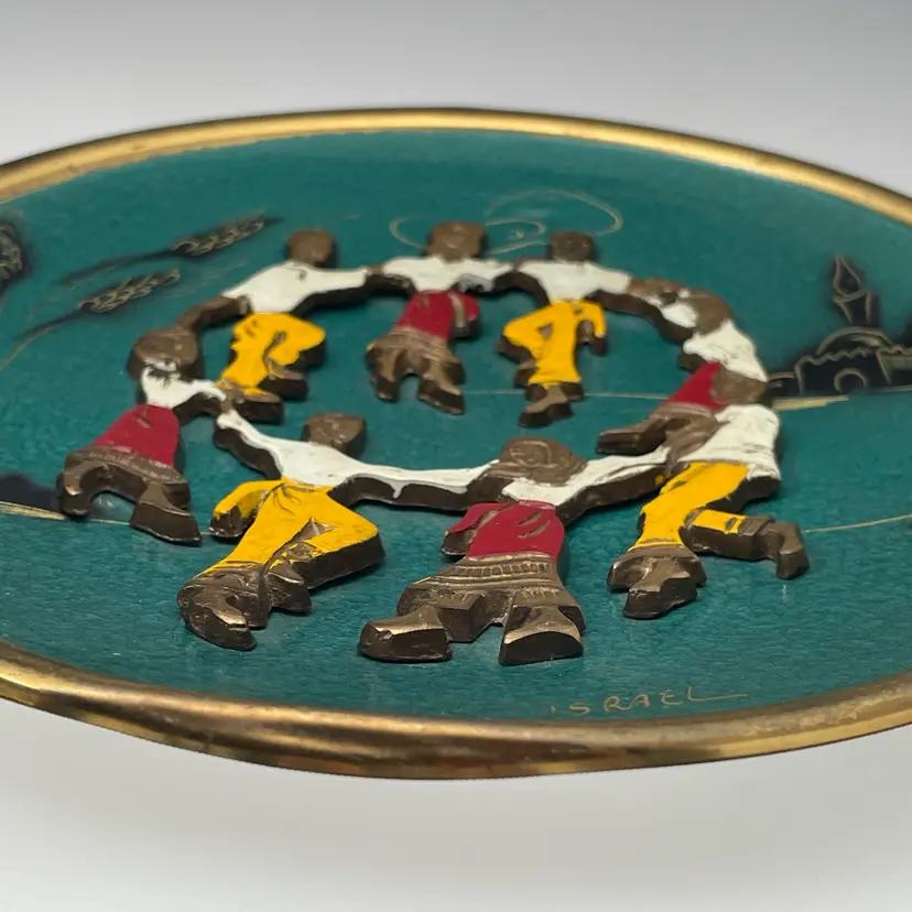 Good Preowned - visible wear and/or minor flaws present. Rim of plate is bent in 2 places, pictured. Some color loss on the dancers & nicks to blue enamel, as well as color loss on the back of dish.