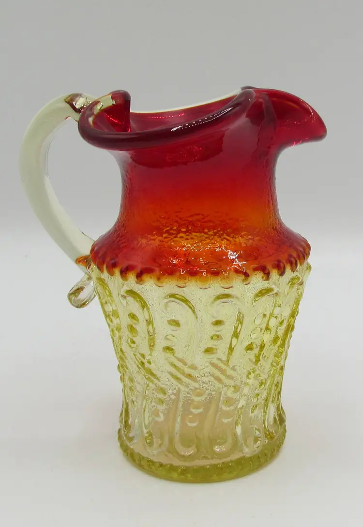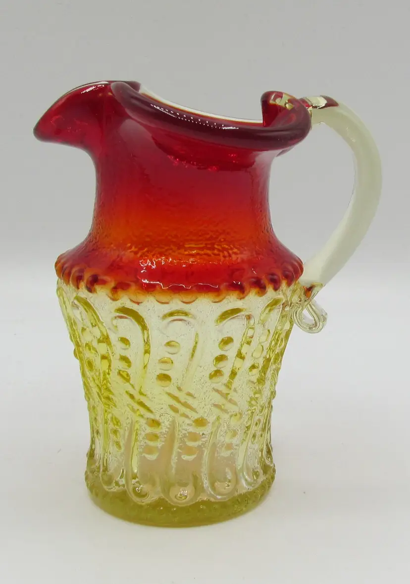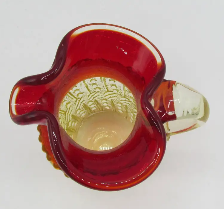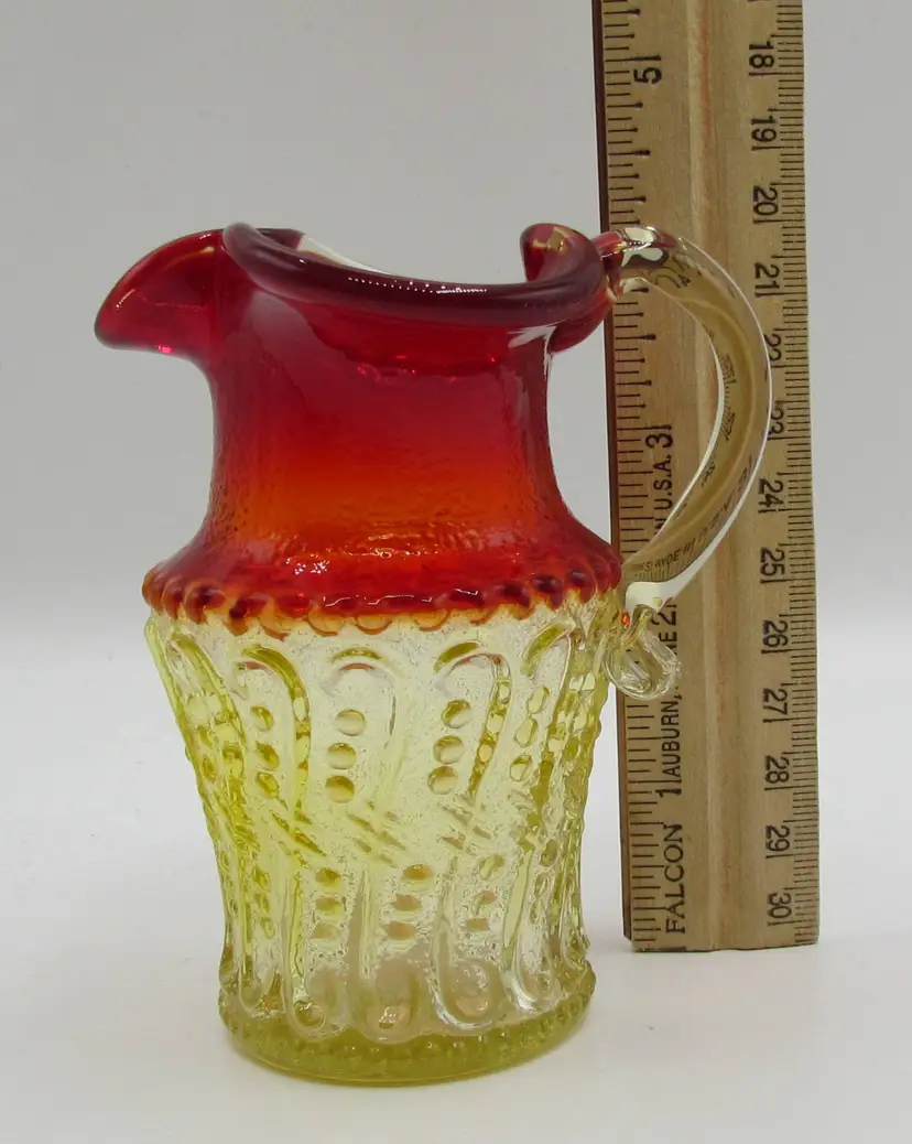 This vintage Kanawha Glass Amberina creamer mini pitcher features a beautiful combination of red and yellow amberina hues that give it a unique and eye-catching appearance. There are no chips or cracks and the measurement is in the photos. No chips or Cracks One of the most distinctive features of this creamer is that it glows under blacklight.