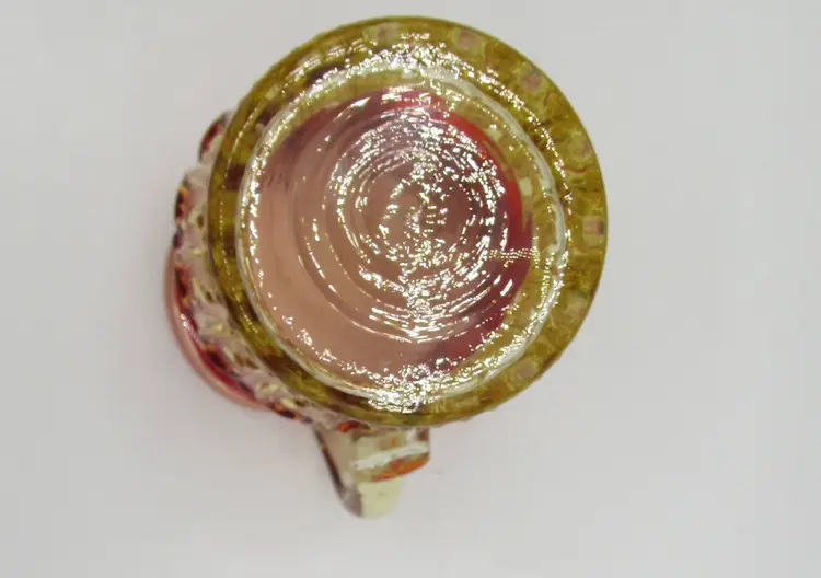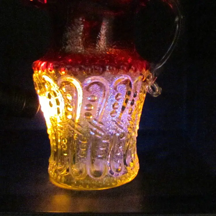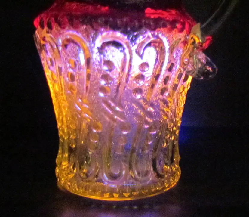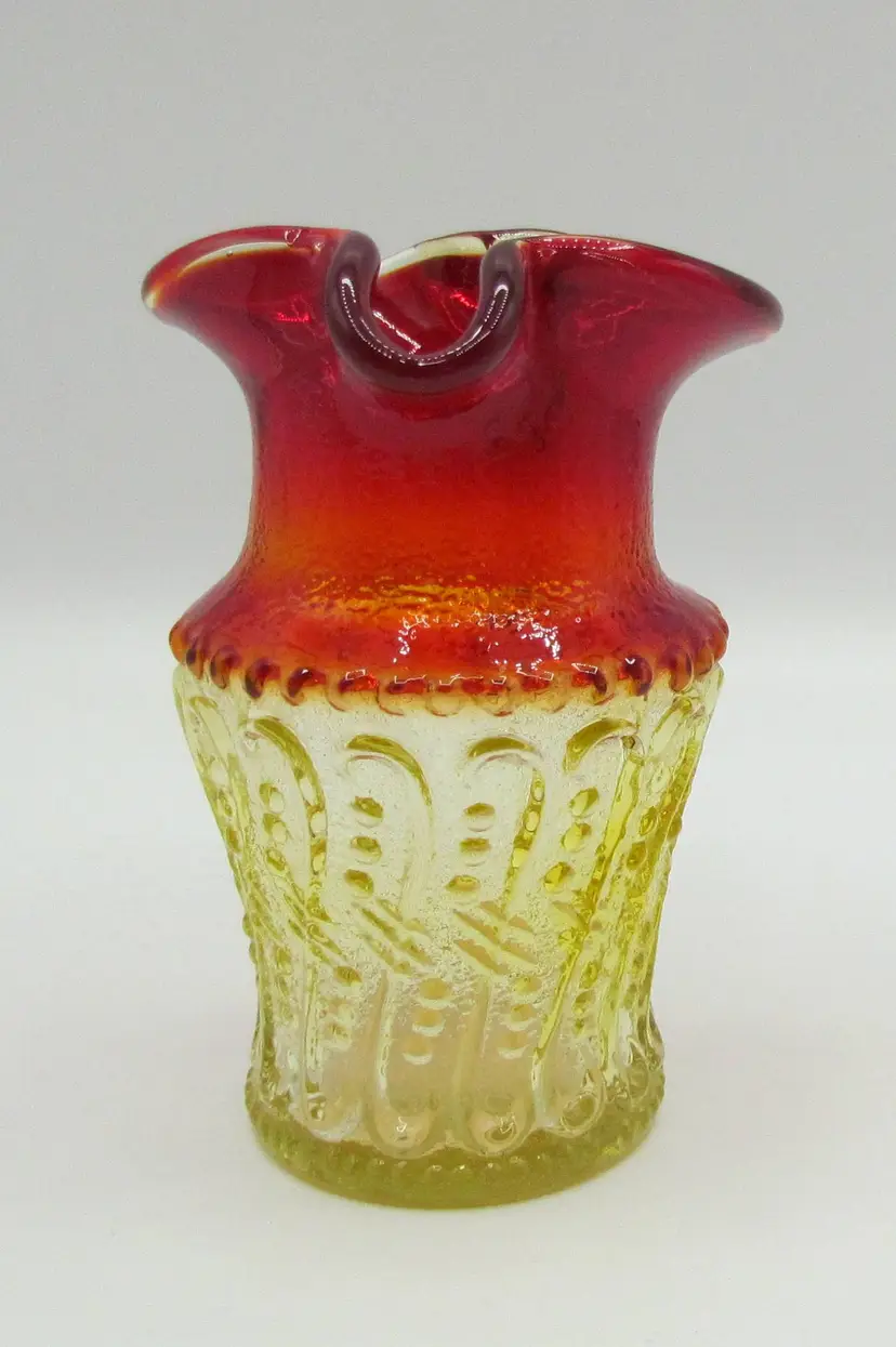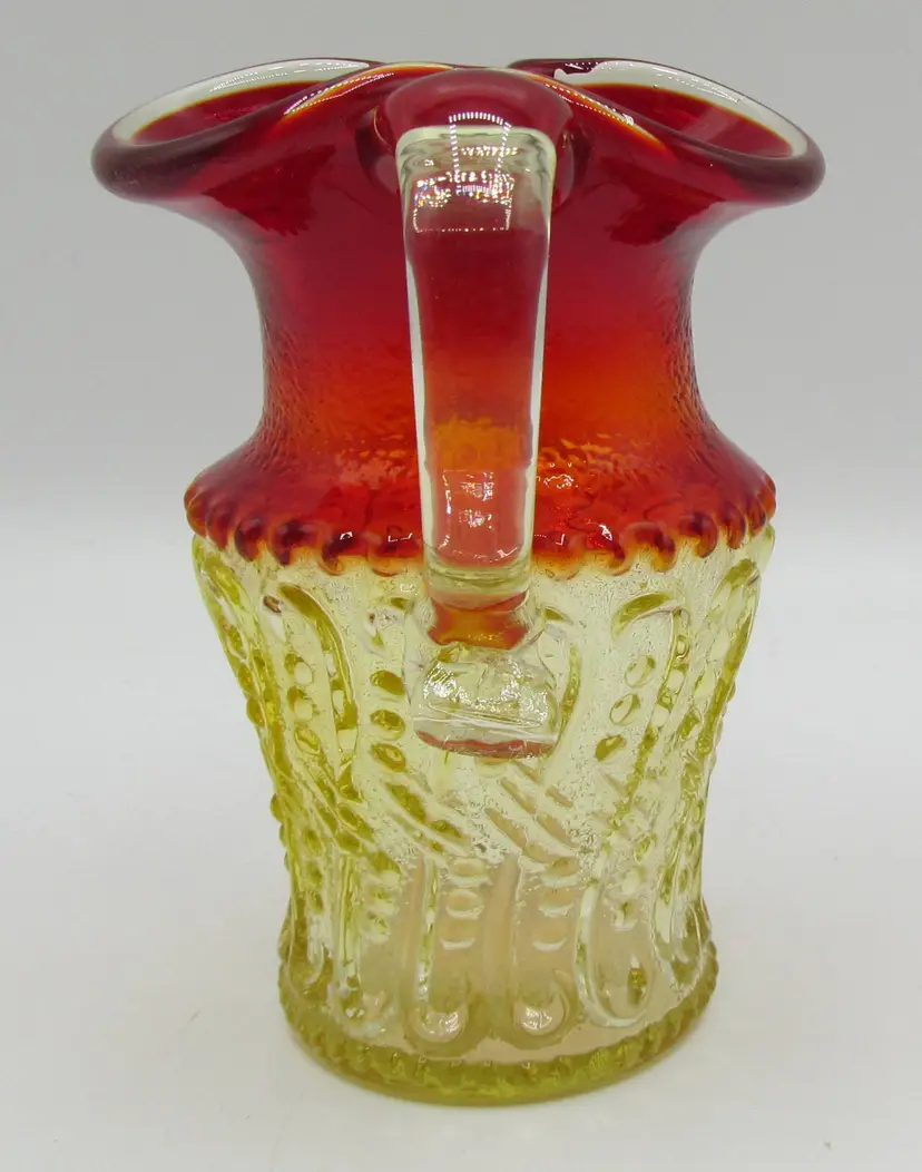 This vintage Kanawha Glass Amberina creamer mini pitcher features a beautiful combination of red and yellow amberina hues that give it a unique and eye-catching appearance. There are no chips or cracks and the measurement is in the photos. No chips or Cracks One of the most distinctive features of this creamer is that it glows under blacklight.