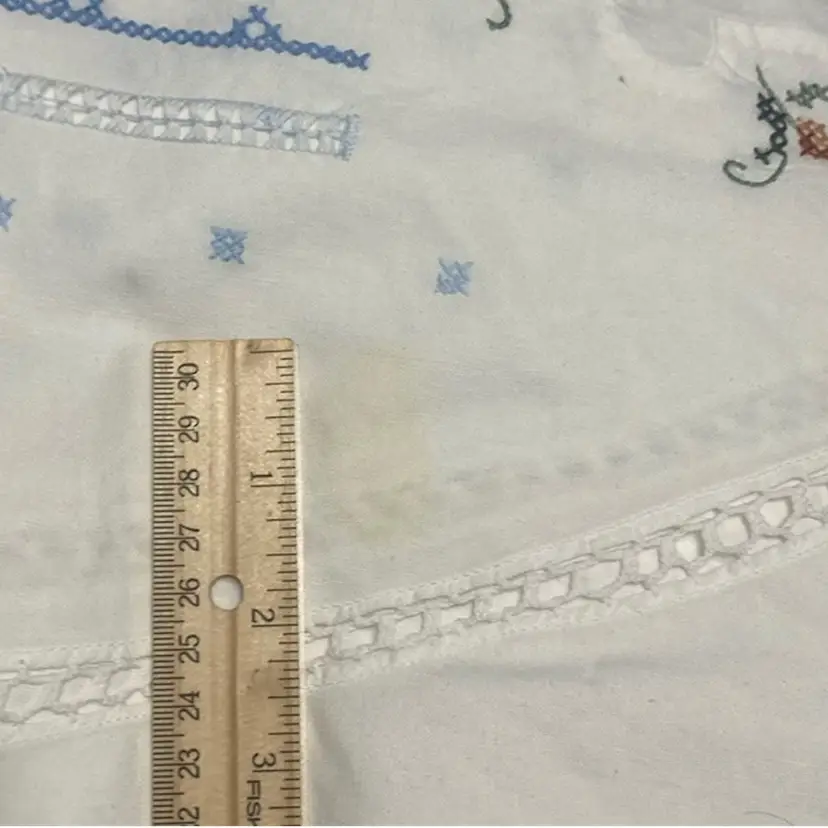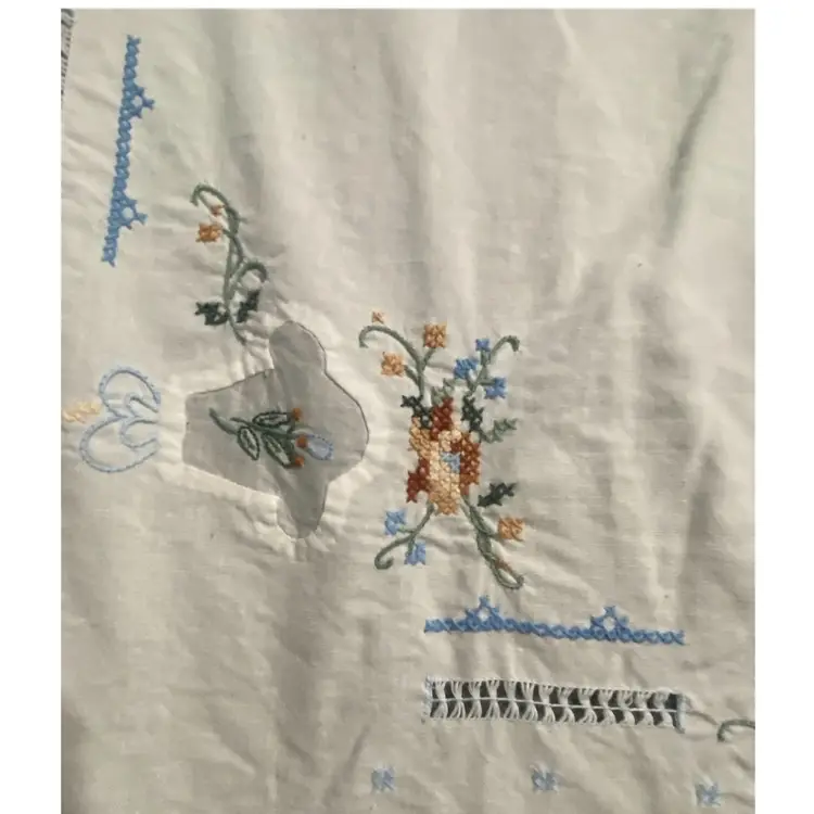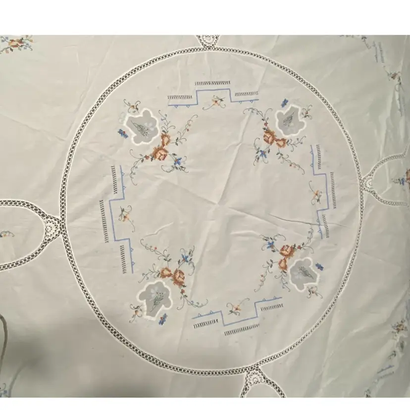 This is a great tablecloth that’s been hand-stitched with embroidery, cross-stitching, and crochet. Made of cotton, and in fantastic condition. There is one small spot that looks stained, but could be treated and laundered. See all photos for details.