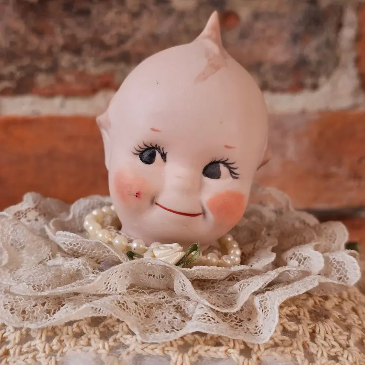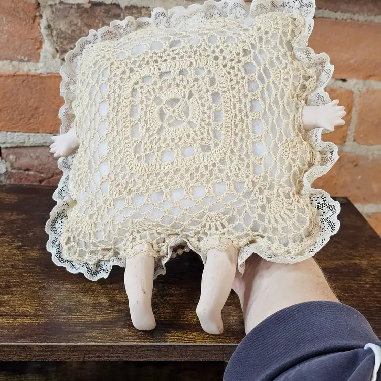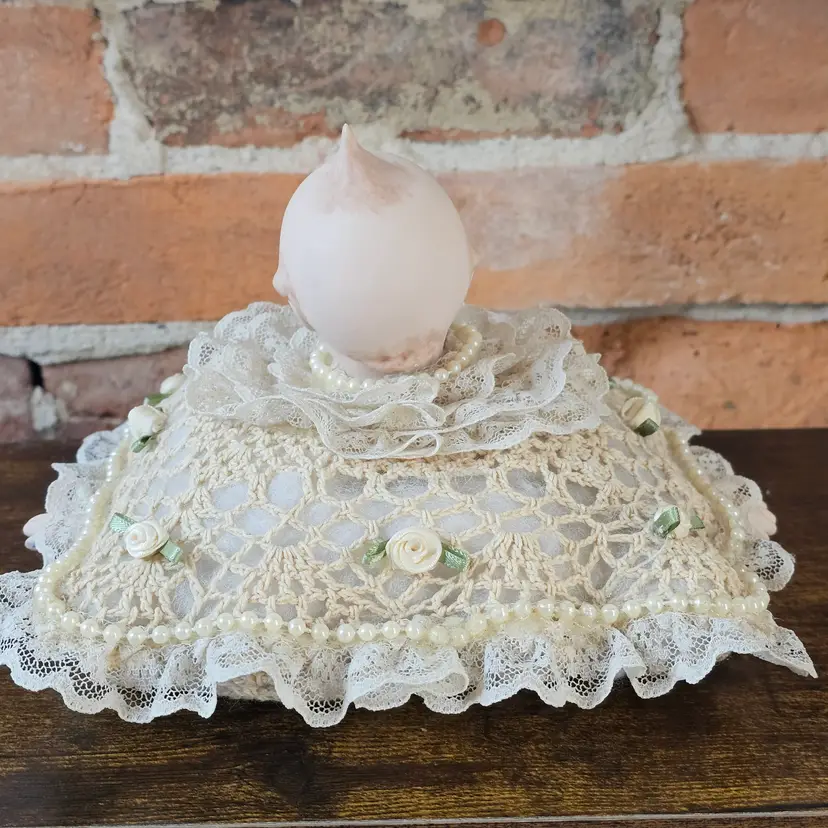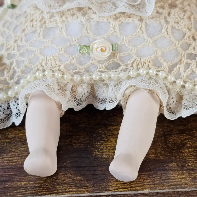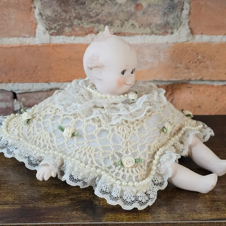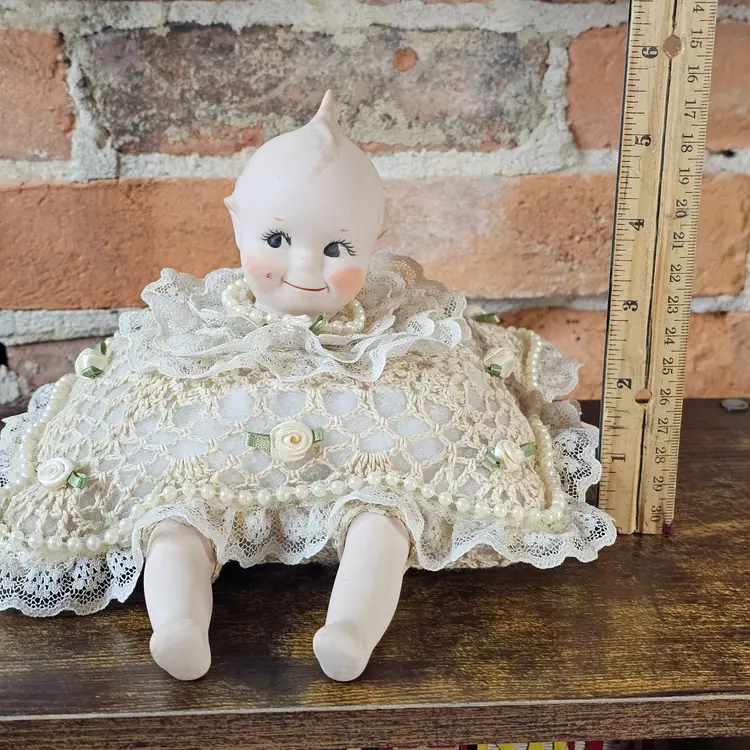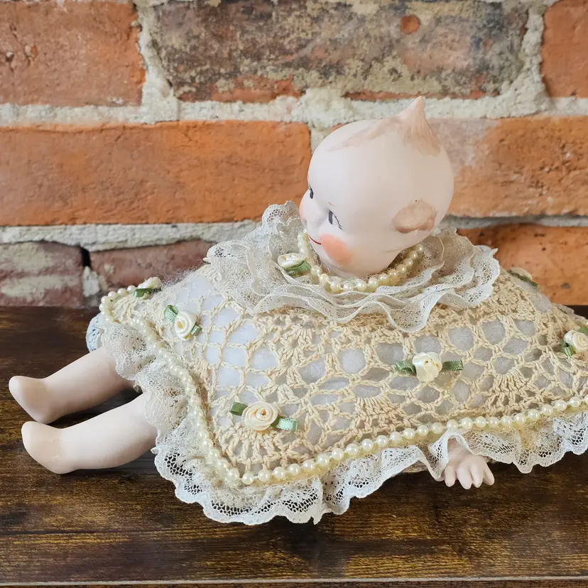 Features ✨ Bisque Kewpie head & legs ✨ Handmade crochet lace pillow dress ✨ Faux pearl trim & ribbon rose details ✨ Soft stuffed body — sits beautifully for display ✨ Perfect for bedroom, nursery decor, or doll collectors