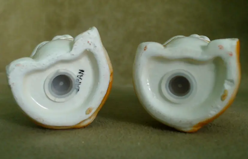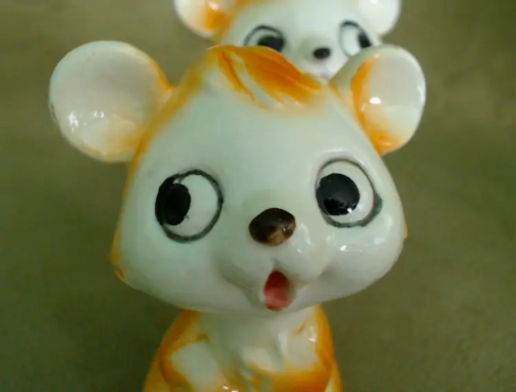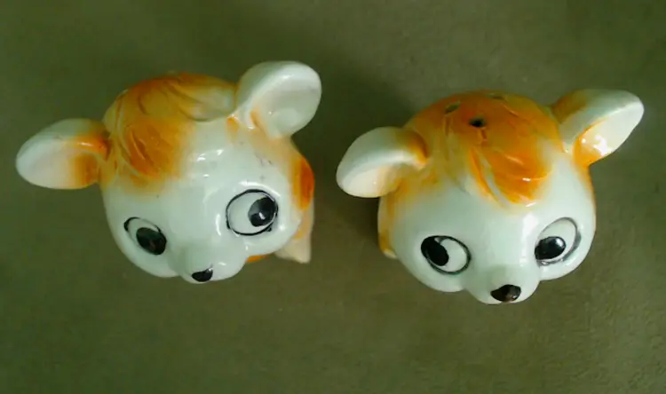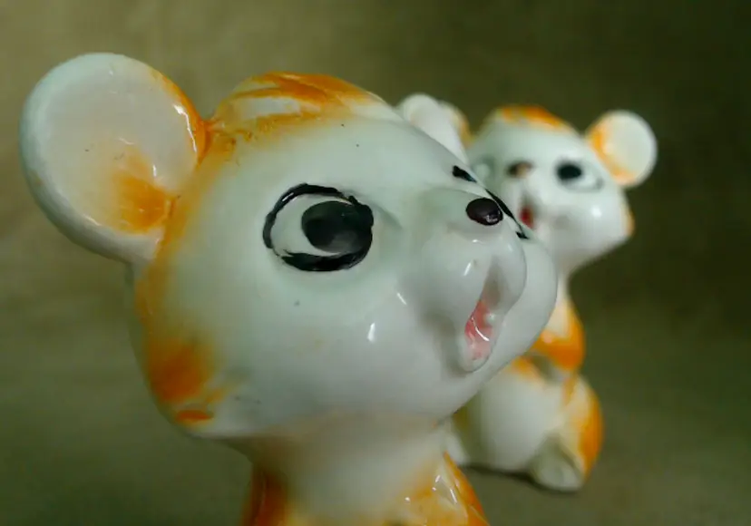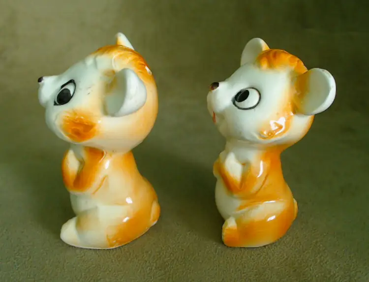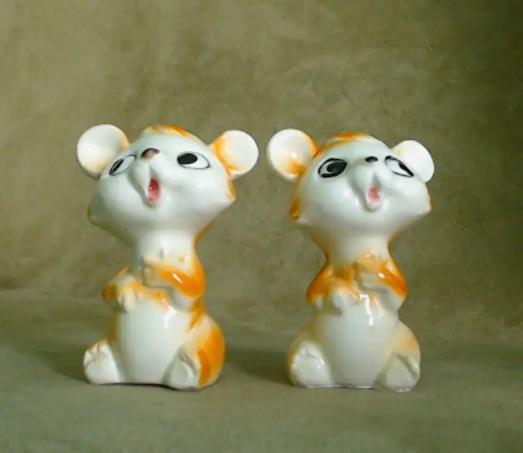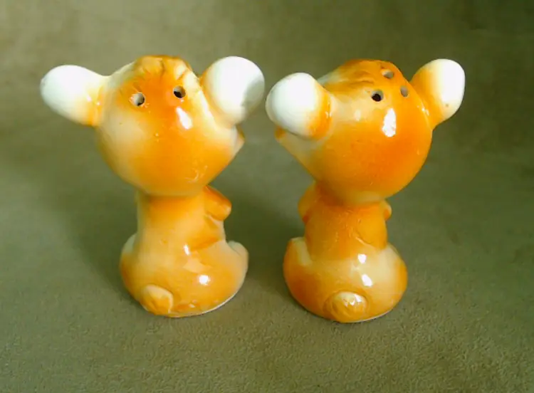 This is a vintage pair of salt and pepper shakers, shaped like sweet little bears! Made in Japan, probably during the late 1960s, these cuties deserve a home near your honey pot, don't you think? Their round ears and chubby cheeks look perfect for a squeeze! Condition: These shakers are in Excellent shape! There are no chips, cracks, or any other damage that I could find. The glaze is a little thin with a few skips around the margins of their ears and mouths, but other than those tiny factory flaws I really couldn't find anything amiss. Both have their original plastic stoppers as well. Size: Each shaker measures just under 2" across, is just over 1½" wide, and sits 2¾" tall.