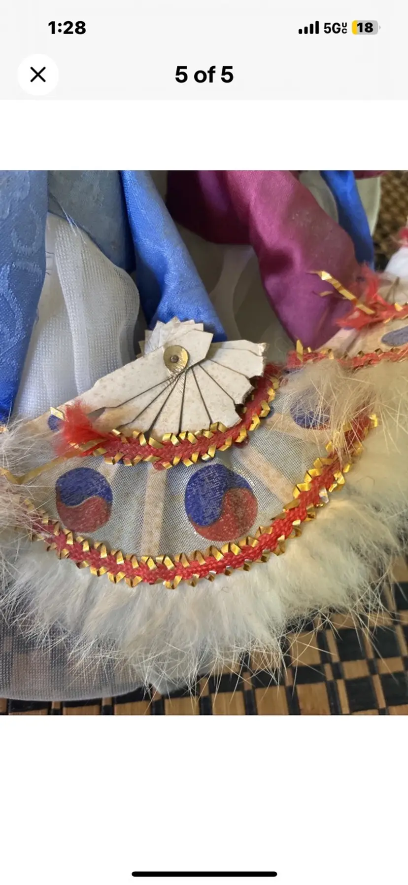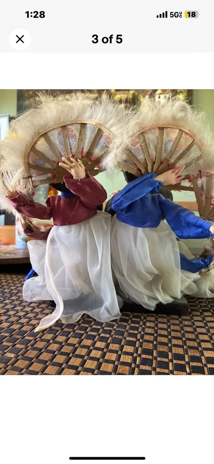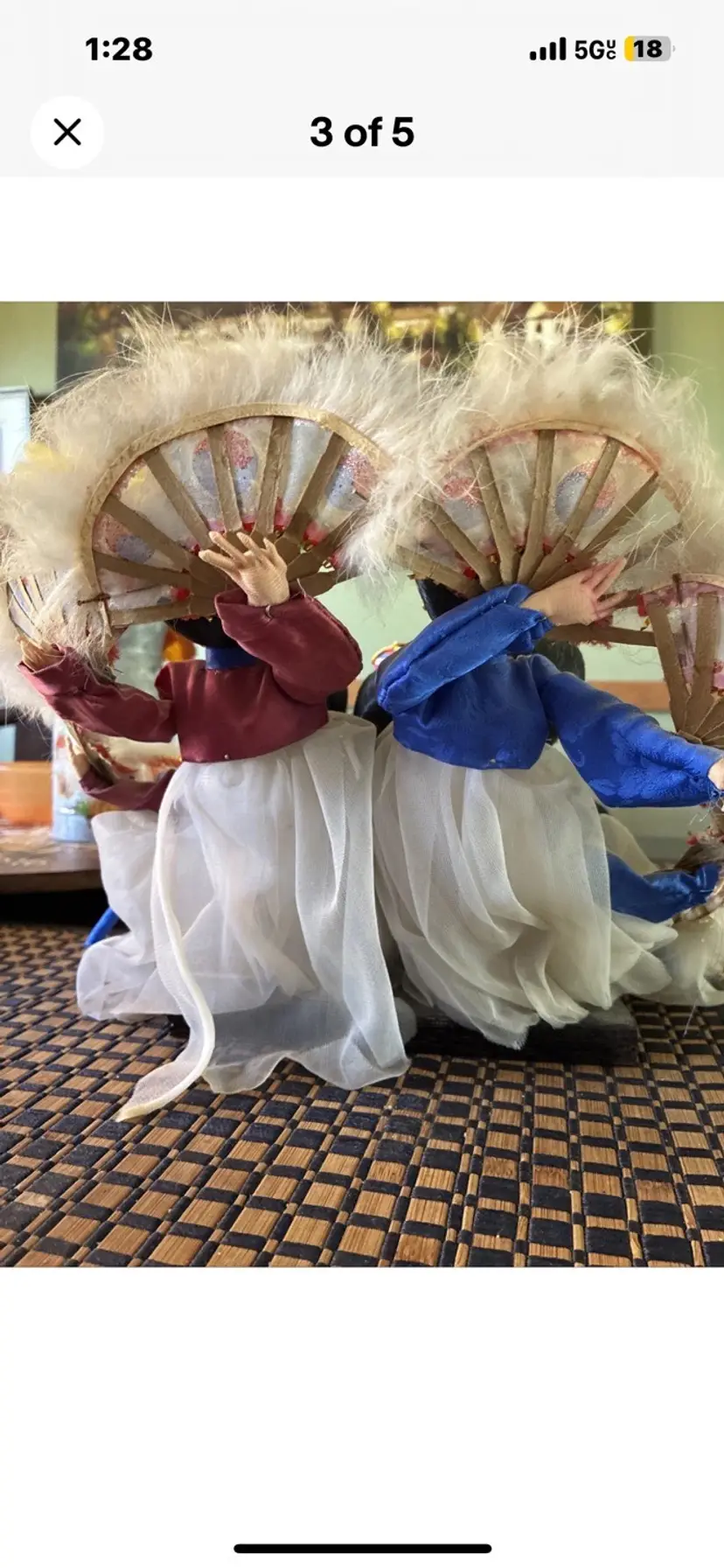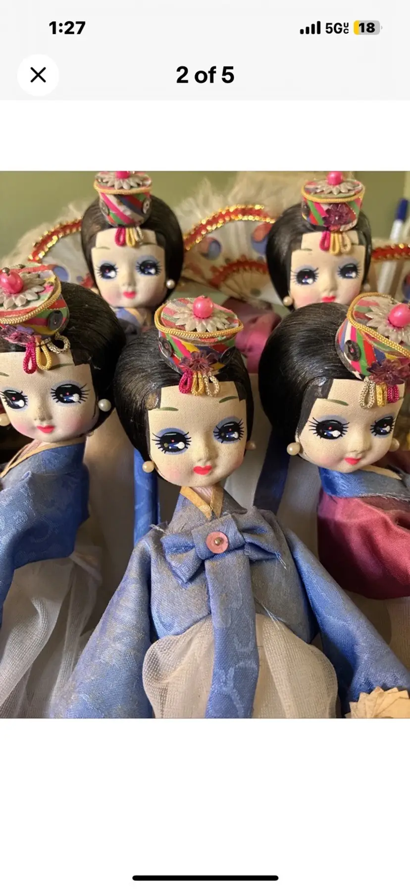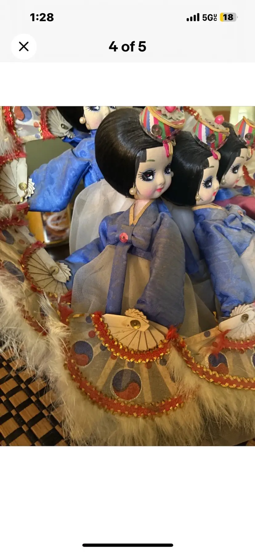 This product is a set of vintage Korean native dolls dressed in traditional hanbok outfits, with the added element of fan dancers. Handmade in South Korea, these dolls showcase the rich cultural heritage of Korea. The intricate detailing and traditional designs make them a unique and artistic collectible item for those interested in Korean culture and ethnicities. This item is vintage and has a little dust. There is a small bit of damage due to age. Please look at pictures. I do not accept returns