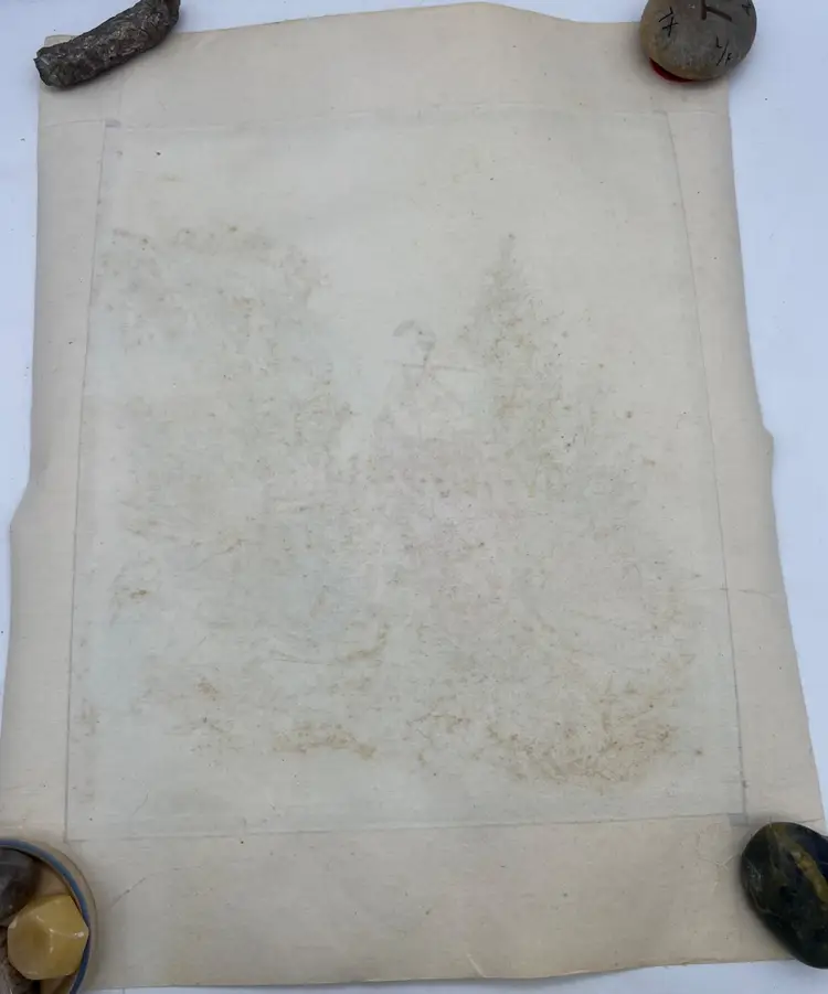 Some minor wear including a little bit of fraying along the edges and some foxing / spotting. No rips or tears noted. Will be shipped rolled up. Note that weights on corners of item used to hold it flat are not included. See pictures for further details on condition.