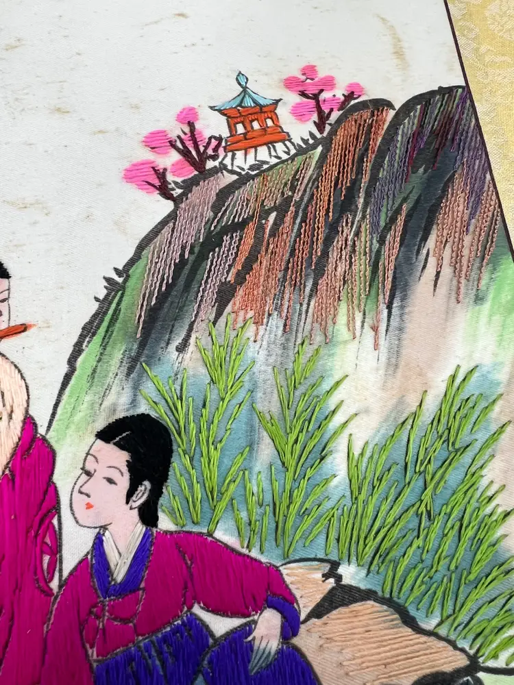 Vibrant Korean chasu embroidery on silk with some painted elements, depicting two women in hanbok relaxing outdoors while one plays a flute. Yellow brocade border in the style of a scroll mount; unframed. Likely mid-century folk/tourist workshop piece. Measurements: Full sheet approx. 18" × 14"; inner image approx. 12.5" × 10.5".