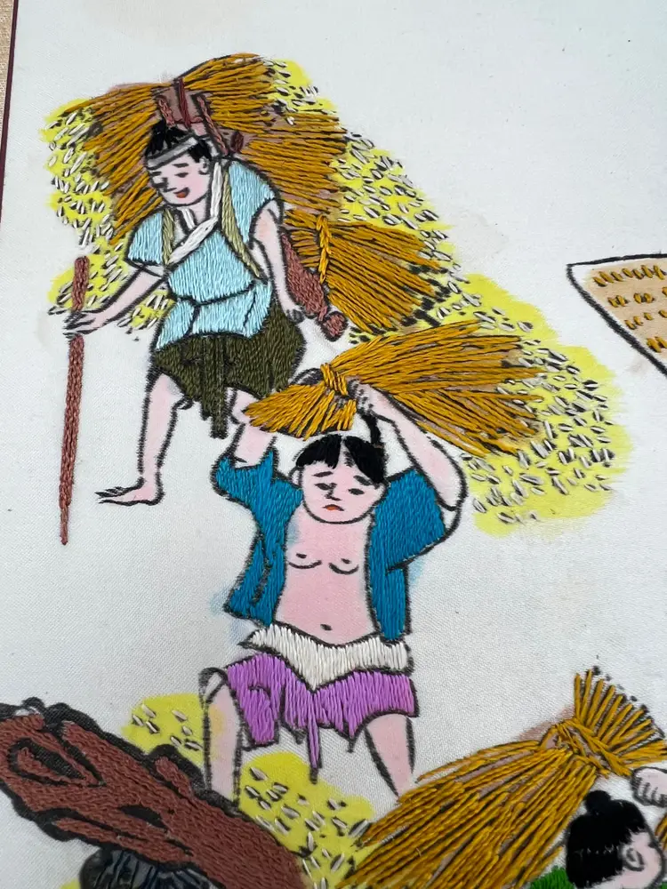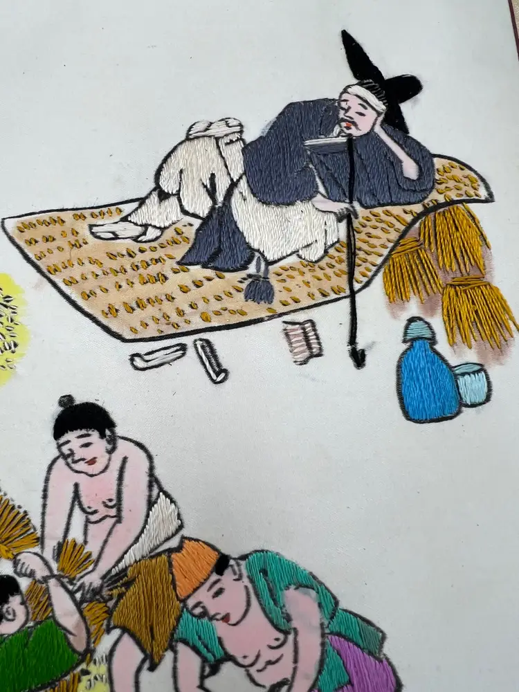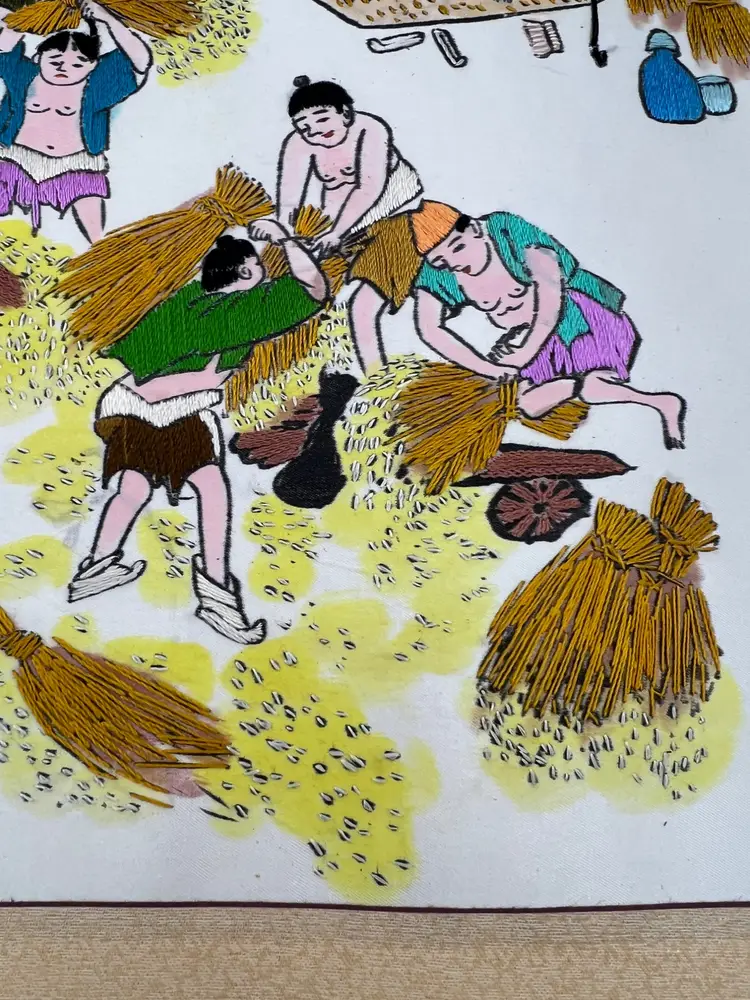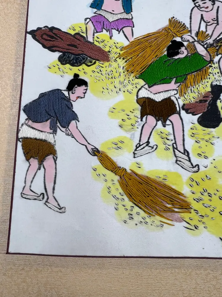 Vintage Korean silk embroidery panel depicting a rice harvest: laborers bundle and winnow grain while a yangban noble in a gat hat reclines with a pipe. Hand-stitched silk threads over a lightly painted silk ground; mounted with a patterned brocade border and paper backing. Overall approx. 18" x 14"; inner image approx. 12.5" x 10.5". Unframed. Colors are vivid.