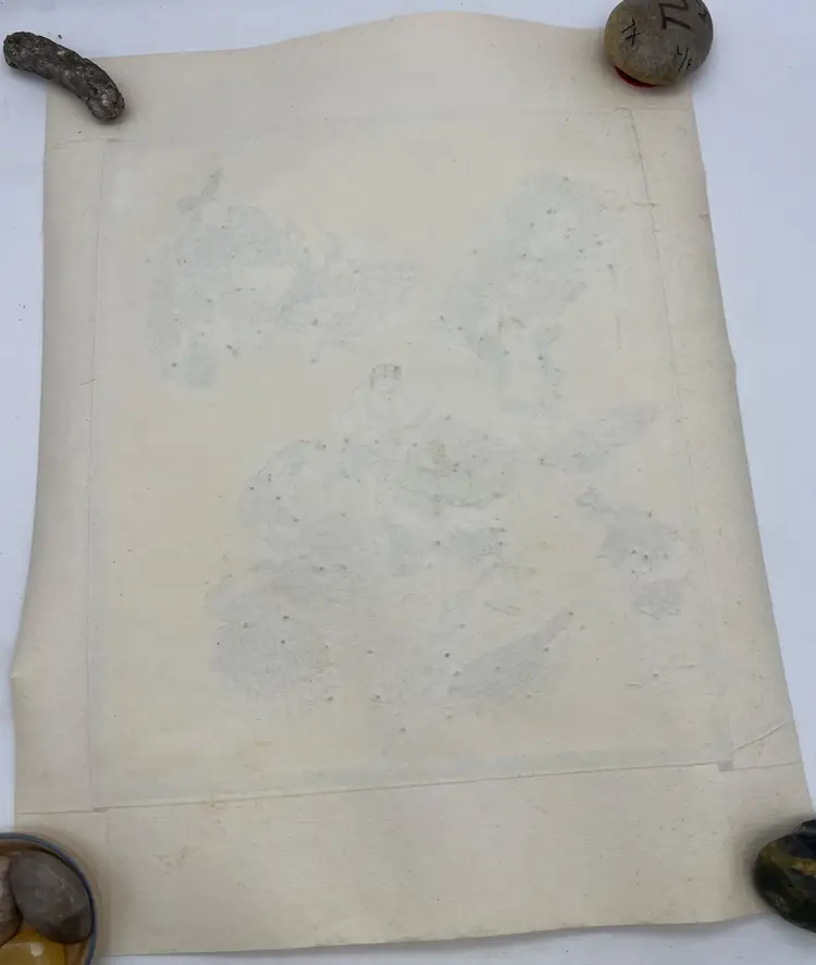Some minor wear including a little bit of fraying along the edges and some foxing / spotting. No rips or tears noted. Will be shipped rolled up. Note that weights on corners of item used to hold it flat are not included. See pictures for further details on condition.