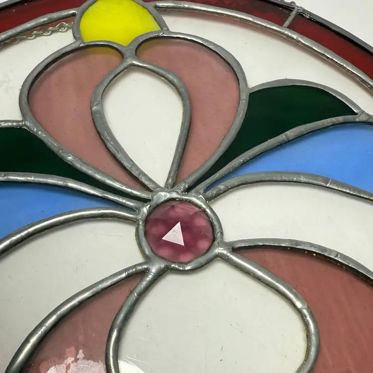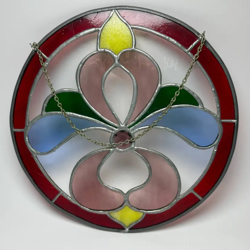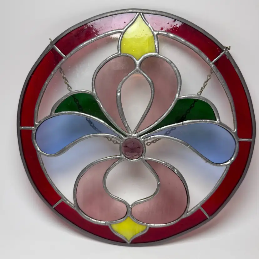 Vintage Large 10" Stained Glass Fleur de Lis Flower Suncatcher Faceted Center w/ Hanger. There is a beautiful pink faceted cabochon in the center. Measures about 10 5/8" diameter. Red, pink, blue, green yellow and clear.