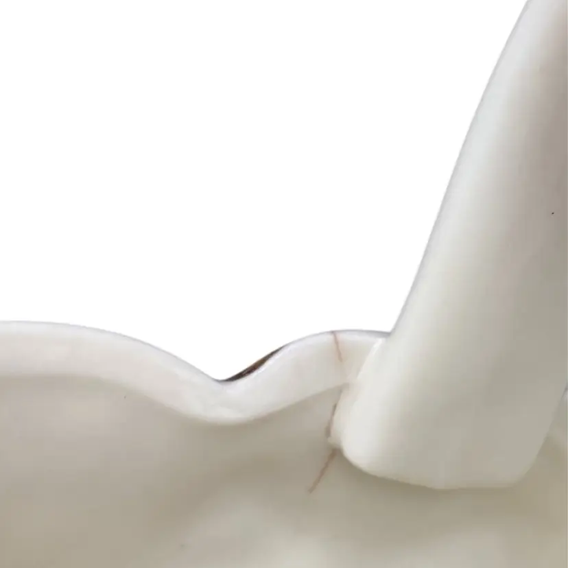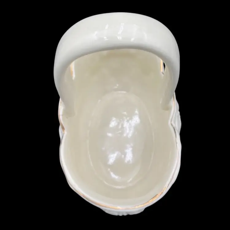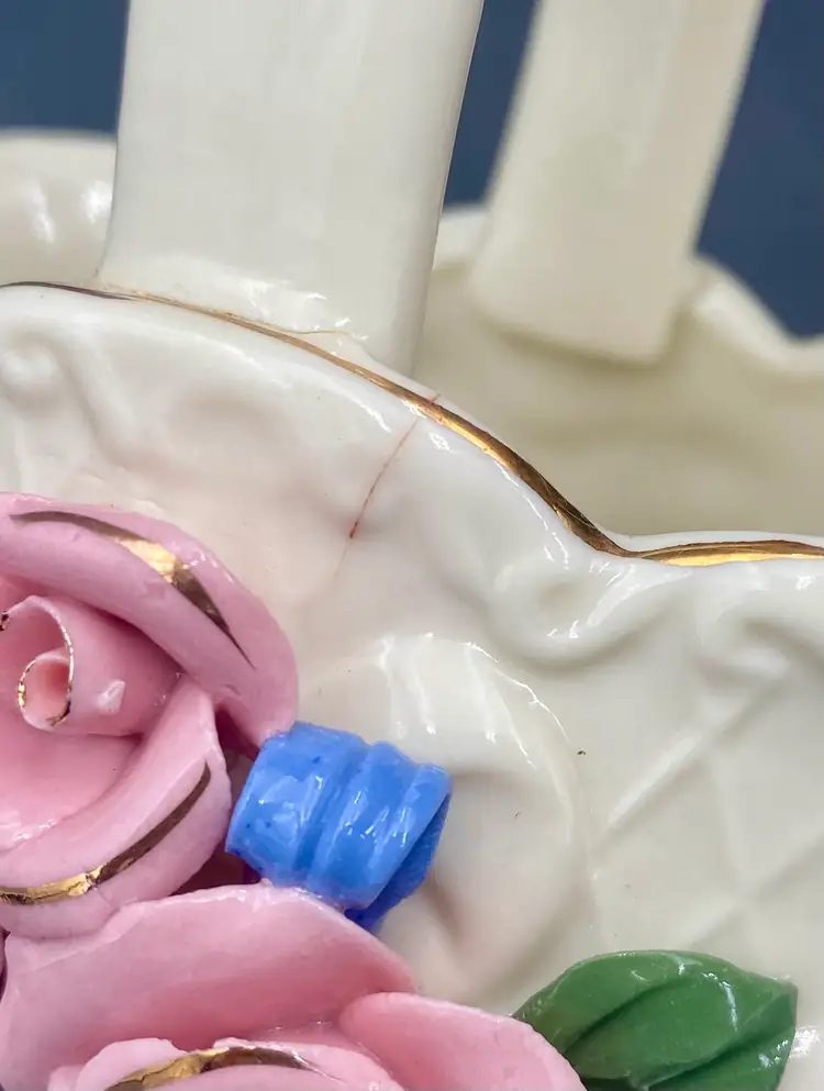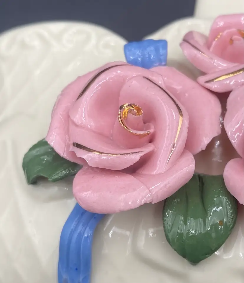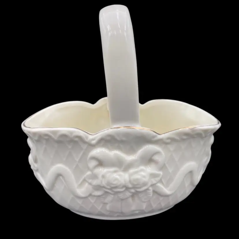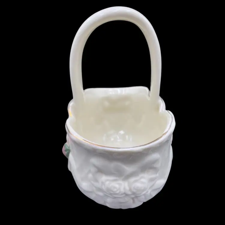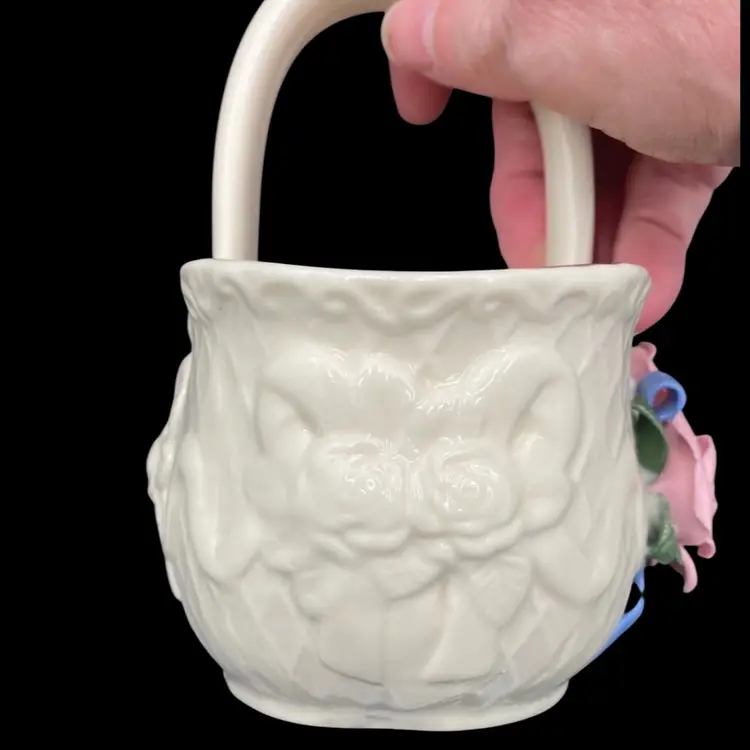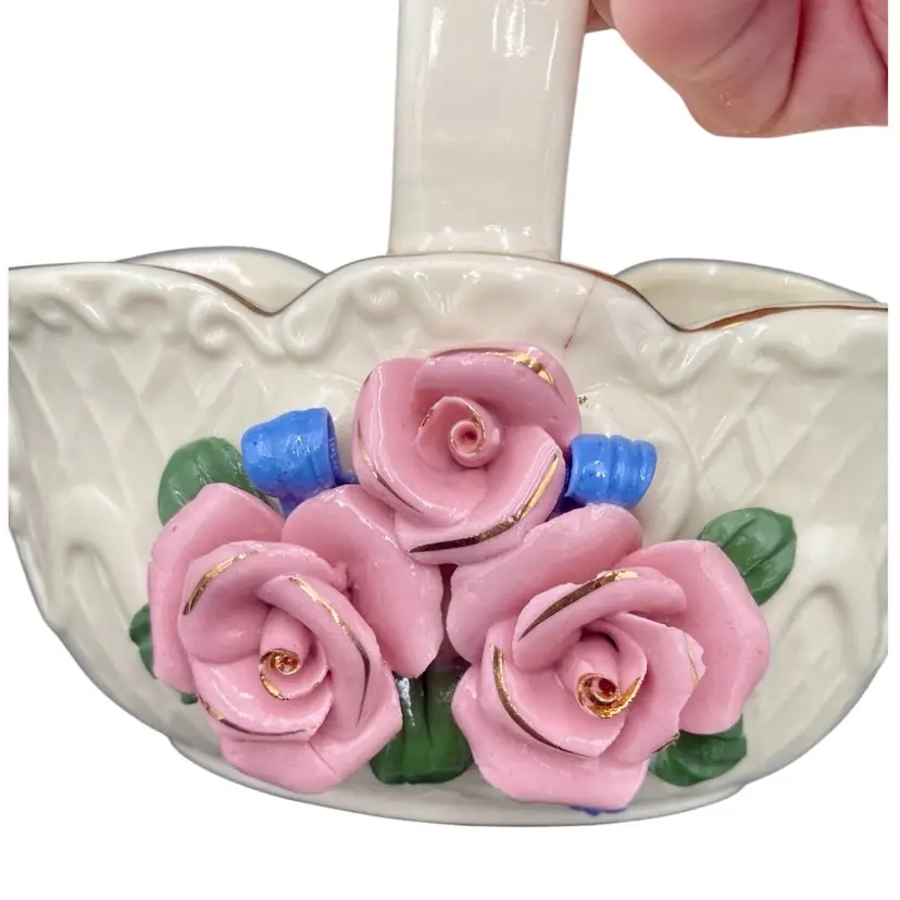 Add a touch of elegance to your decor with this vintage porcelain basket featuring applied pink roses, blue ribbon, green leaves, and gold trim. The oval-shaped medium-sized basket is perfect for all occasions and can be used as a decorative piece or to hold small items or a flower arrangement. Measuring 6.25 inches in length, 6.5 inches in height, and 4.5 inches in width, this decorative basket weighs 15.6 ounces.