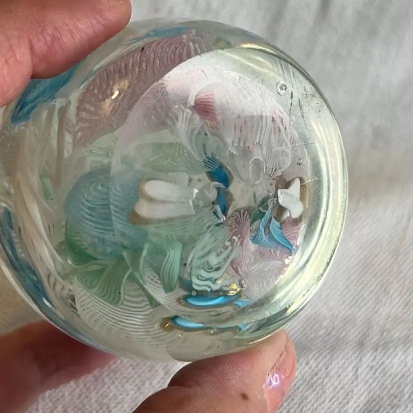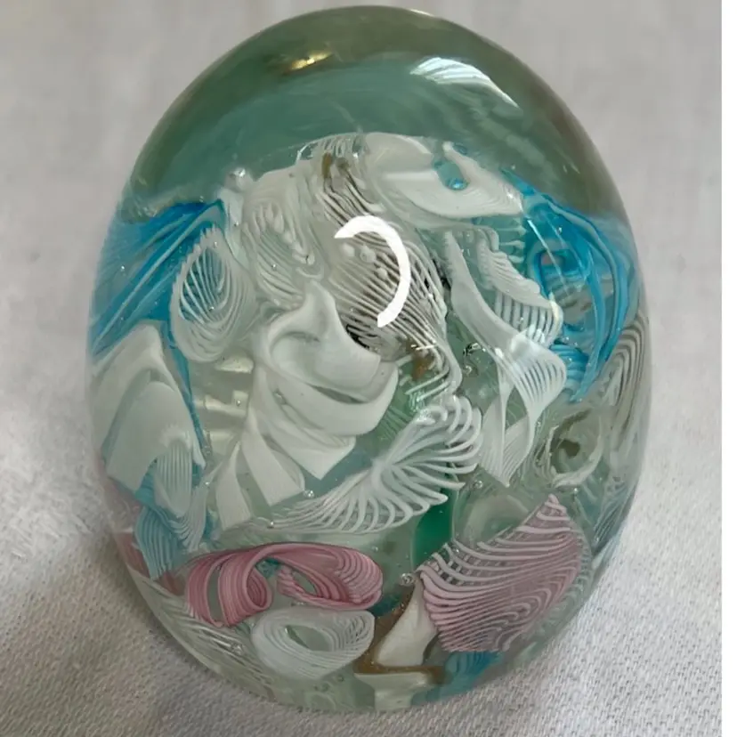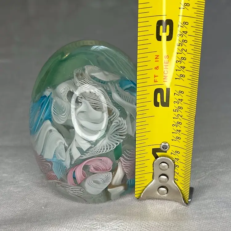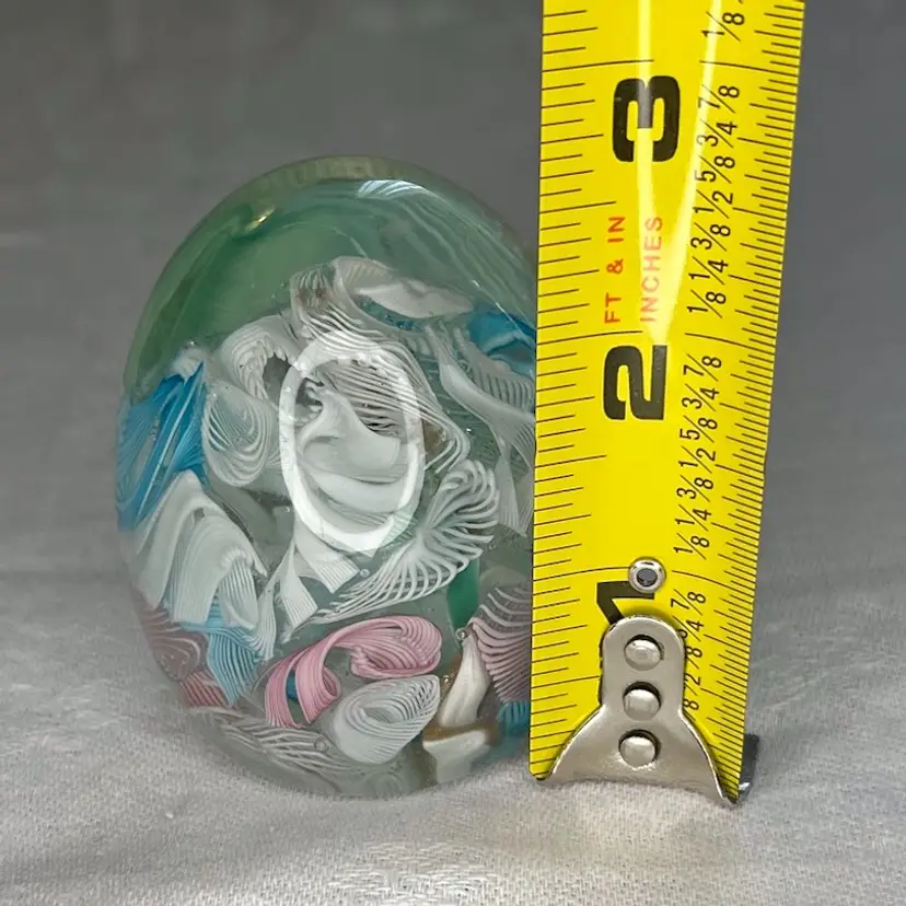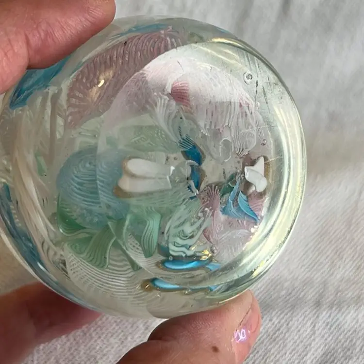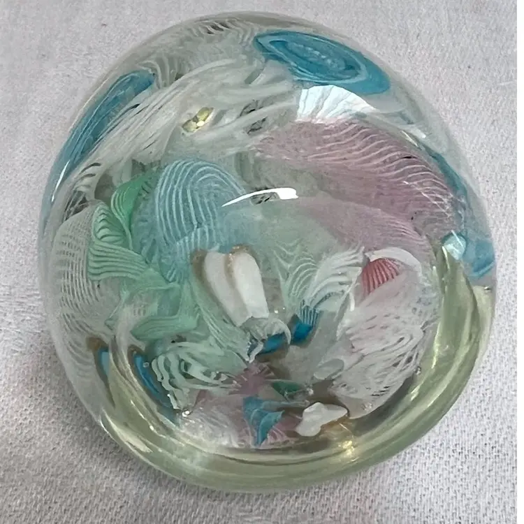 Colorful pastel vintage paperweight in pinks, blues and white. Beautiful Italian Latticino ribbon scramble design. Polished base. Slight scratching commensurate with age.