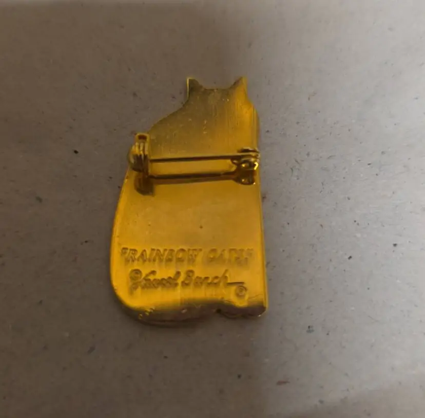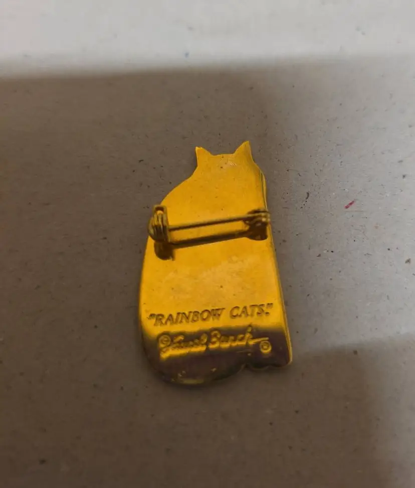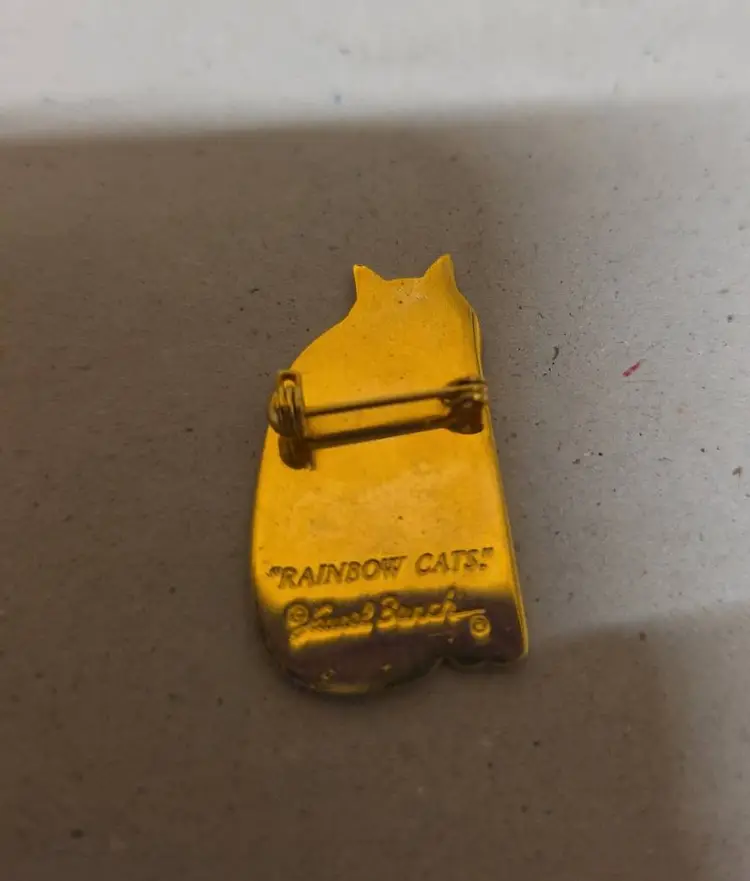 The Laurel Burch Rainbow Cat Pin Brooch is a vintage piece from the 1980s featuring a colorful enamel cat design. This retired vintage brooch is a unique accessory for all occasions, showcasing the signature style of Laurel Burch. Standing at 1.5 inches in length, this brooch pin adds a touch of whimsy and charm to any outfit with its multicolor enamel and metal construction. Perfect for cat lovers and collectors alike, this brooch embodies the theme of cats and vibrant rainbow colors in a classic vintage design.