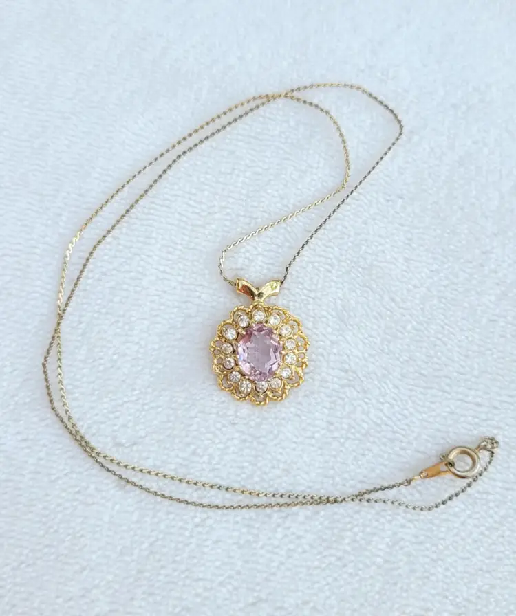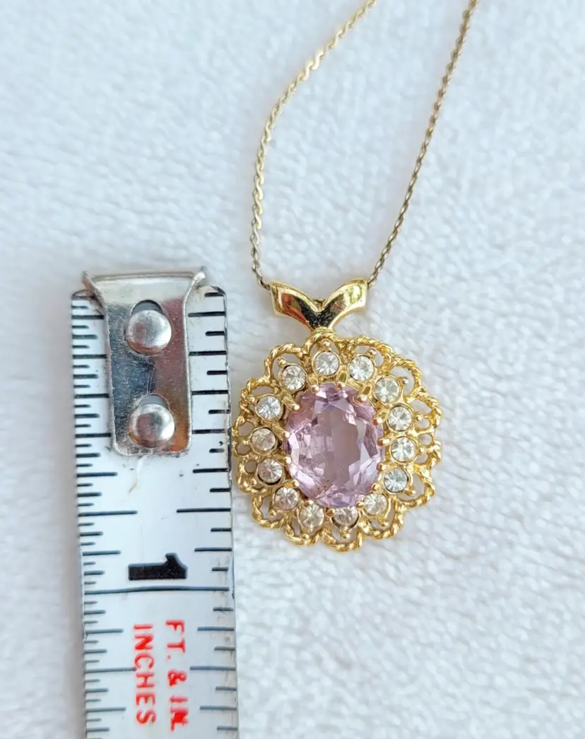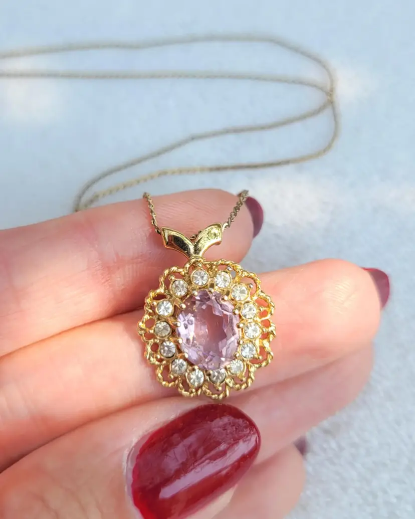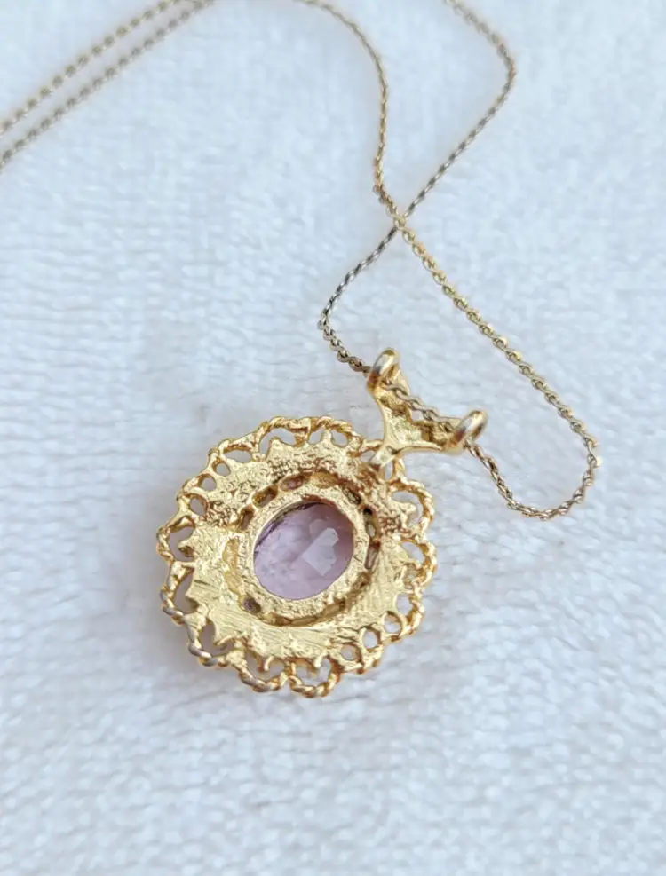 Lovely 1970s-does-1870s ornate gold tone pendant with a lavender hued faceted glass stone surrounded by sparkling cz's, on a 18" chain. It's in good condition from an estate, please see pictures for details and measurements.