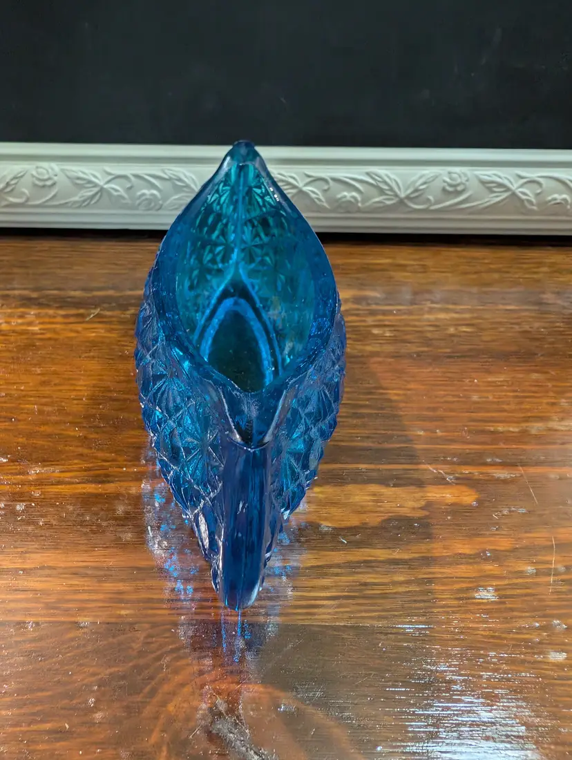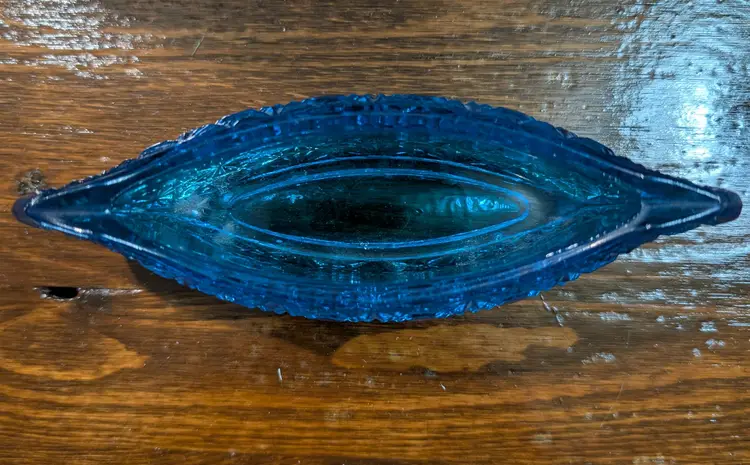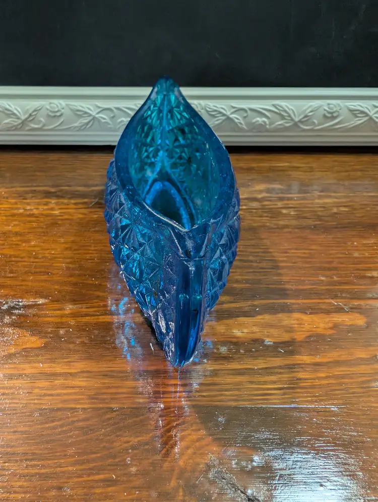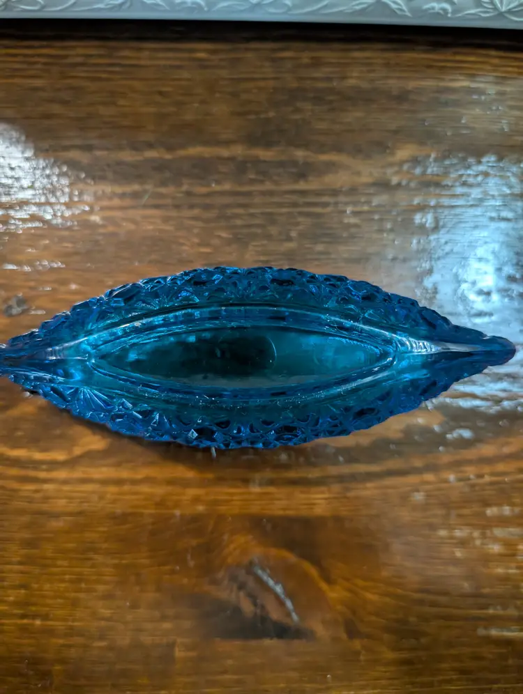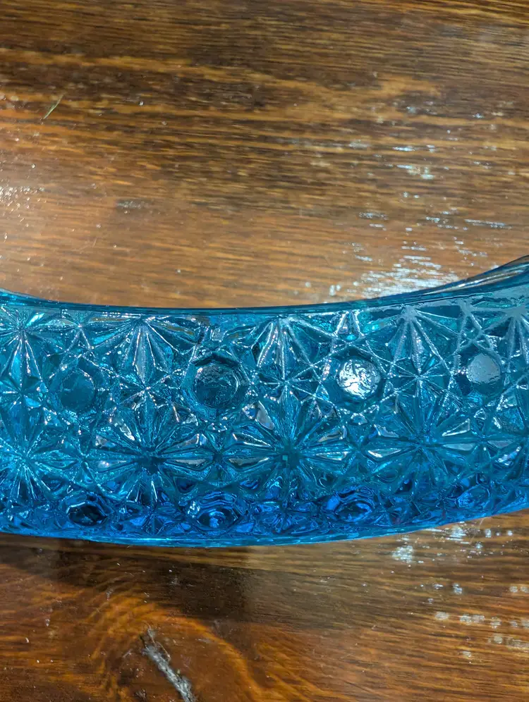 Vintage Le Smith, Daisy and button designs glass canoe. Piece is an excellent shape with no chips or cracks. Piece is approximately 6 inches length with a 2 inches height and has a 2 inch width. Piece is a beautiful blue glass with a daisy button design. Very nice looking collectible piece.