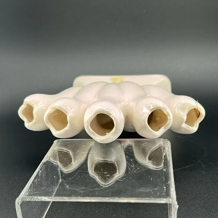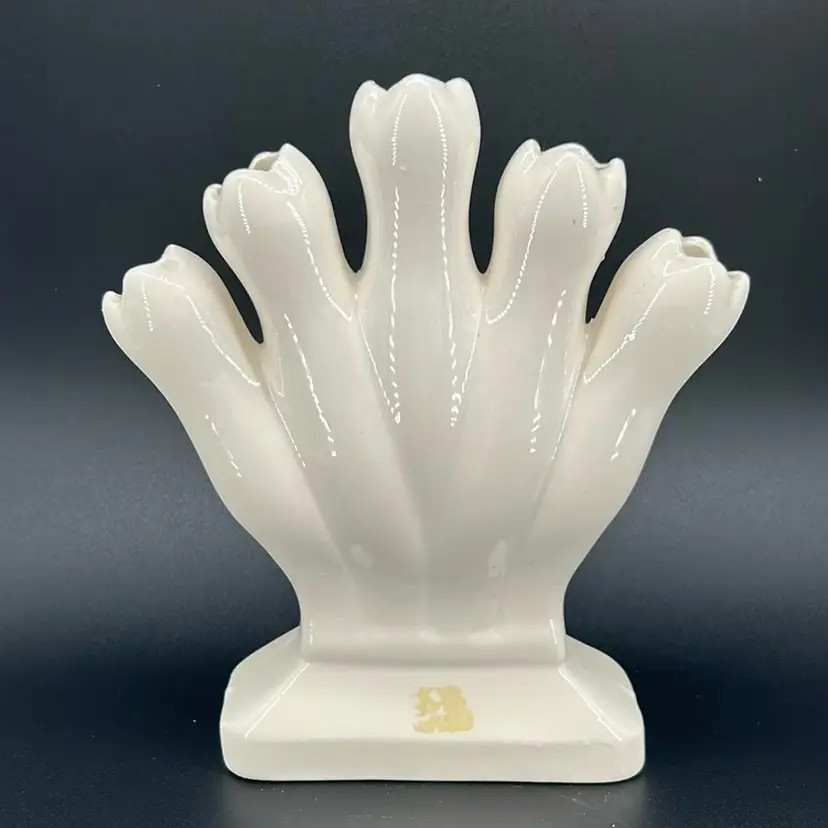 This item is a vintage alert, five finger vase commonly recognized by its distinctive tulip design. It is most likely from the mid 20th century. It stands 6 1/2 inches tall and 6 inches and it’s widest part there are no chips or cracks.