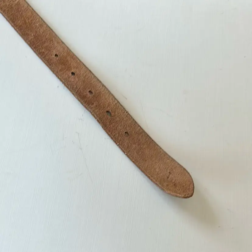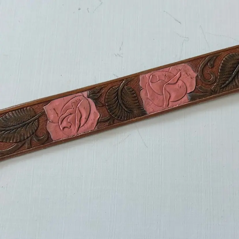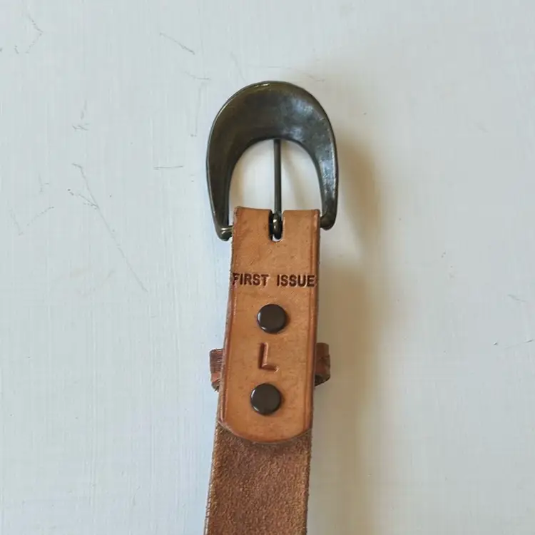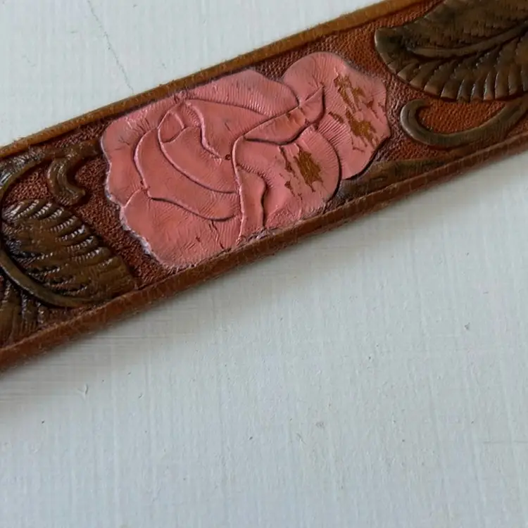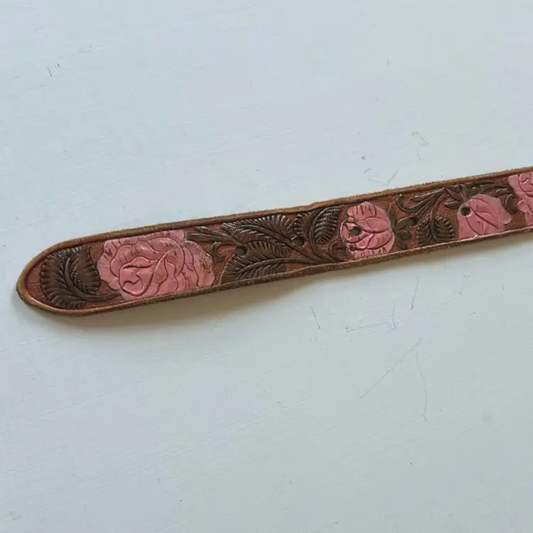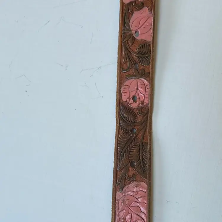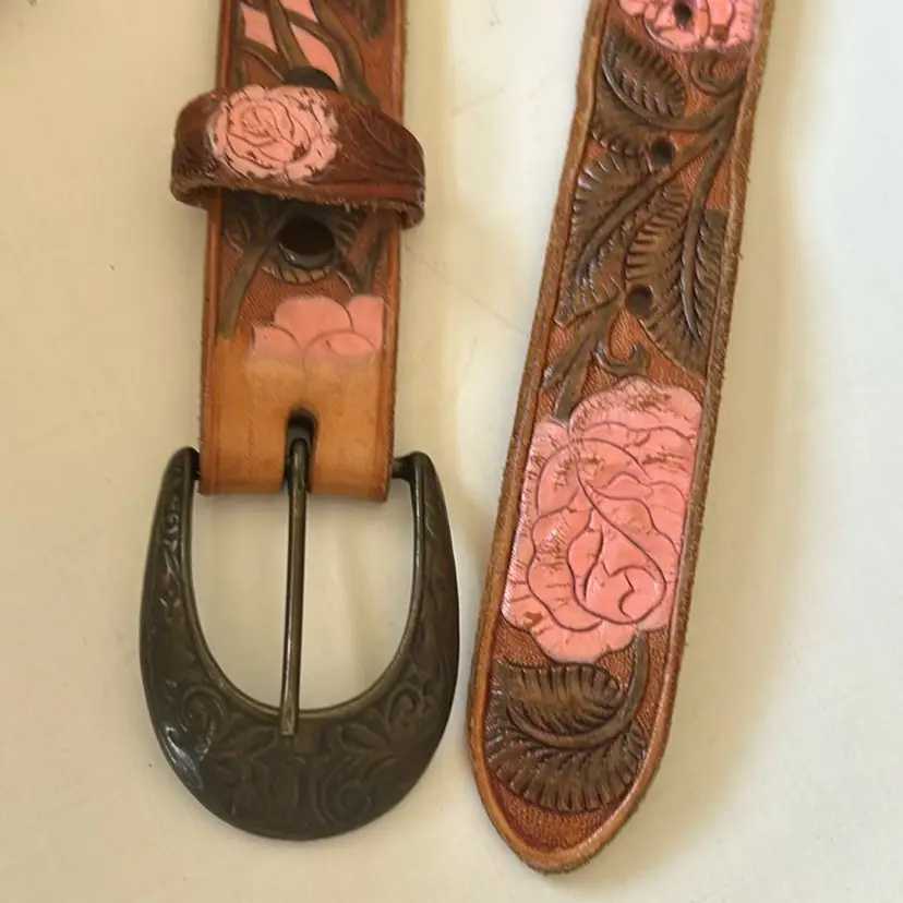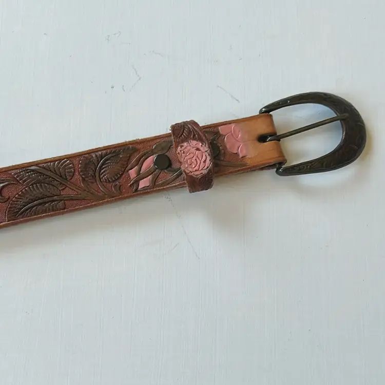 This vintage leather belt from First Issue features an intricate floral design and a detailed brass buckle. With a medium size, it measures 36 inches end to end. • First Issue brand • Floral design • Brass buckle • Large size • 38 inches end to end (not including buckle) • 1 inch wide • Leather