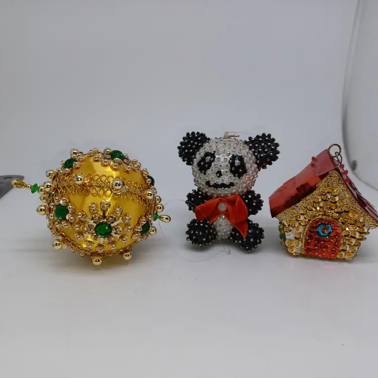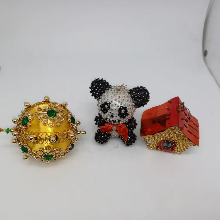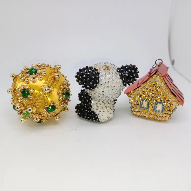 3 vintage Lee Wards completed sequin and pin ornaments the panda is missing one sequin and pin from his rear the house is missing a couple from the front but nothing that detracts from use or display measure approximately 2 1/2 in tall please see all pictures as they're the best description all items from the smoke-free home with pets experienced shipper