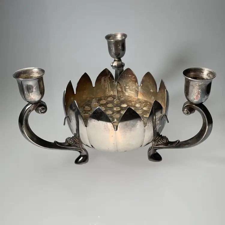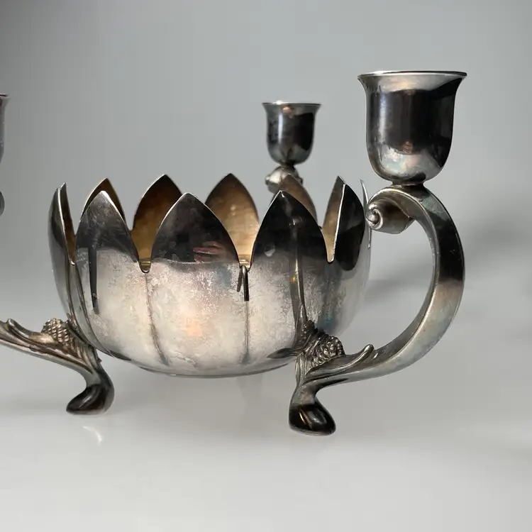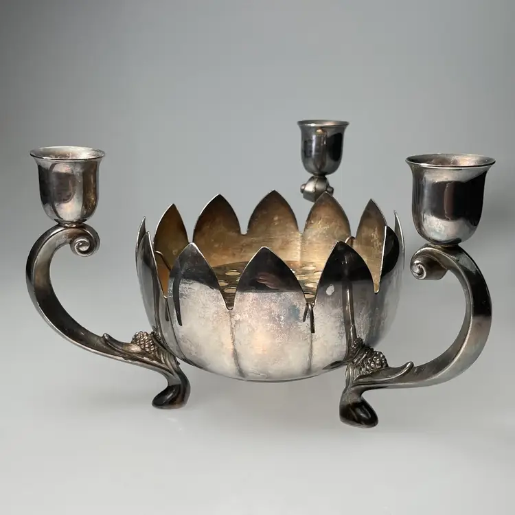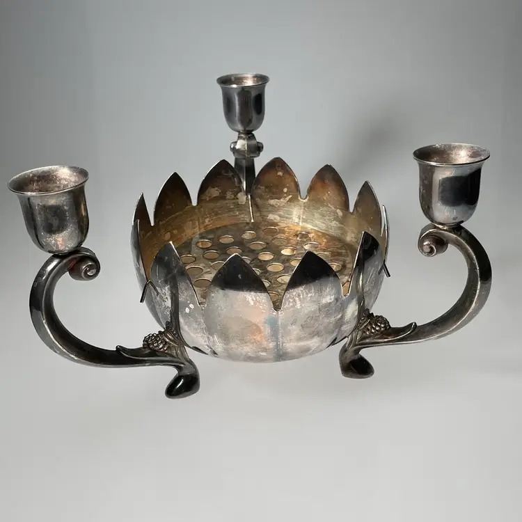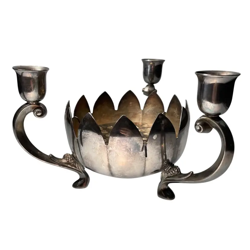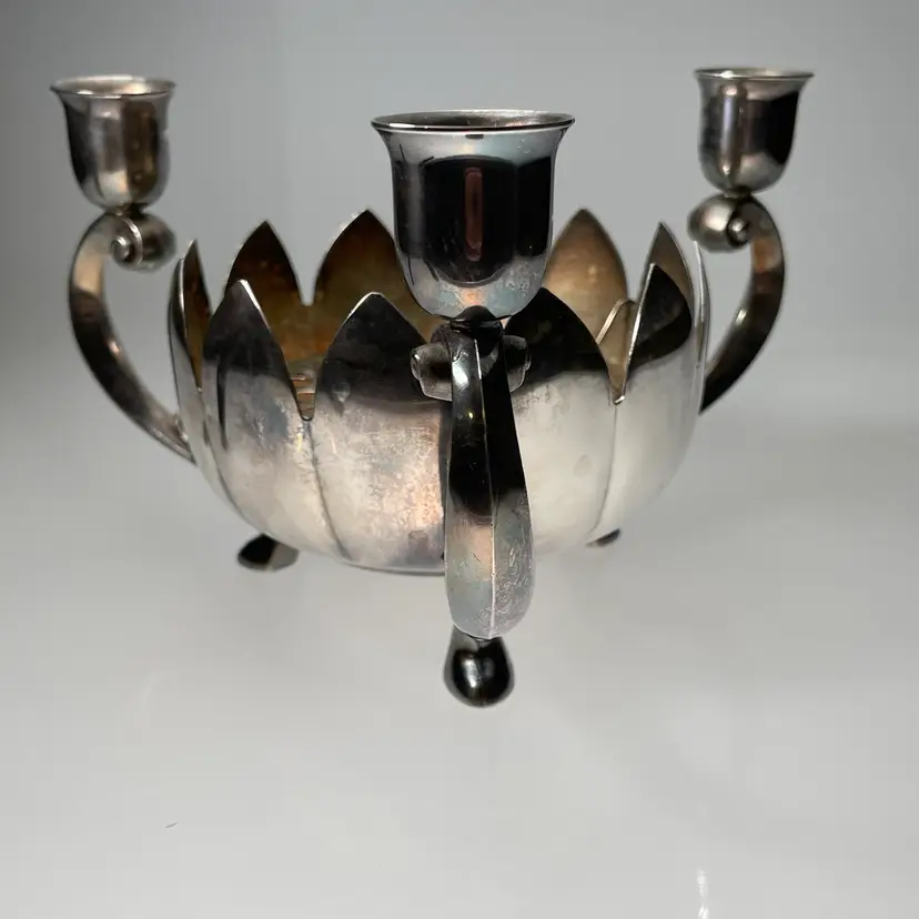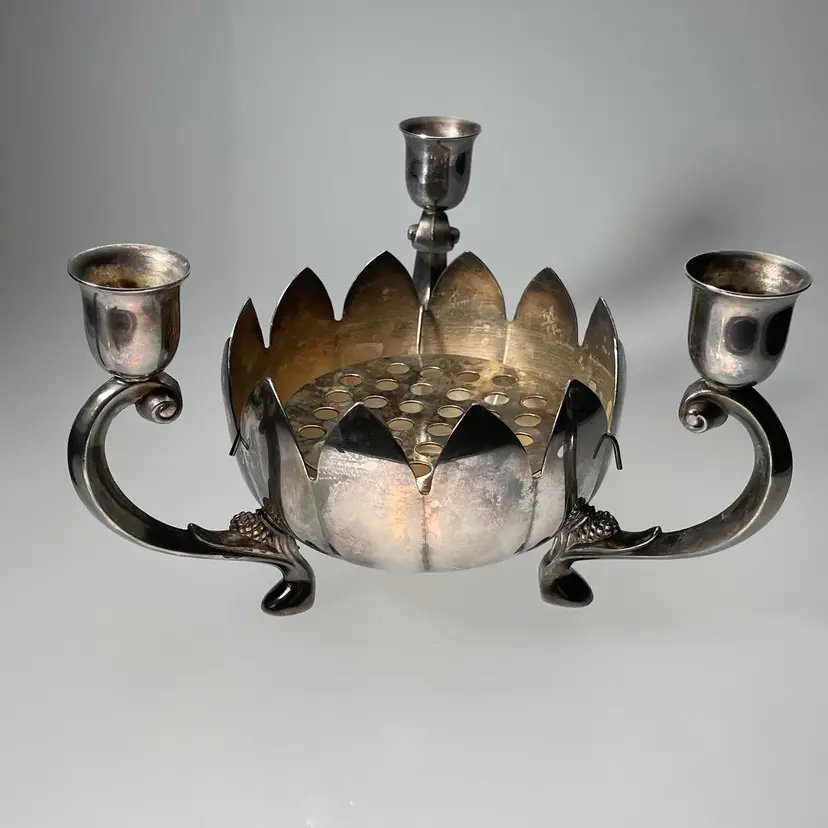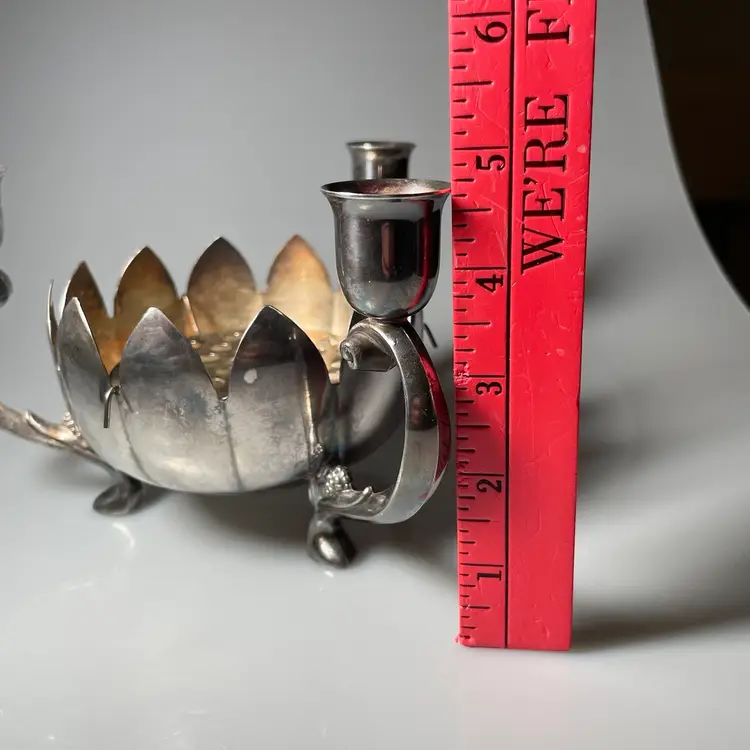 Measurements are approximate: nearly 8 inches diameter from one candle arm to the other, 4.75 inches tall