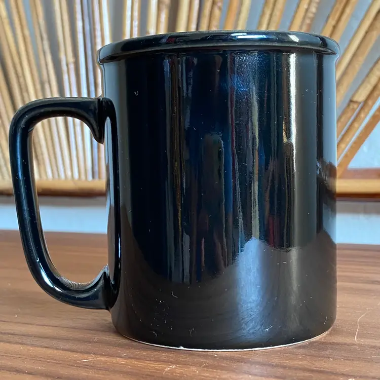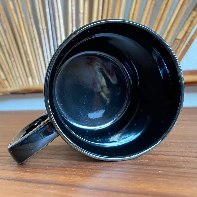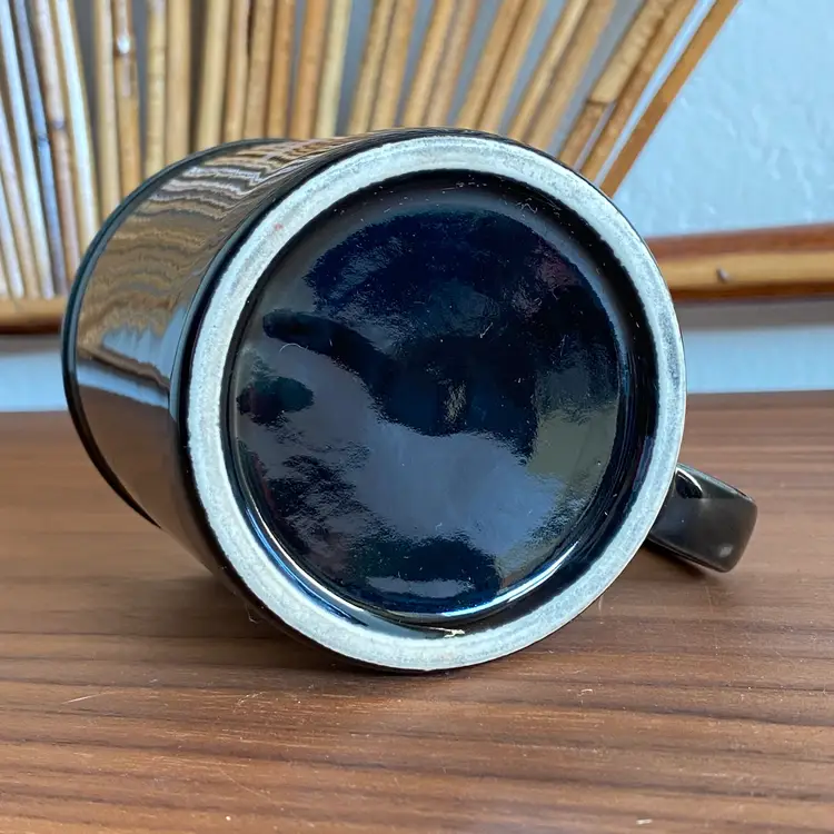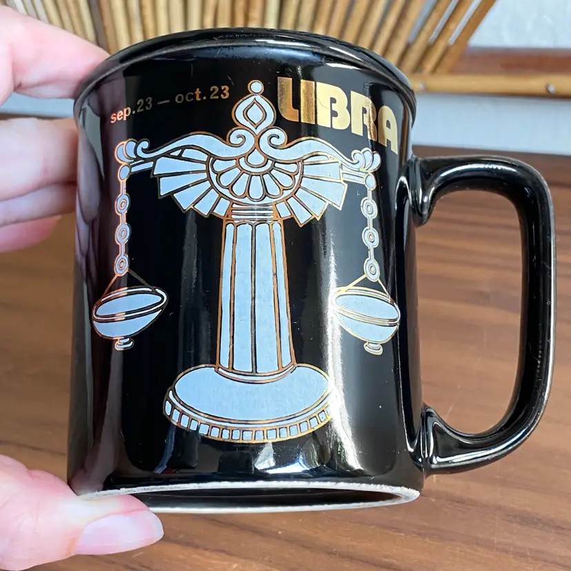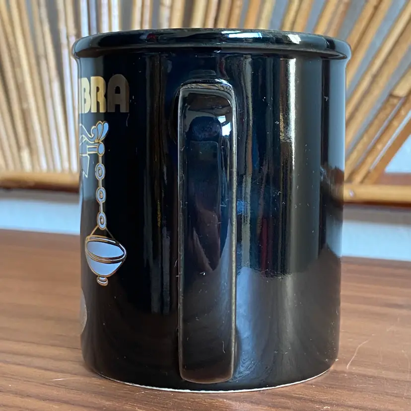 Vintage black ceramic mug printed on one side with white and gold scales and "Libra" "sep.23 - oct.23" in gold paint. In excellent condition with no paint loss or chips. You can see in photos a bit of dullness above the pattern near the rim which I didn't notice at the time of photographing but it was just some residue and it did come off. There's a tiny scratch near the 3 in "oct.23". Measures 3-5/8" tall and 3" diameter. Not dishwasher or microwave safe due to the gold paint.