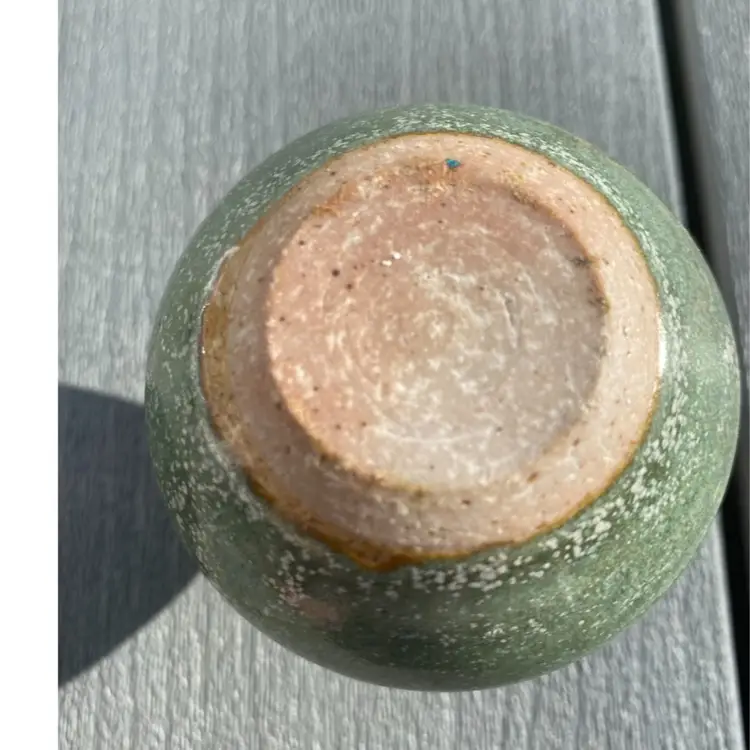 This is a beautiful hand-made ceramic light green celadon vase purchased at an art show in the late 1990’s. It is perfectly shaped and small enough to display just about anywhere, measuring approximately 3 1/2 high by 2 1/2” wide. This would be lovely on a window sill with a few cut flowers inside.