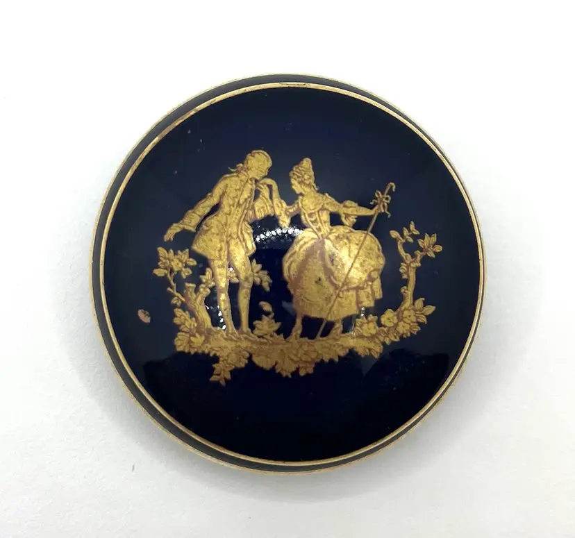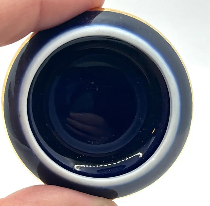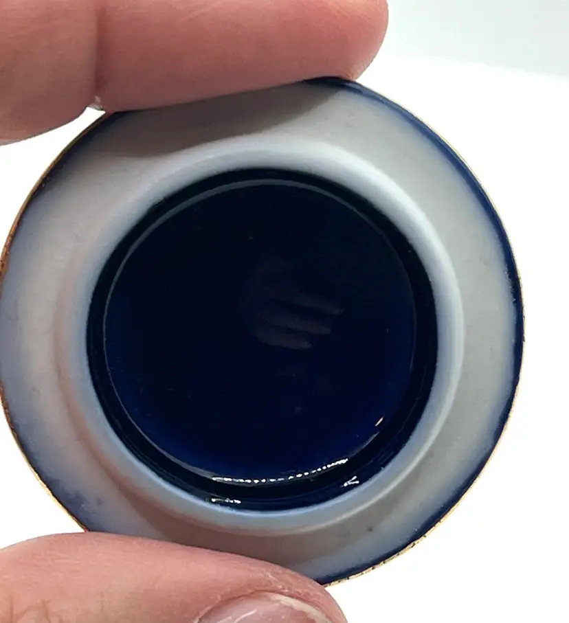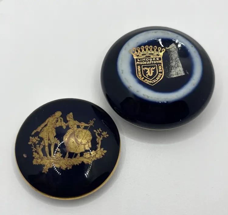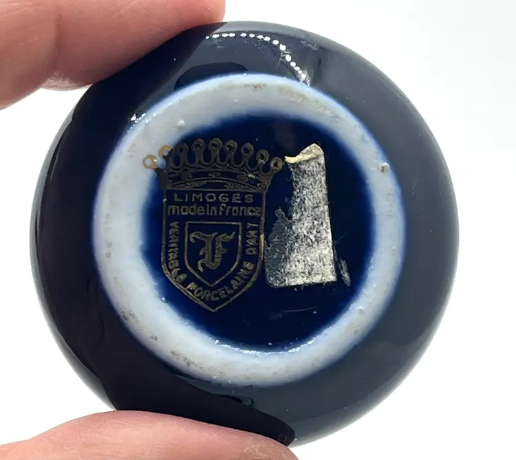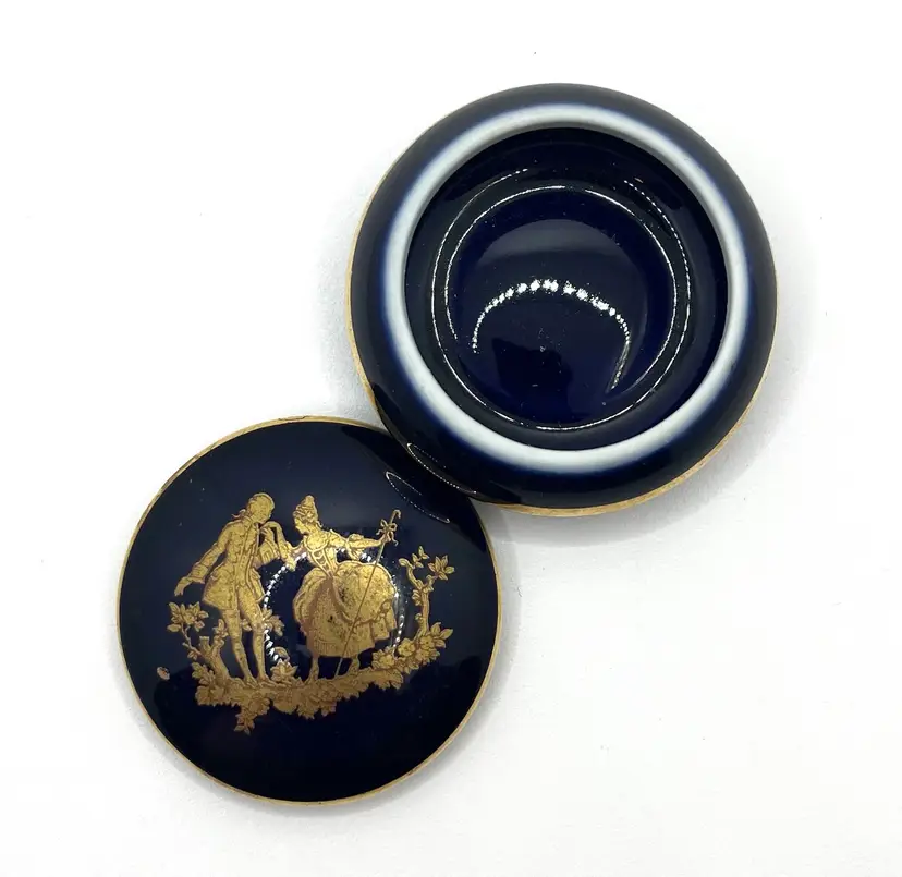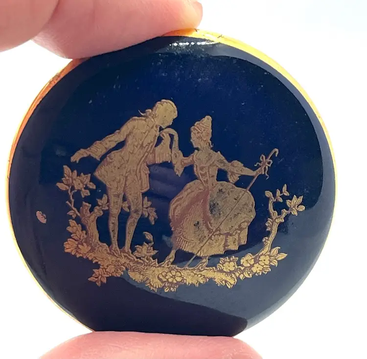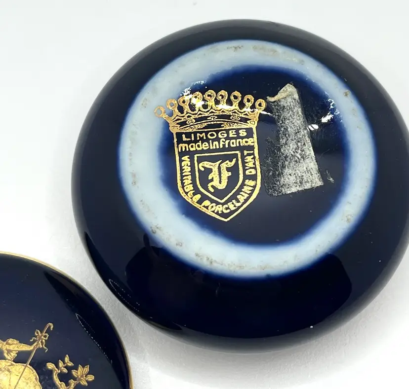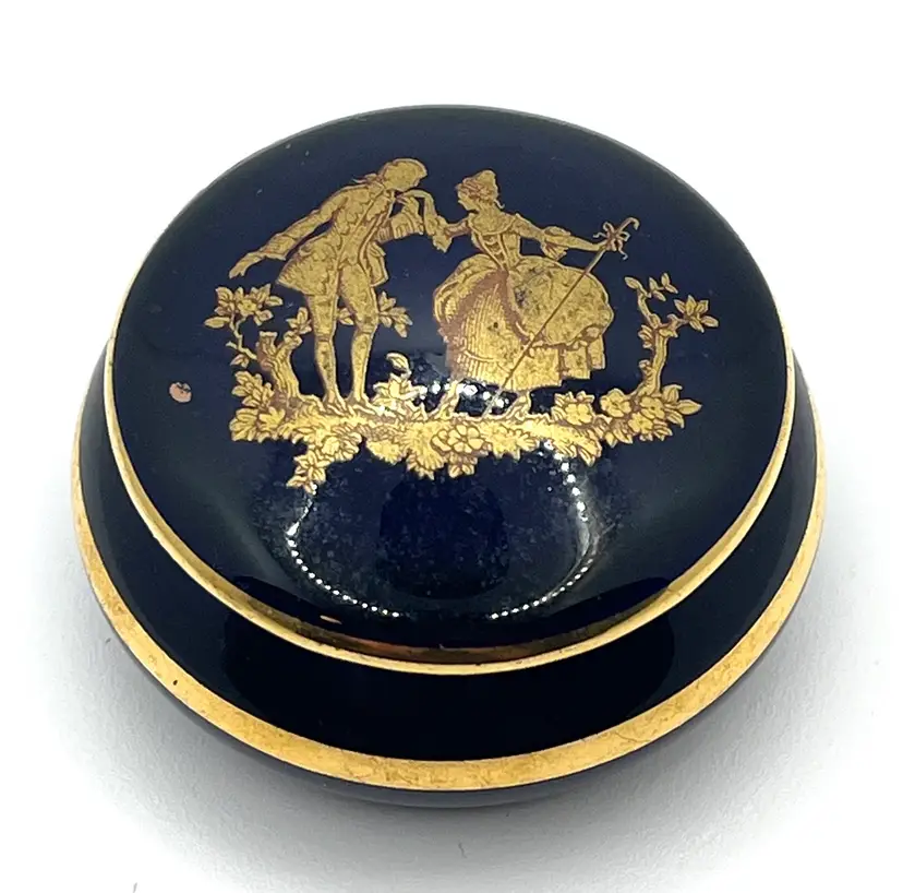 Small 2” cobalt blue Limoges trinket box with gold image on top. Excellent condition. Minor surface wear. No chips or cracks. Made in France.