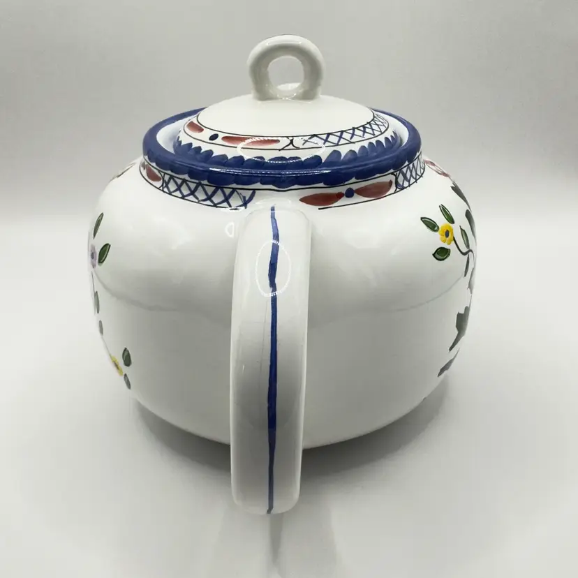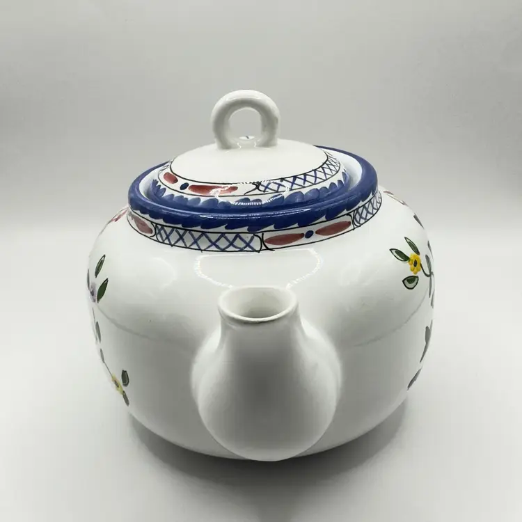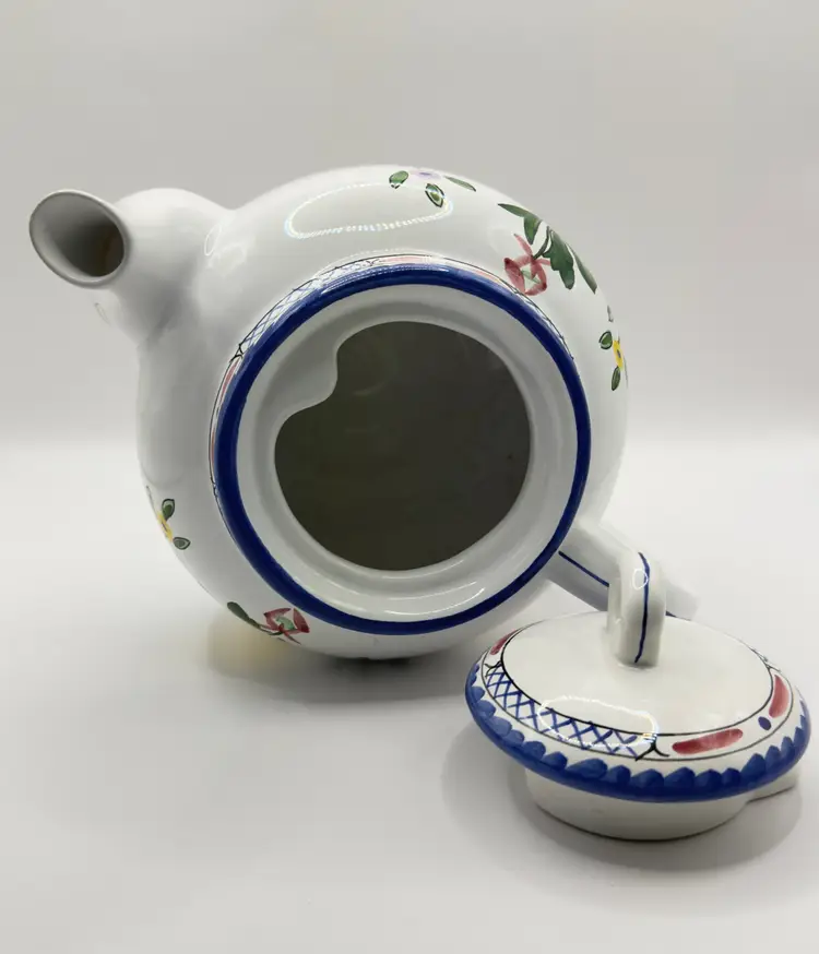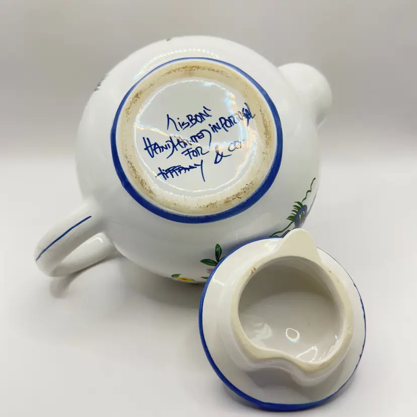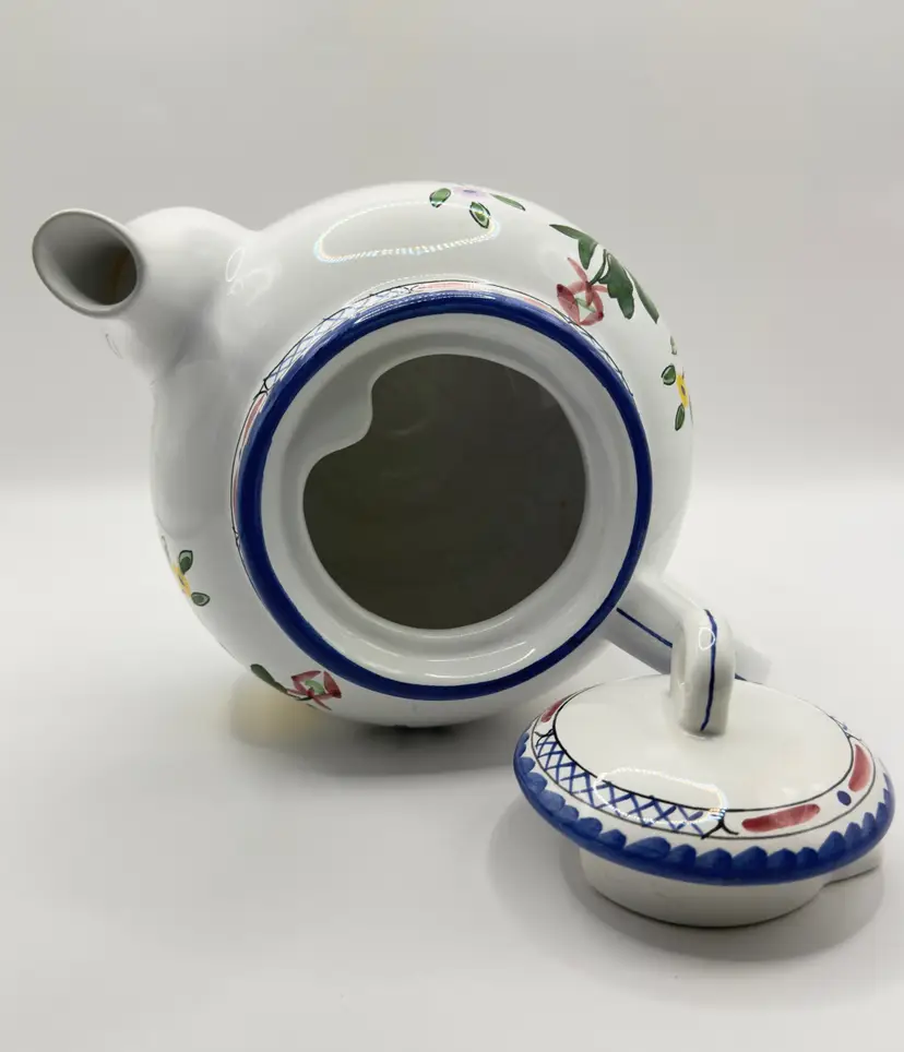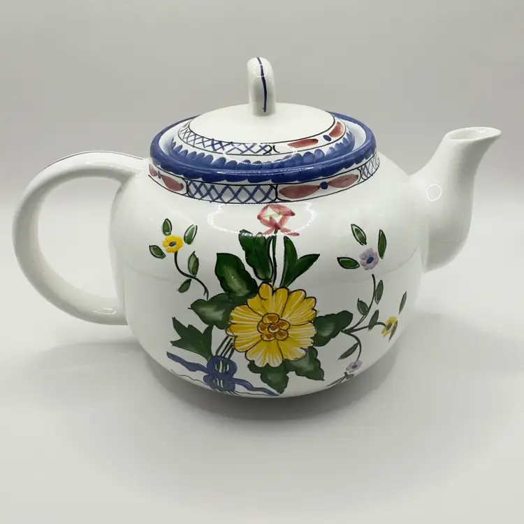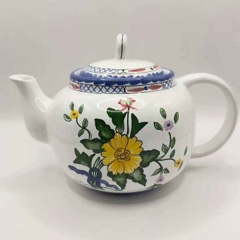Brighten up your tea time with this charming vintage ceramic teapot, featuring a delightful hand-painted floral design. Perfect for serving your favorite brew or as a decorative piece in your kitchen. In excellent condition with no chips or cracks. Measures 5.5x8.5 inches. Weighs 3lbs.