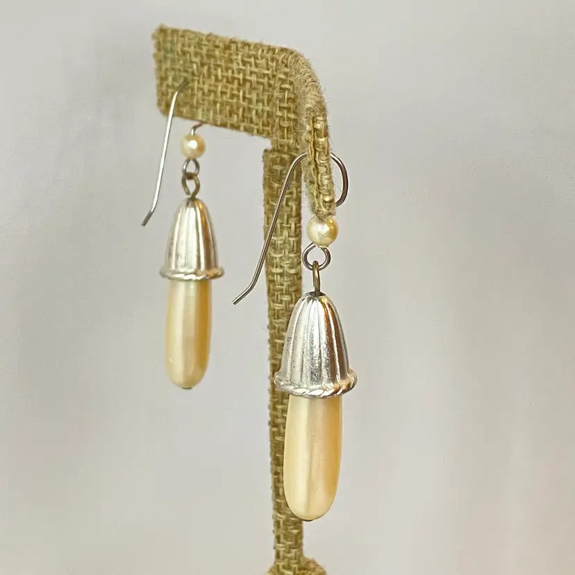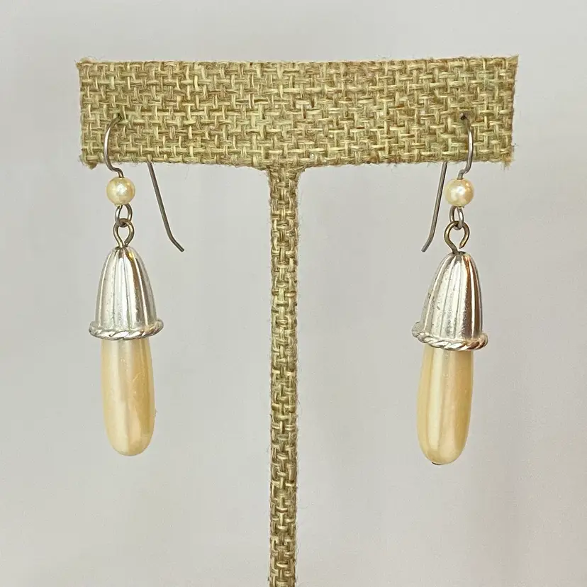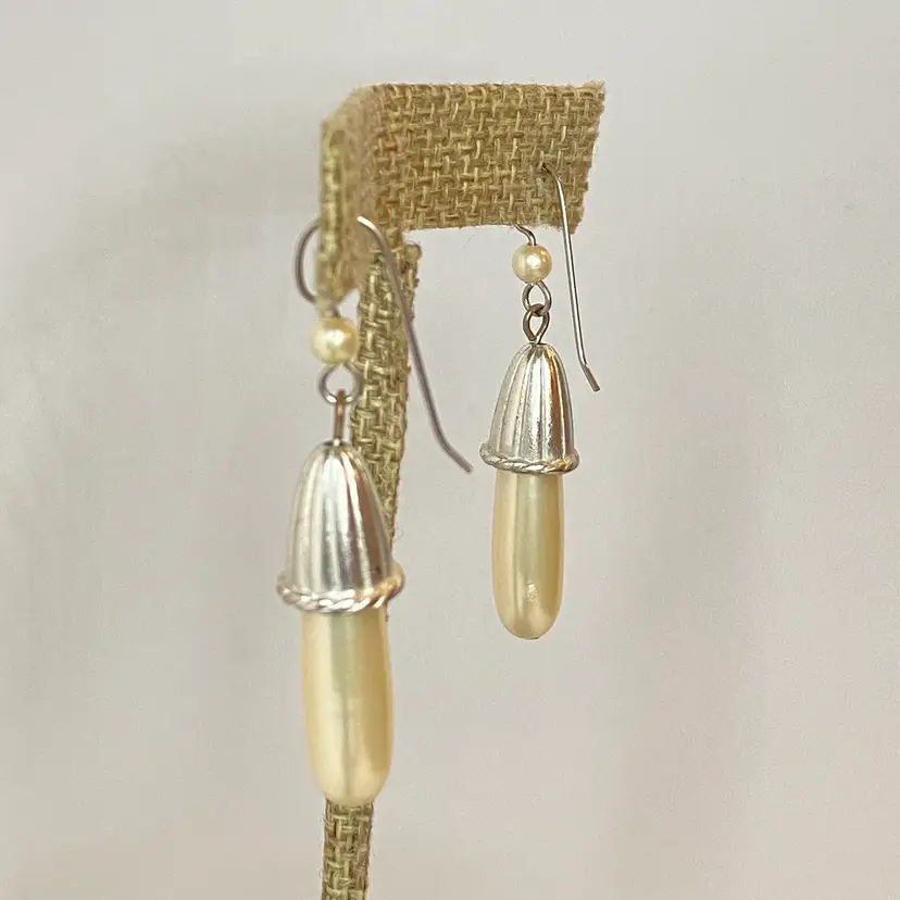 Vintage Long Faux Pearl Silver Metallic Tone Acrylic Dangle Pierced Earrings feature cream colored faux pearls hanging from silver-tone metallic acrylic caps. These earrings are part of a vintage collection, with a retro and bohemian aesthetic, perfect for adding a touch of beauty and artistry to your look.