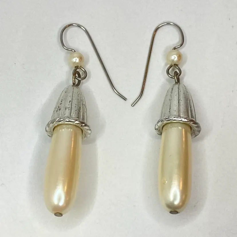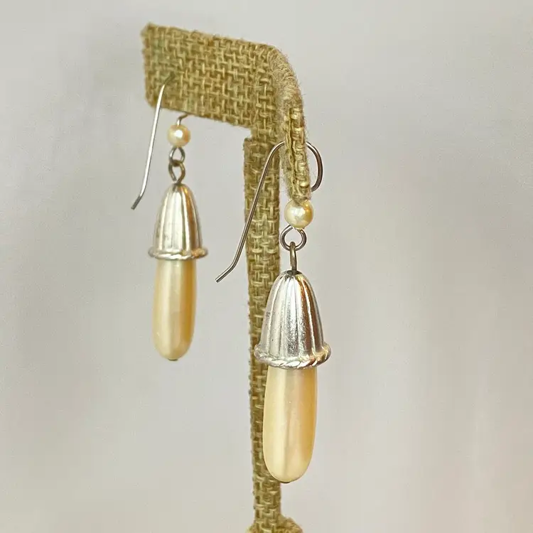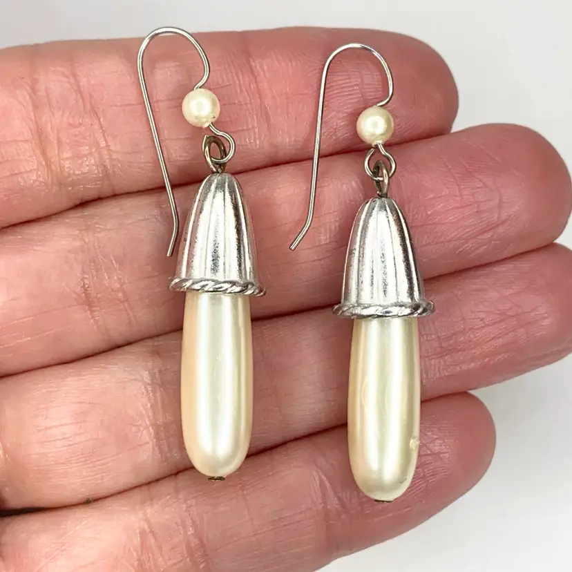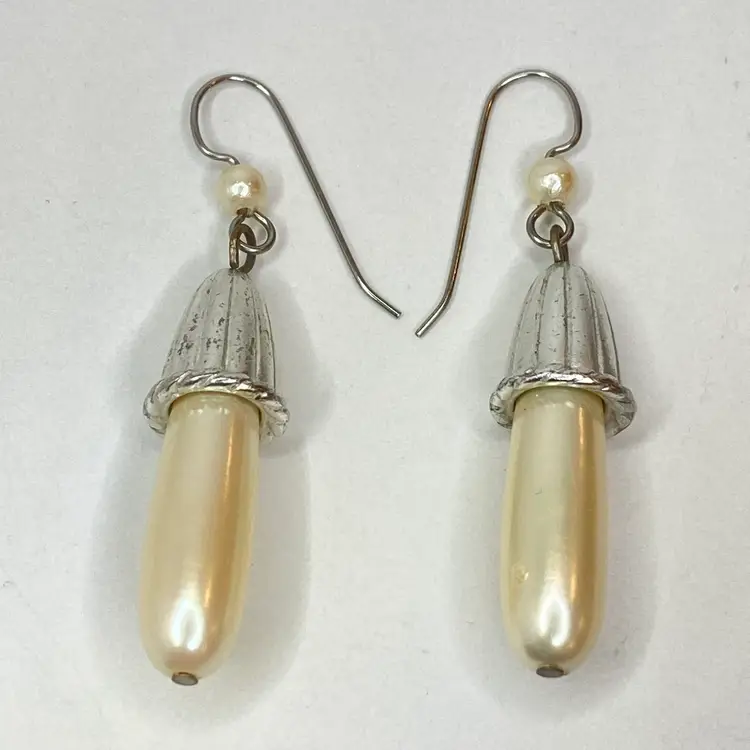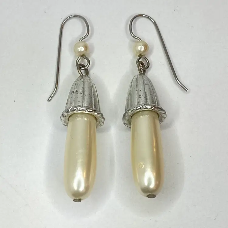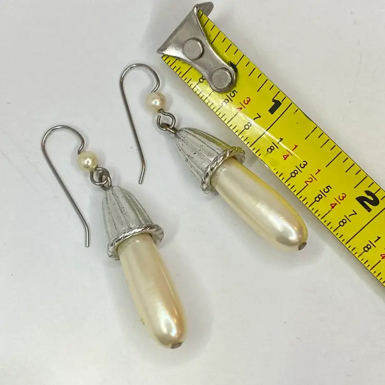 Vintage Long Faux Pearl Silver Metallic Tone Acrylic Dangle Pierced Earrings. Good vintage condition. Please see pictures for more details. SMOKE FREE/PET FREE HOME Approximate measurements: Length- 1.8"