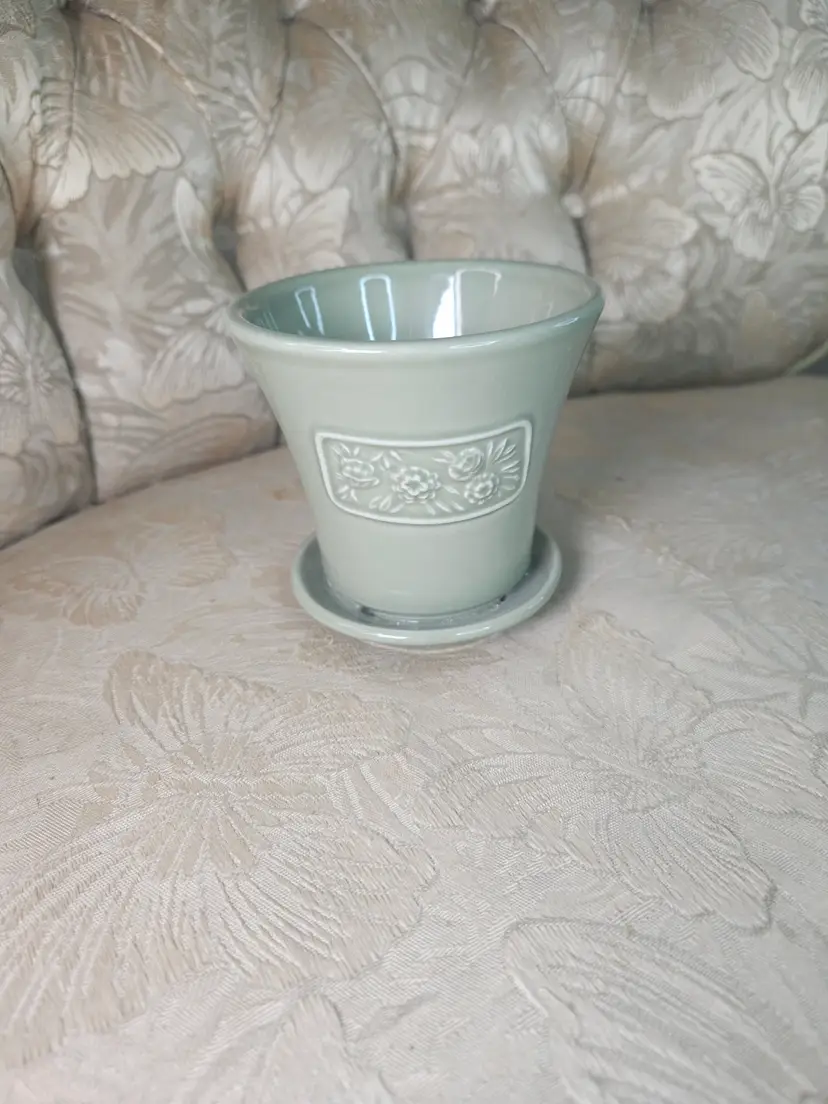 vintage Longaberger 2001 May Series Peony flower pot in sage green with an attached saucer.