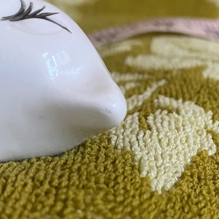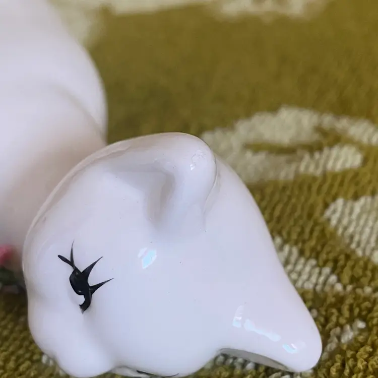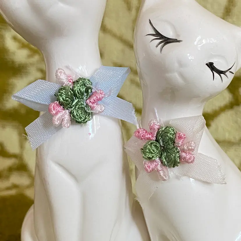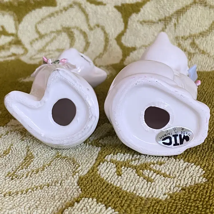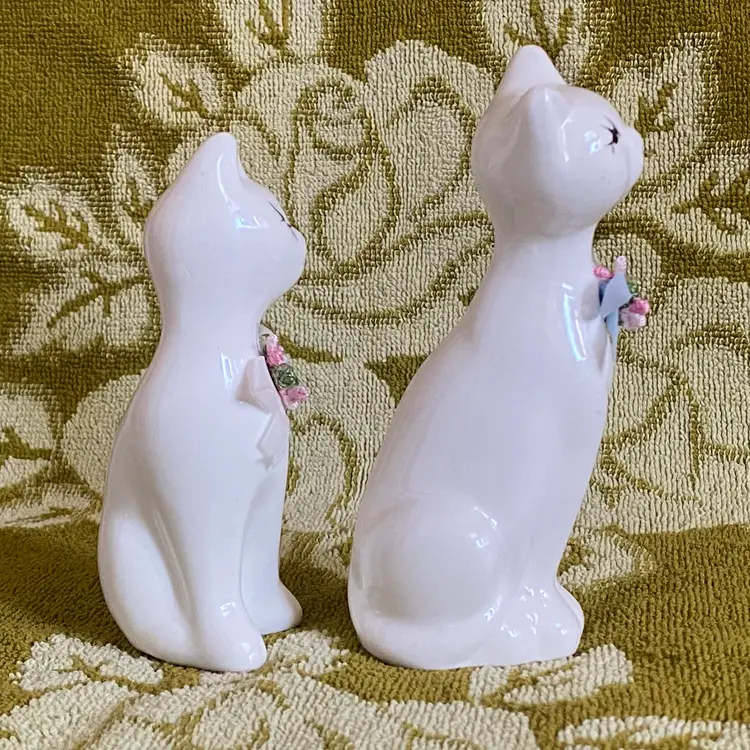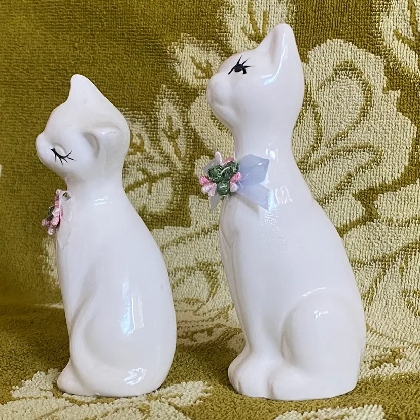 Vintage pair of white porcelain cat figurines with ribbons and embroidered flowers at their necks and pretty painted eyelashes. These are a 1970s reproduction of an original mid-century style. There is a sticker on the bottom of the taller one that says MIC Made in Taiwan. Approximately 5.25" and 4.5" heights. They are both in very good condition. Each has an almost imperceptible glaze chip (not a chip in the porcelain) at the tip of an ear or both ears. No cracks, no crazing in the glaze.