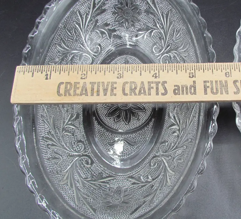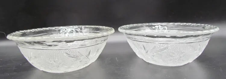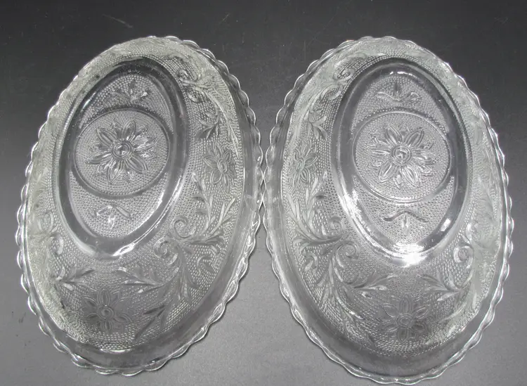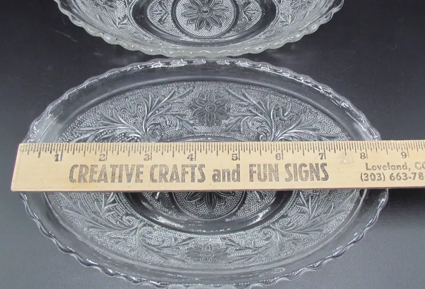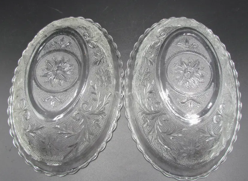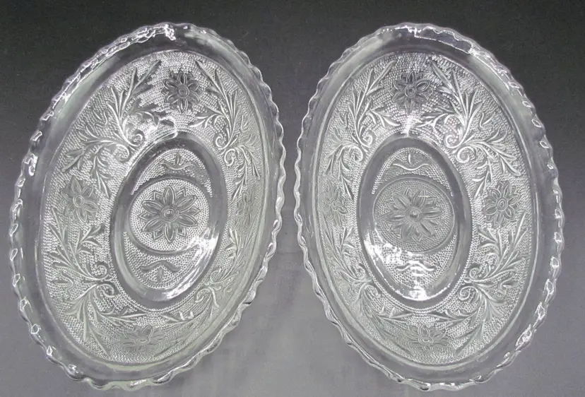 Set of two clear glass bowls from Anchor Hocking's Tiara Sandwich Glass line. These mid-century modern inspired bowls feature a unique scalloped oval shape and a delicate flower theme. Measuring approximately 9 inches in length and 5.5 inches in width they are stackable and have no chips or cracks.