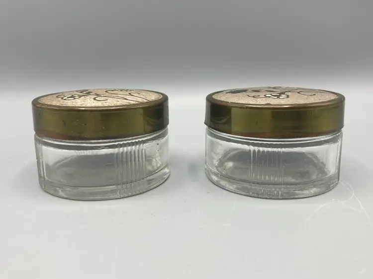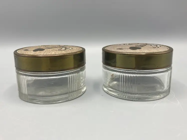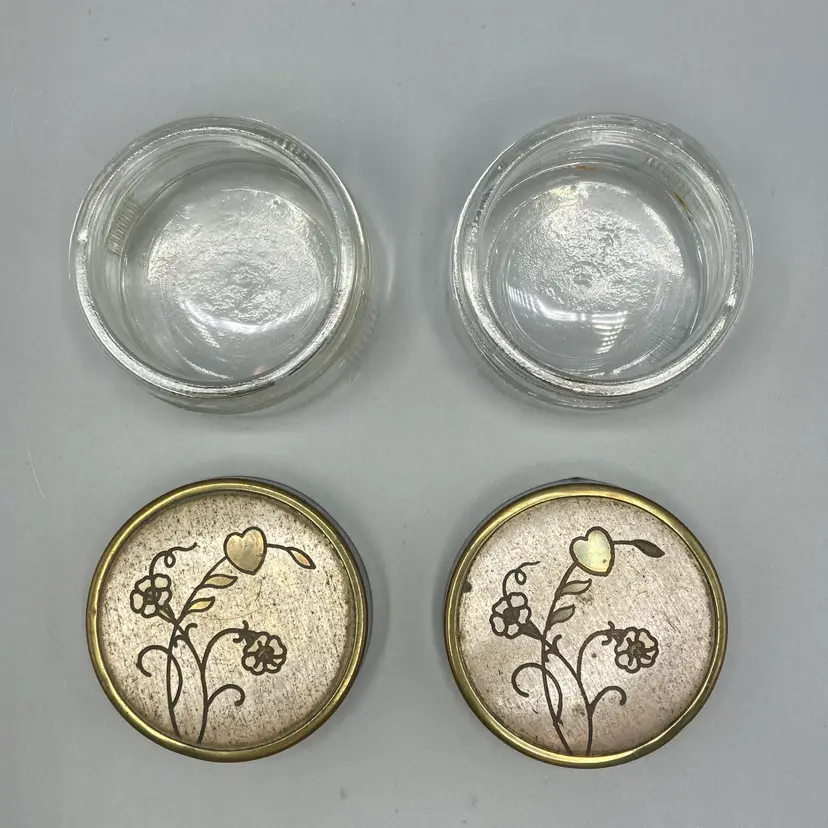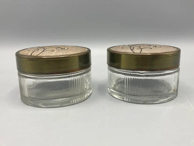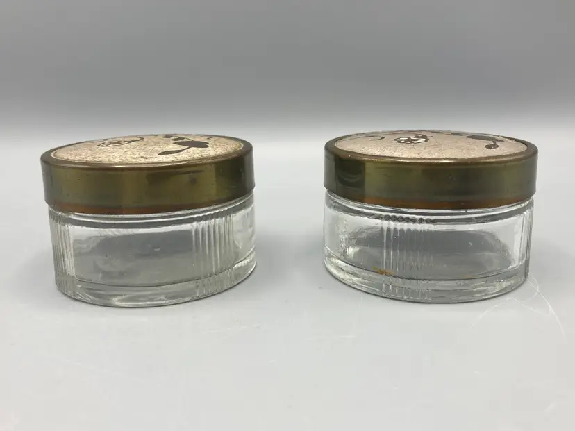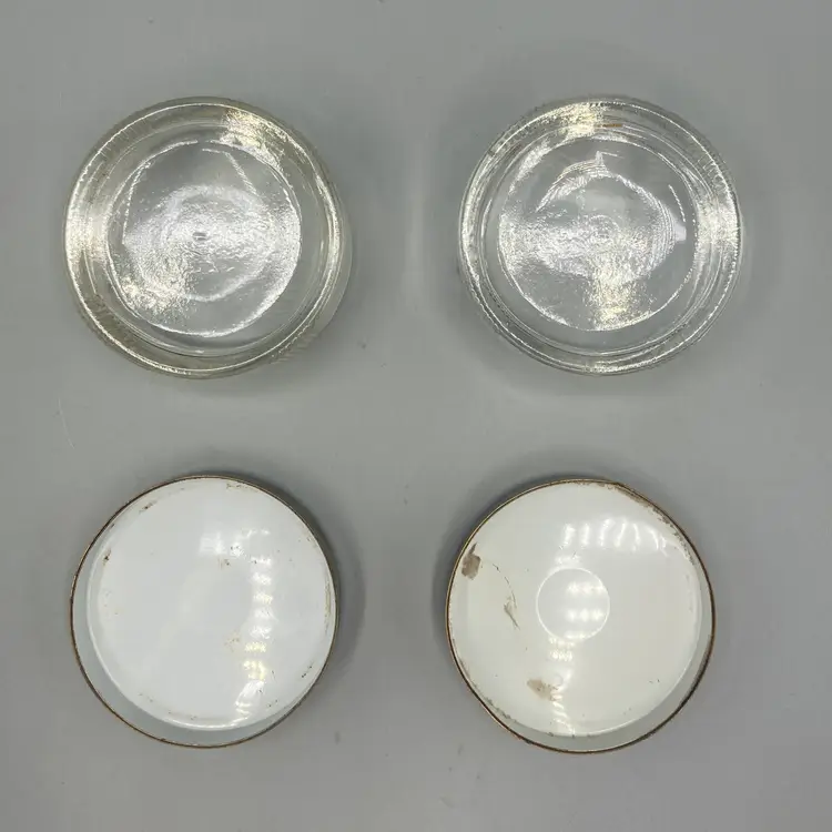 The containers are in good condition; there is some discoloration on the undersides of the lids. And please note the lids do not screw on to the base, they just sit on the base. Each measure approximately 1 1/2" tall x 2 1/4" across.