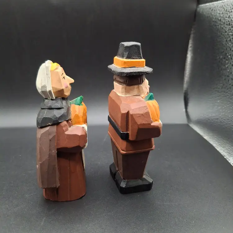 Once upon a time, in a land of bountiful harvests, these charming pilgrim figurines found their way into homes with tales of gratitude. Each figure, carved with care and painted with warm autumn hues, tells a story of Thanksgiving. They hold pumpkins, symbolizing abundance, and invite you to celebrate the harvest season's joy and togetherness.
