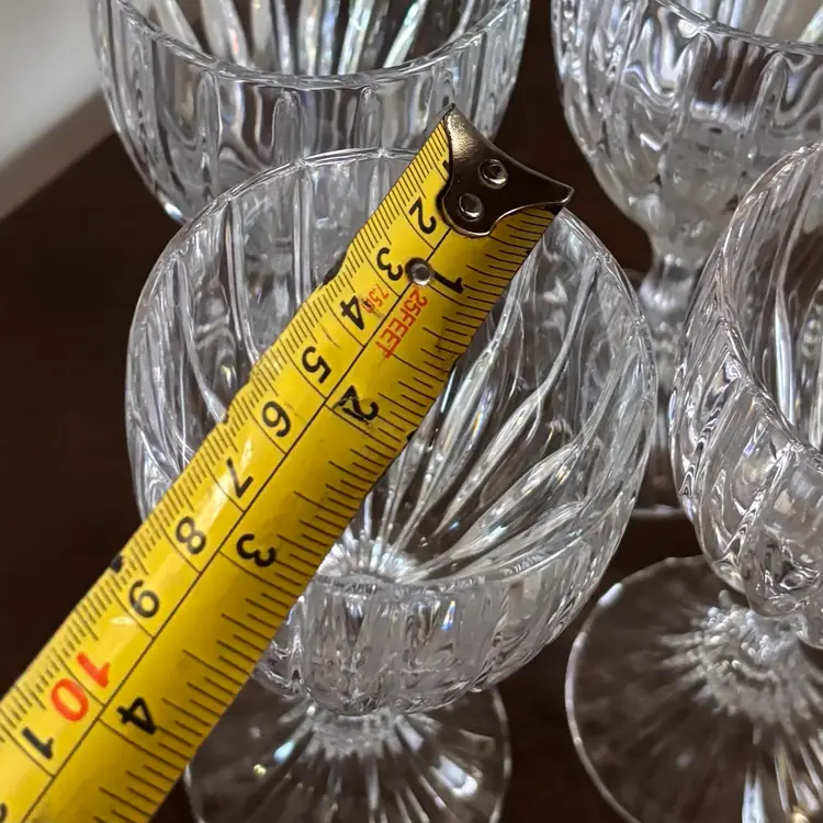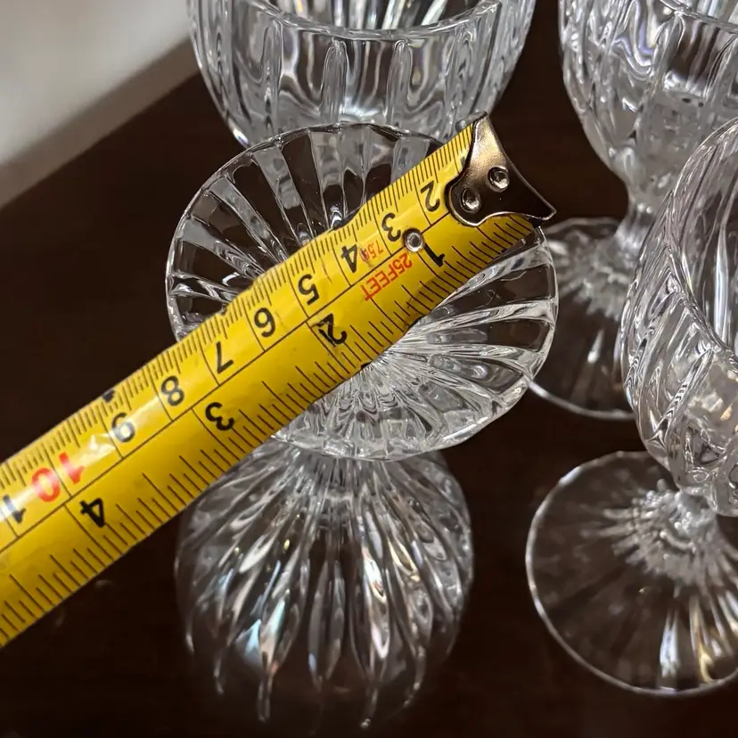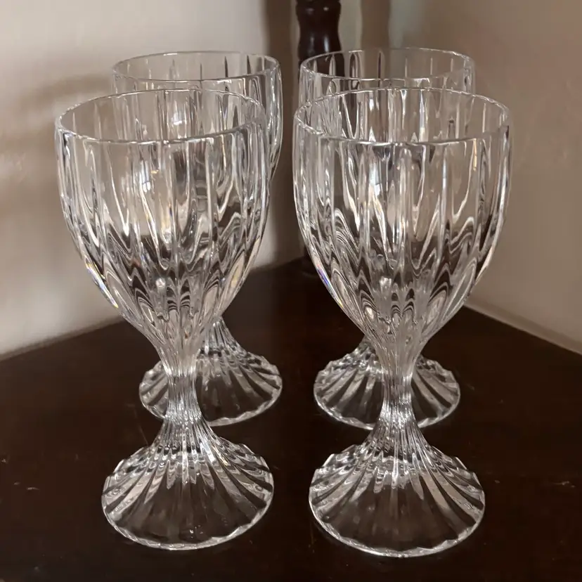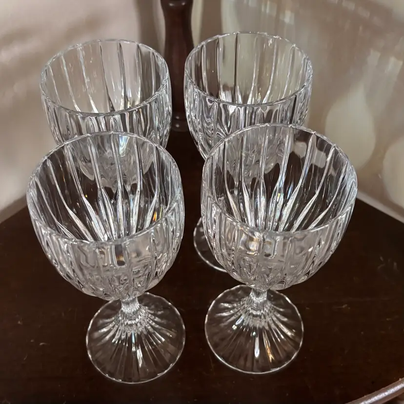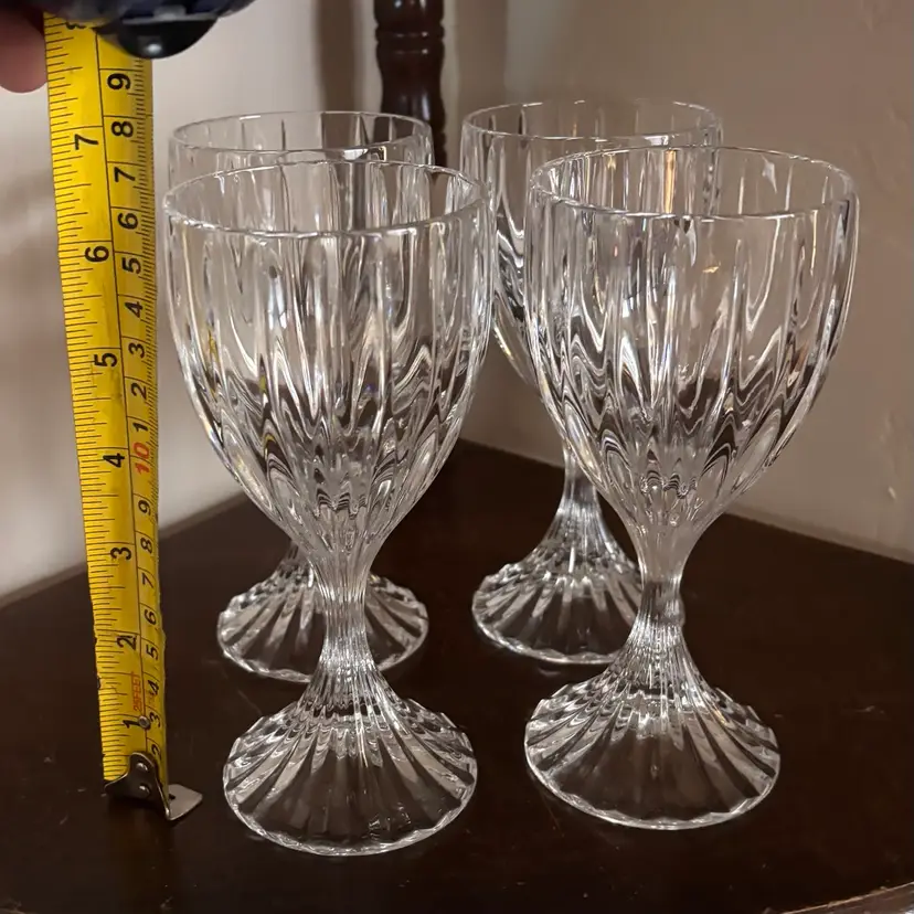 Gorgeous set of four wine glasses 6 1/2”tall x 3”wide at top Vintage wear as shown- no chips or cracks Perfect condition!