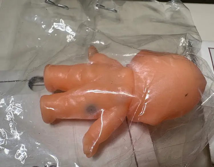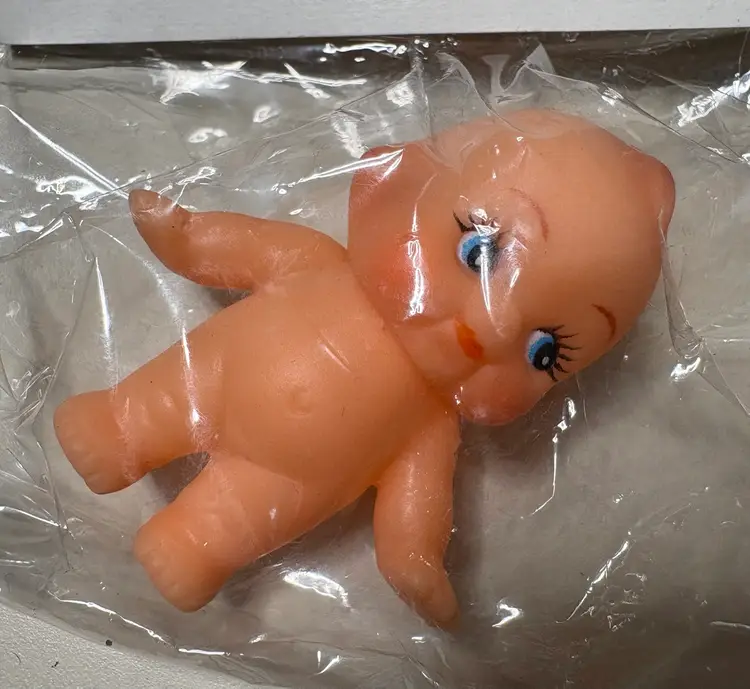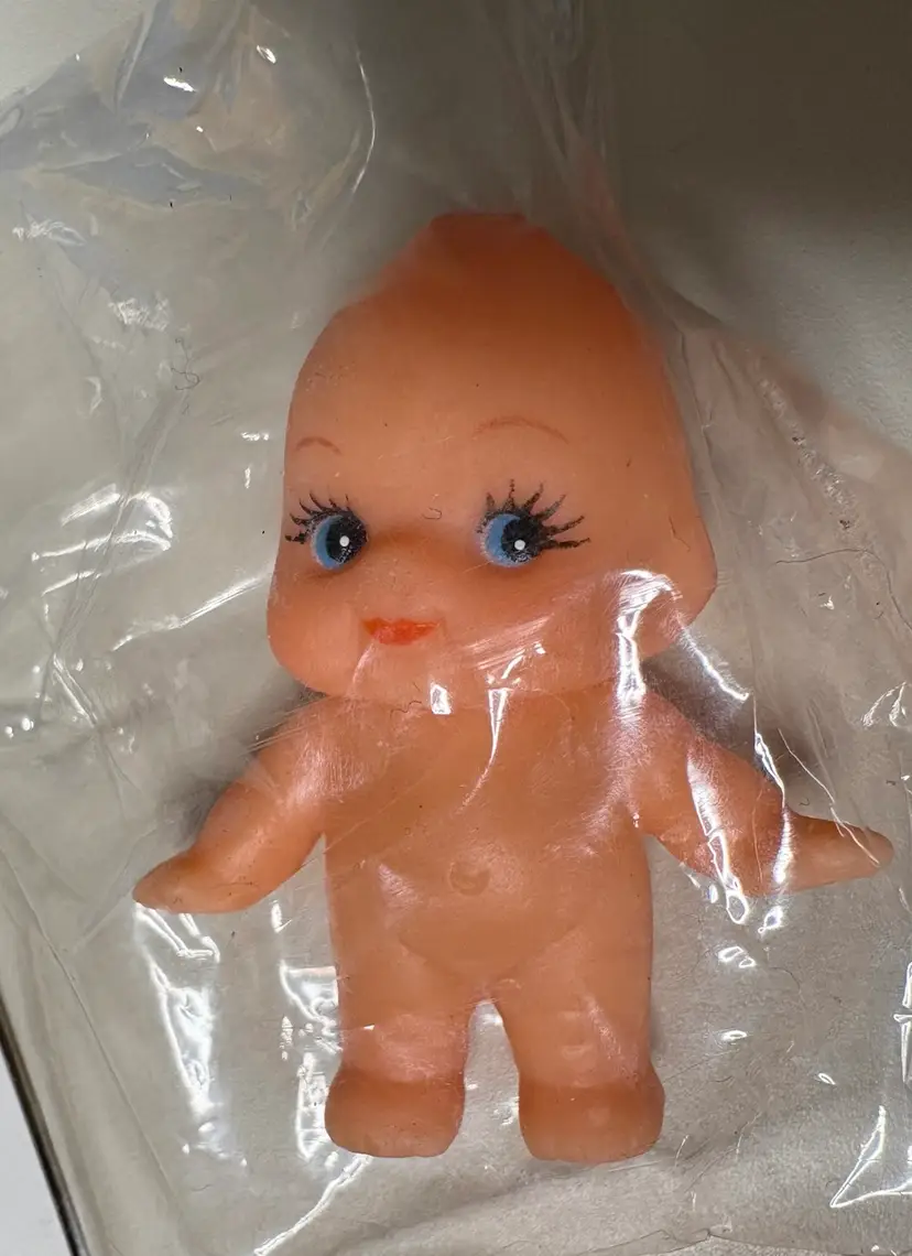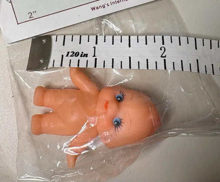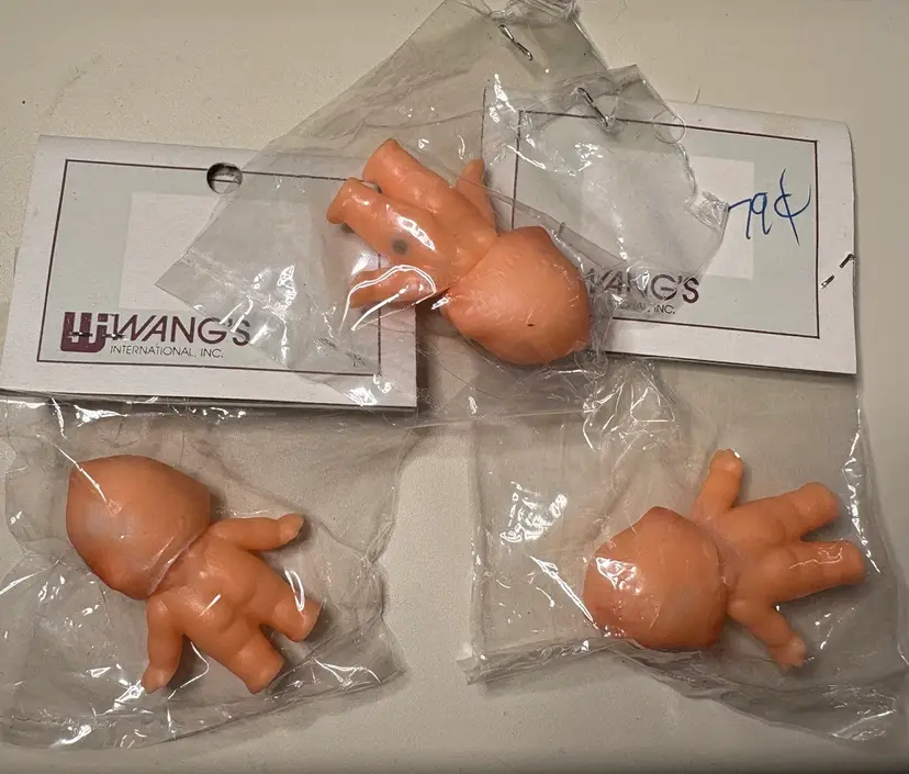 Three mini dolls, plastic-rubber material. In original packaging. One label card is missing. Some discoloration on the back of the dolls. Perfect for crafting and assemblages. 2”H