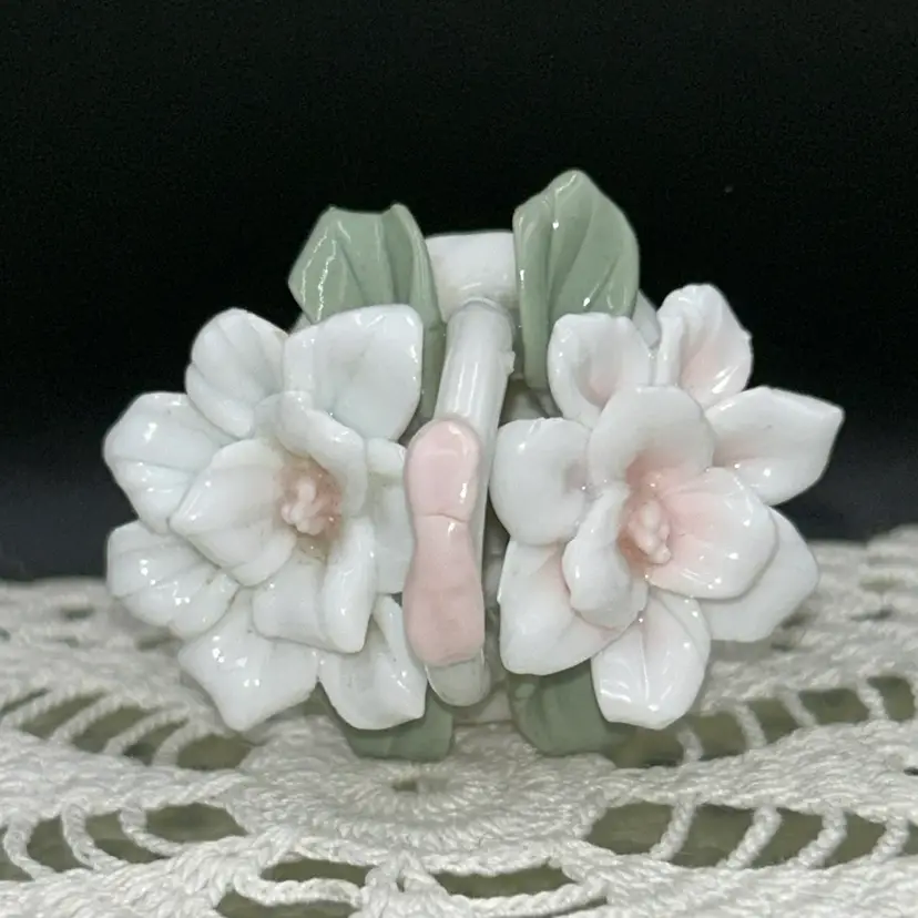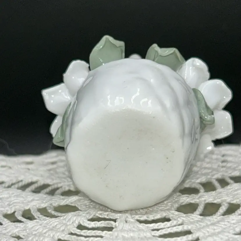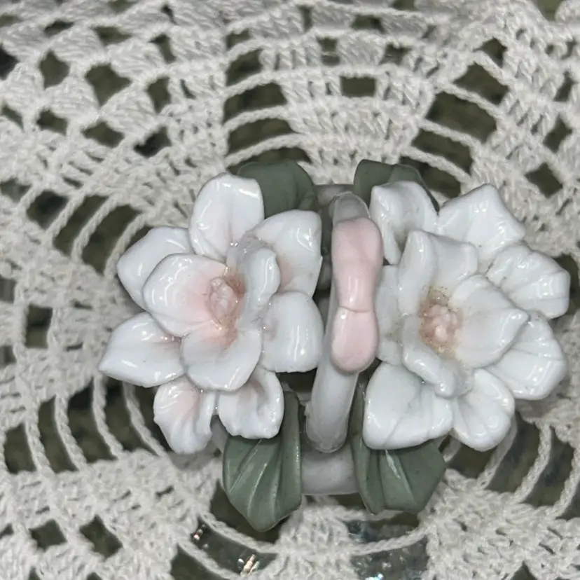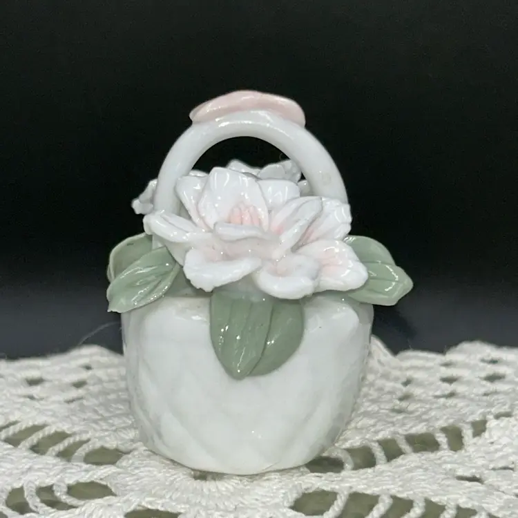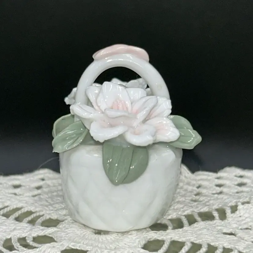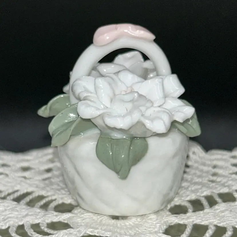 2” tall x 3@ long x 1.75” wide. Beautiful bow on handle. Pale pink and white gardenias with soft green leaves. Entire piece is in excellent shape. No chips or cracks. Unmarked.
