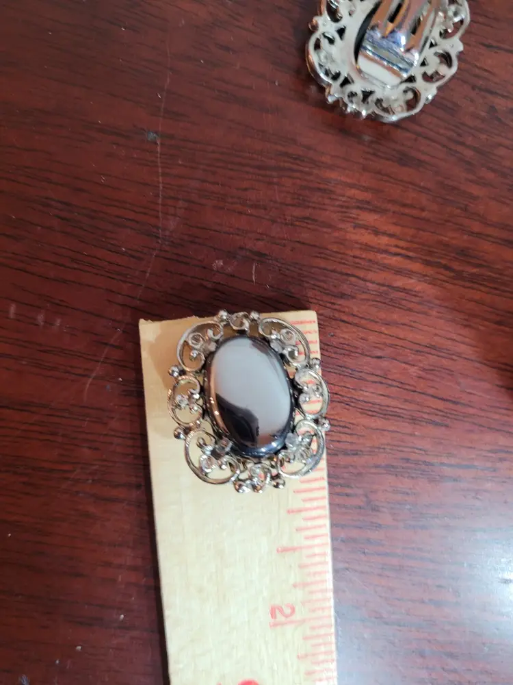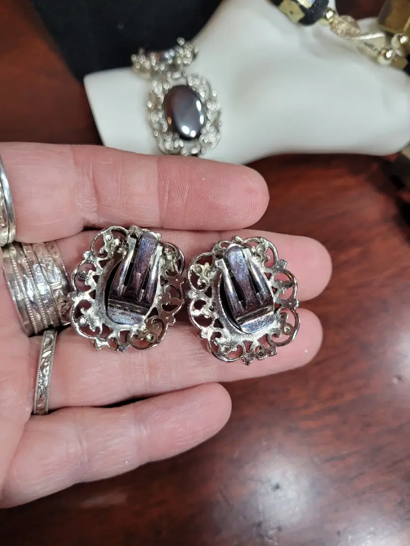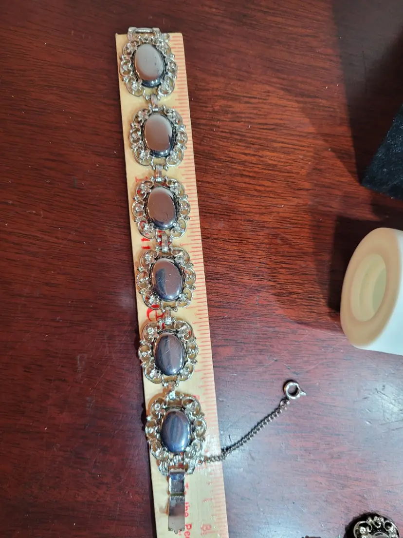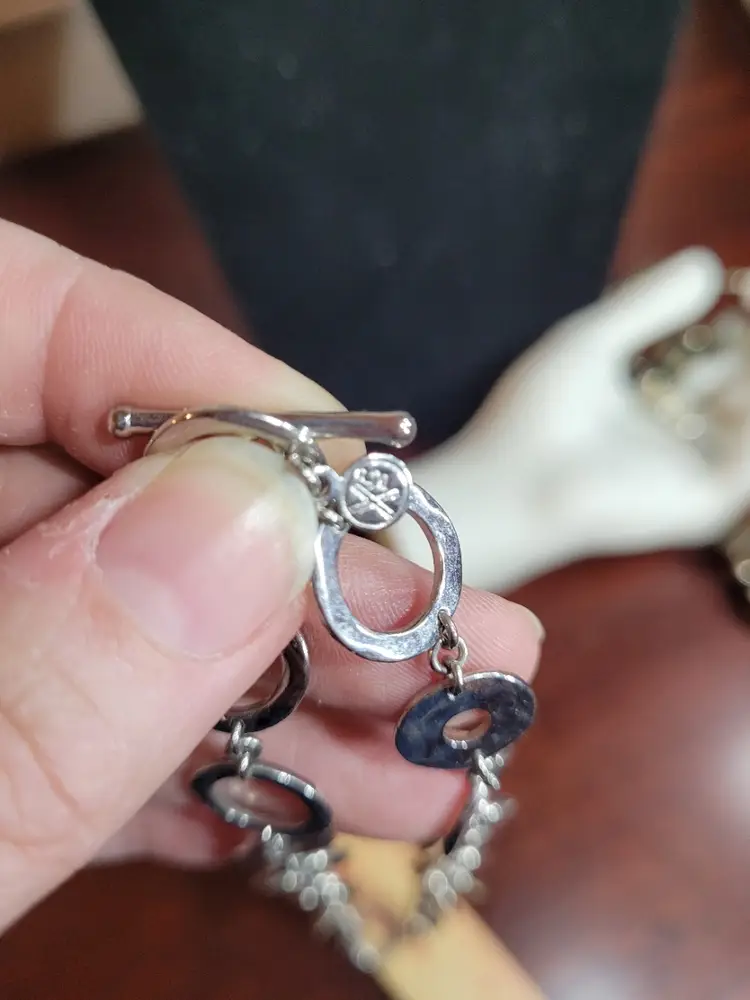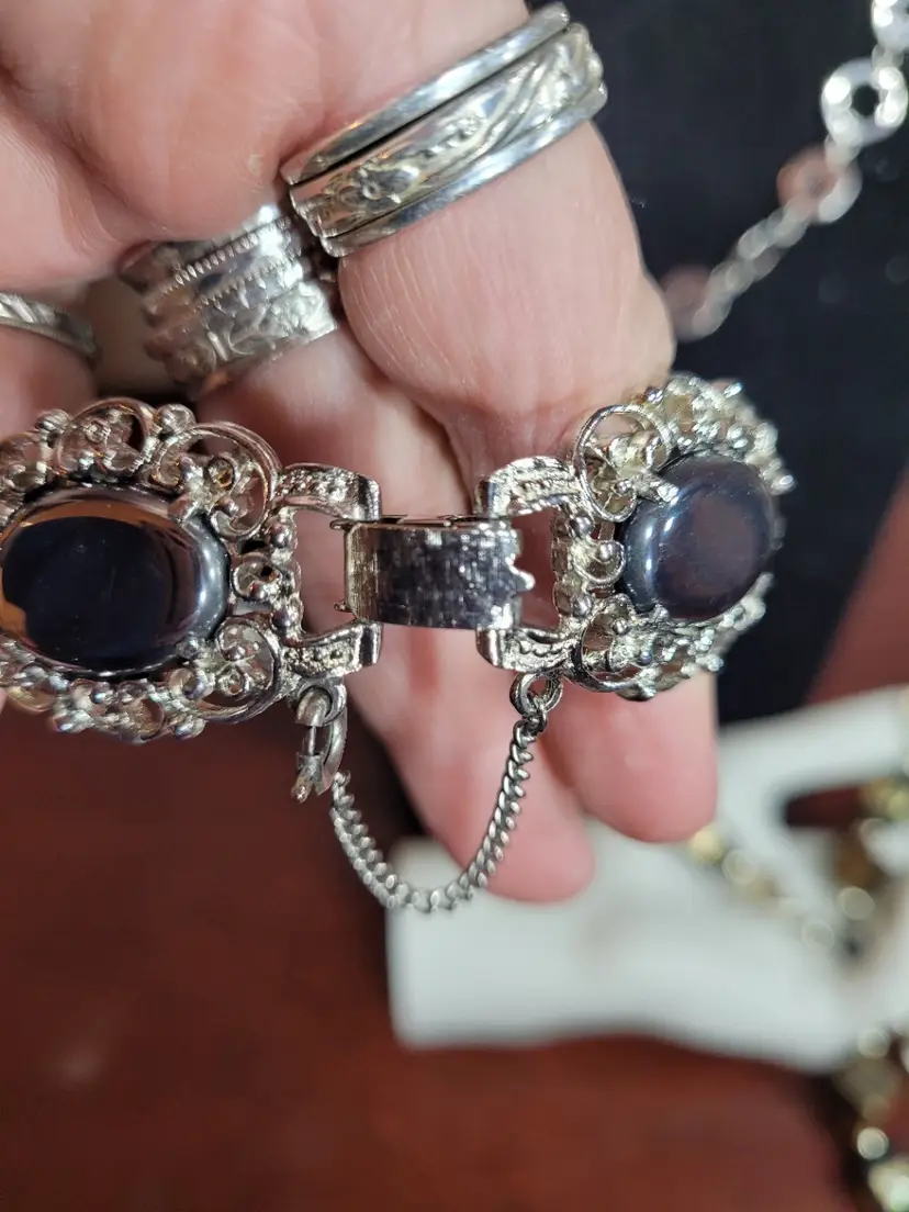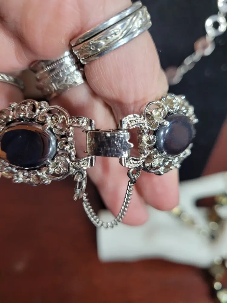 This lot includes 2 necklaces a bracelet and clip on earring set. The bracelet and earrings are not marked but do match with silver tone and mirror/glass pieces. The bracelet is heavy with a fold over clasp and safety chain. The earrings MATCH and are CLIP ON Earrings are about 1 inch in length. Bracelet is 7 inches in length. Also included is a lovely silver tone loop chain that has a mark on it I have no been able to identify. It is NOT flimsy. It is about 17 inches in length with a toggle clasp. The last necklace has no clasp, but had various metal beads as well as shell in black, silver and gold tones. It appears to be on a cord, but is very well made. All pieces are included in this LOT.