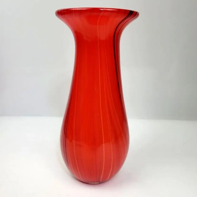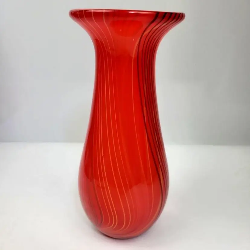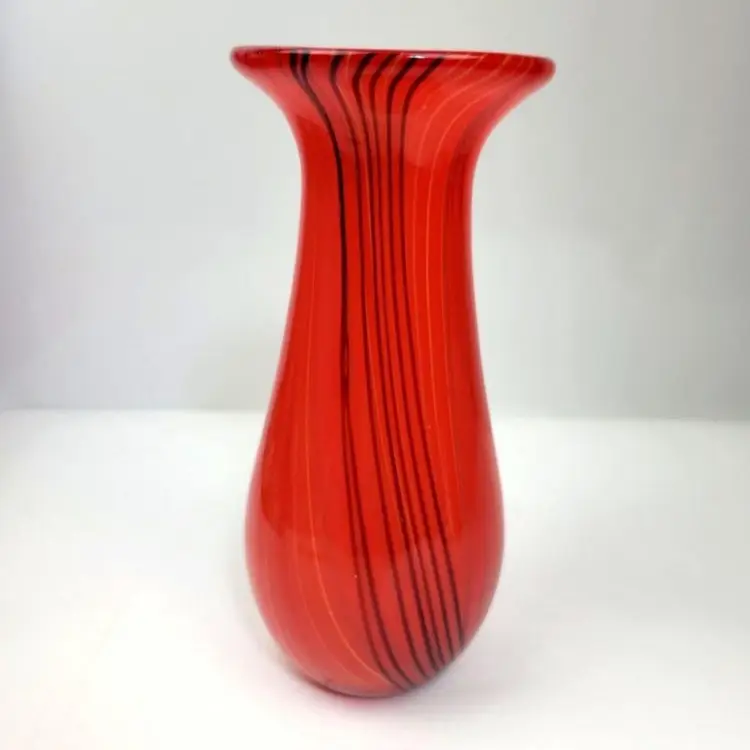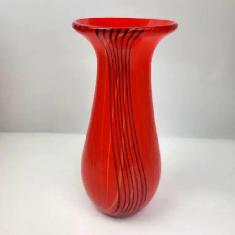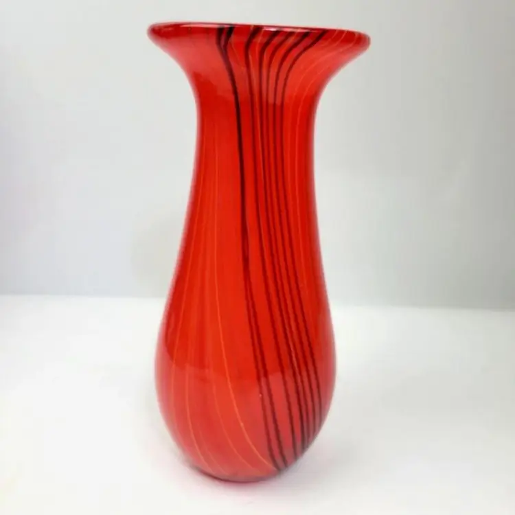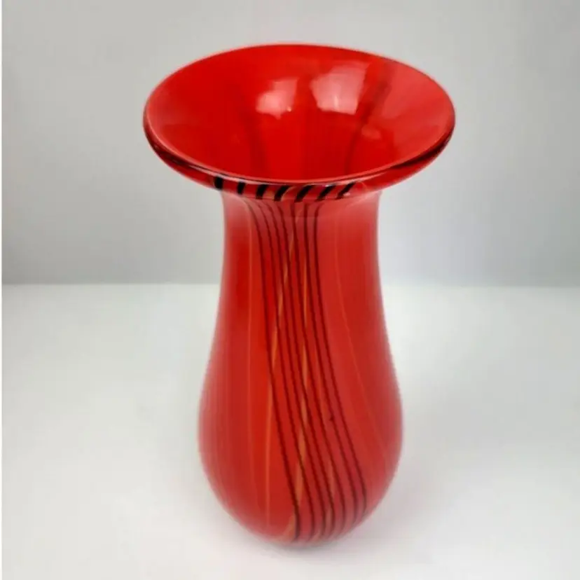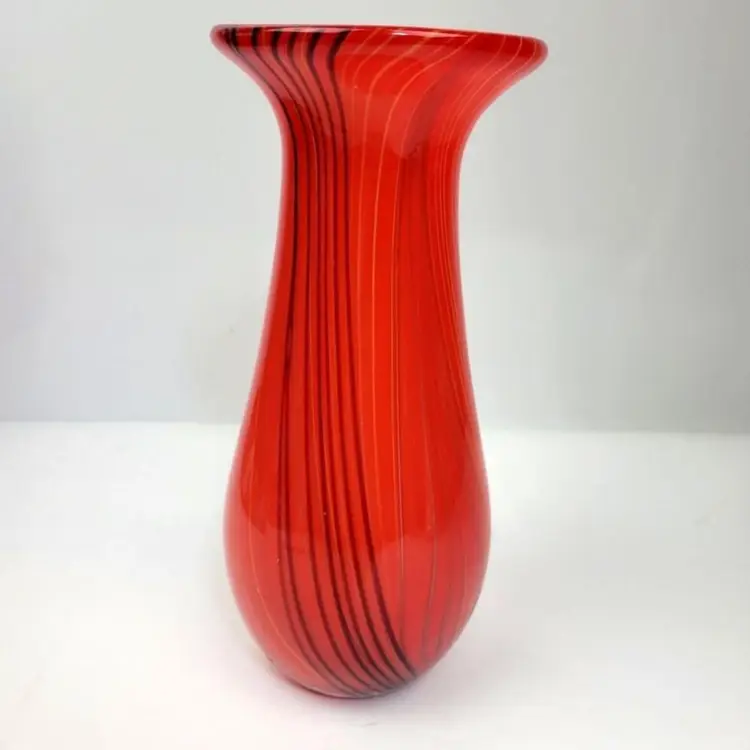 Vintage Art Glass Vase Red w/ Orange & Black Stripe Swirl Design 10"