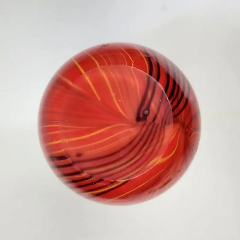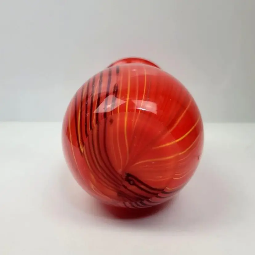 Stunning vintage hand blown Art Glass Vase. The beautiful deep red/blood orange color is accented with black and light yellow-orange striped lines in a swirl pattern design to create a mesmerizing effect that will captivate any collector's eye. Finely polished pontil.