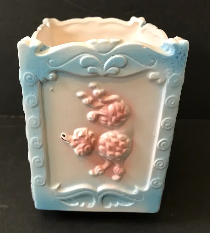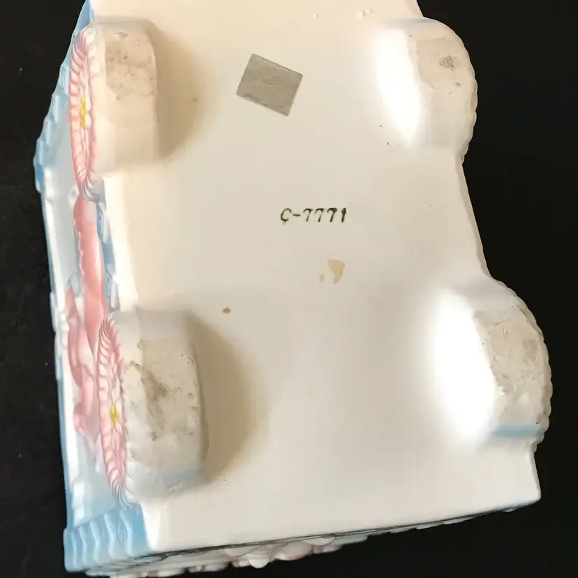 The Vintage Napco Nursery Pastel Circus Train Car Elephant Pony Ceramic Planter is a charming 1950s style nursery decor item perfect for a baby shower. Hand-painted in pastel colors and featuring a cute circus train car design with elephant and pony characters, this small ceramic planter is a whimsical addition to any nursery. Made in Japan, this piece showcases a satin-finished cube shape and is suitable for decorating both boys and girls' rooms. With its unique design and vintage appeal, this planter adds a touch of nostalgia to any space. No chips or cracks