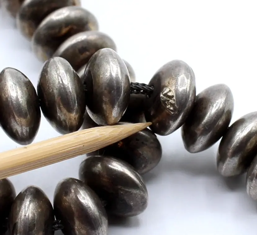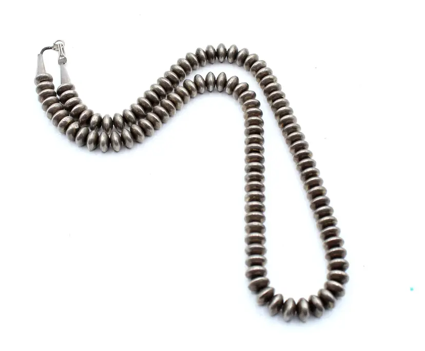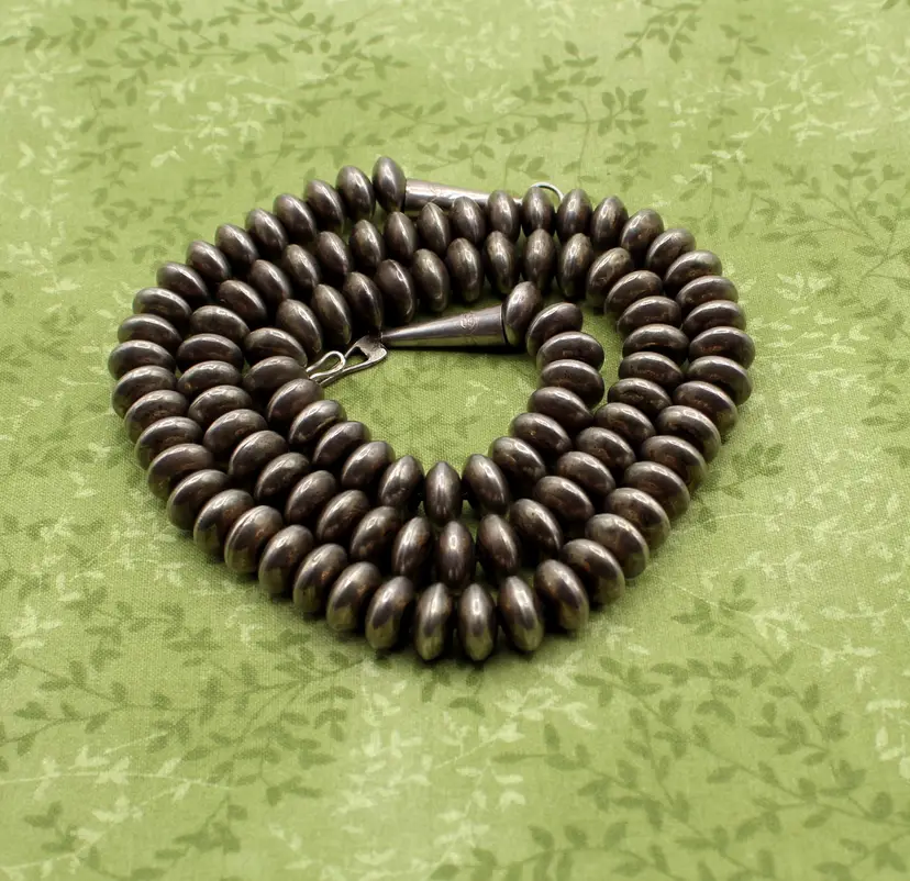 Fantastic unsigned bench beaded Native 10mm necklace. Stamped cones but not hallmark. There is one bead that has an imperfection of some left over silver creating a little bump or maybe it is a signature bead? The necklace measures 25" end to end and wearable 22.5". It is strung on a foxtail chain.